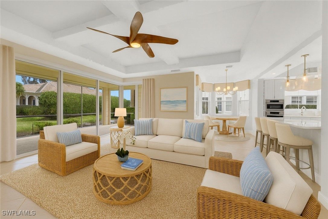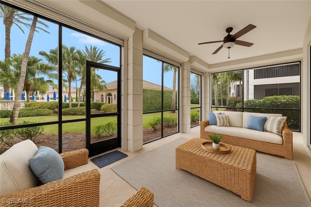 Nestled in the prestigious Vineyards community, this stunning 1st Floor PARTIALLY FURNISHED Coach Home in the exclusive Avellino Isles enclave is the epitome of elegance and modern comfort. Featuring three spacious, all-en-suite bedrooms with private baths, a den and a total of 3 1/2 baths, this condo offers the perfect blend of functionality and luxury. Step into the exquisite foyer, where attention to detail becomes immediately evident, with large ceramic tile and luxury vinyl plank flooring that flow seamlessly throughout the home, and all walls are freshly painted. New lighting features beautifully illuminate the home. The split-bedroom layout provides privacy, while the dedicated office, complete with custom French doors, offers a quiet retreat for work or study. The heart of the home is a beautifully designed kitchen featuring stainless steel appliances, quartz countertops, a breakfast bar, and a separate dining area. Adjacent to the kitchen, the expansive great room impresses with a built-in bar and beverage cooler, perfect for entertaining. A zero-edge slider is the finishing touch to the great room and opens effortlessly to the large screened lanai, where entertaining meets relaxation. The primary suite is a true sanctuary, with volume ceilings, custom cabinetry in the oversized walk-in closet, and a luxurious master bath featuring dual sinks, a separate tub and shower, and private water closet. The screened lanai is equipped with electric storm shutters for peace of mind, while the home’s impact-resistant doors and windows provide added security. A 2025 newly tiled roof, freshly painted exterior, and brand new landscaping create a beautiful curb appeal. Additional features include a whole-house surge protector, a Halo allergy system on the AC, room darkening shades in all bedrooms, a 70 gallon Hot Water Heater, Trane smart home control system and a security system. Enjoy the convenience of a two-car attached, side entry garage and the exceptional amenities just steps away, including the Avellino Isles clubhouse, exercise facility, and resort-style pool and spa. The expansive pool deck, equipped with grills and a bar area, is perfect for hosting gatherings—all included in your HOA fees. Centrally located, this property is minutes from Naples’ pristine beaches, world-class shopping, fine dining, Mercato, and easy access to I-75. This home is a rare find in a lush, sought-after community where luxury and convenience come together seamlessly. Additionally, Vineyards offers optional golf and social memberships to take advantage of their newly redesigned award winning golf course, resort style pools, clubhouse, restaurant/bar and exceptional exercise and spa facility. This Coach home is a must see!