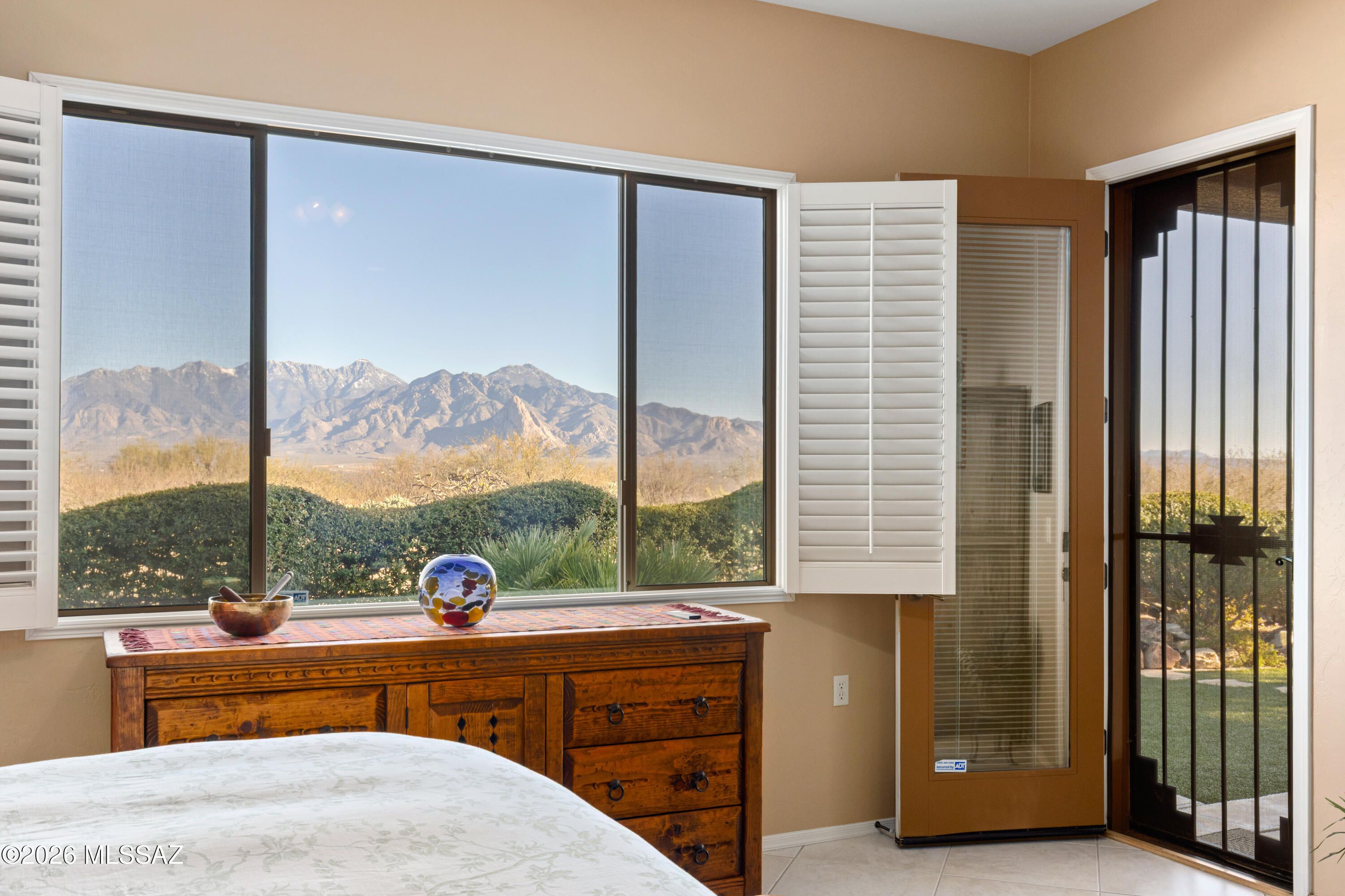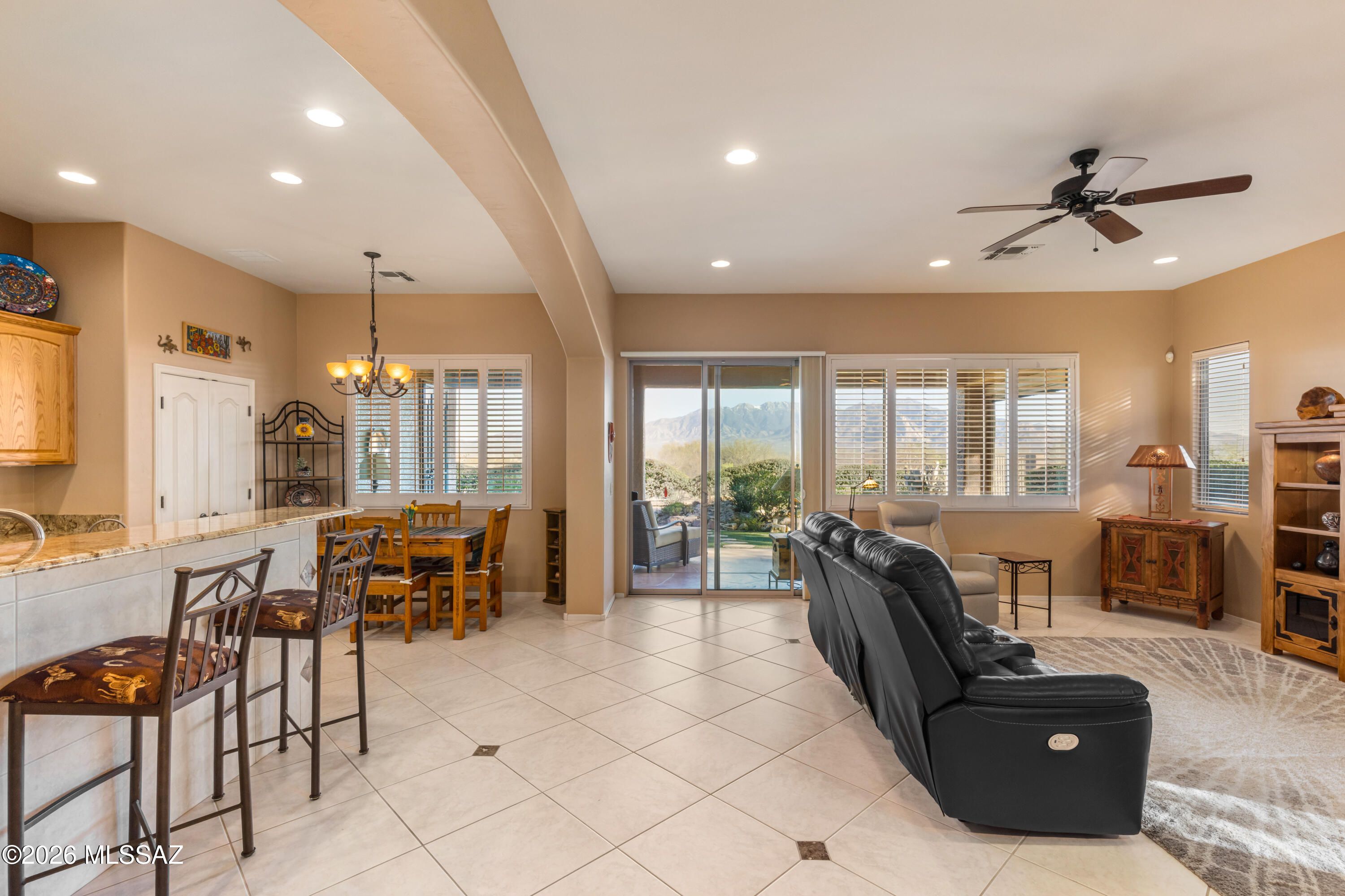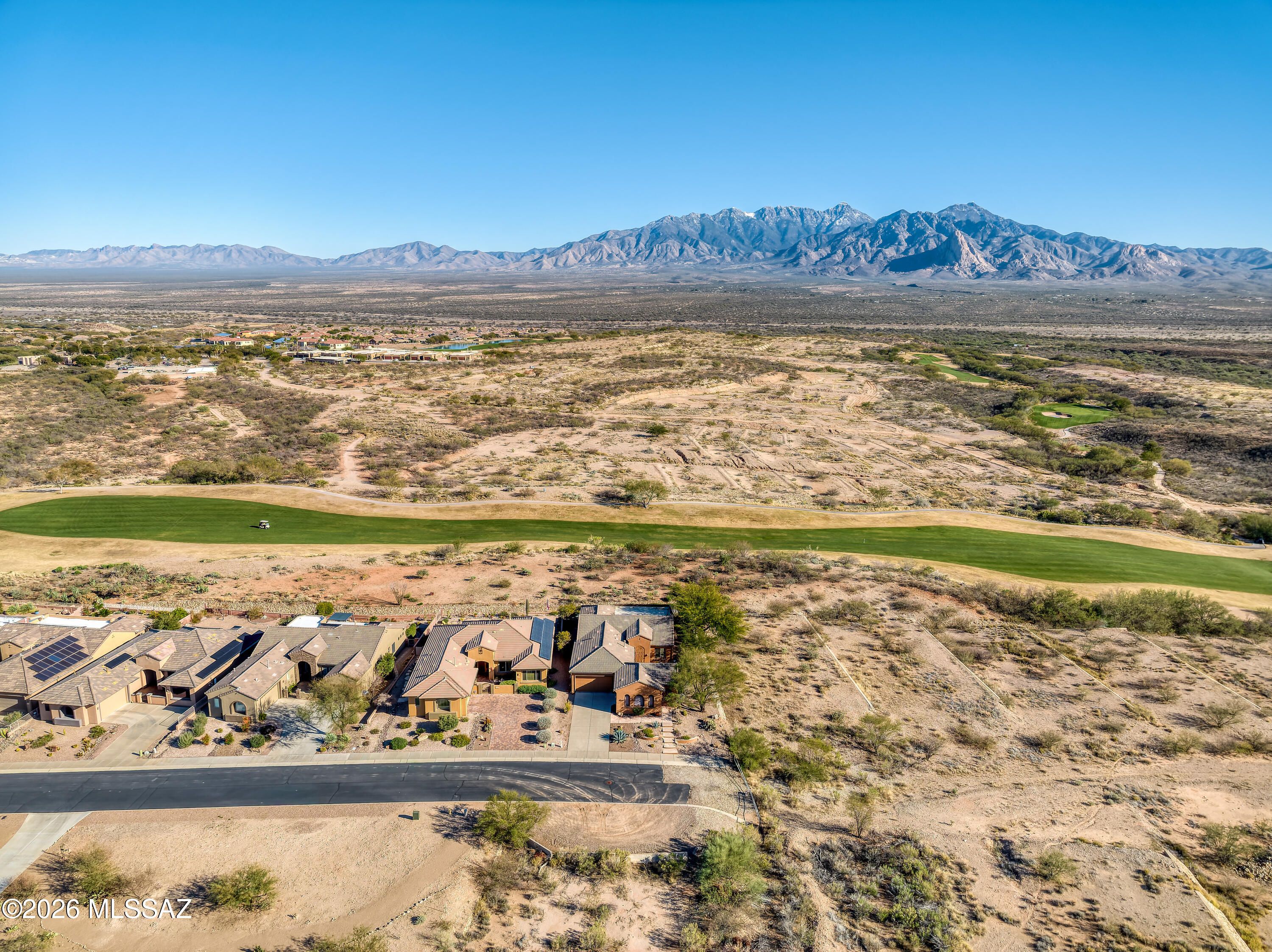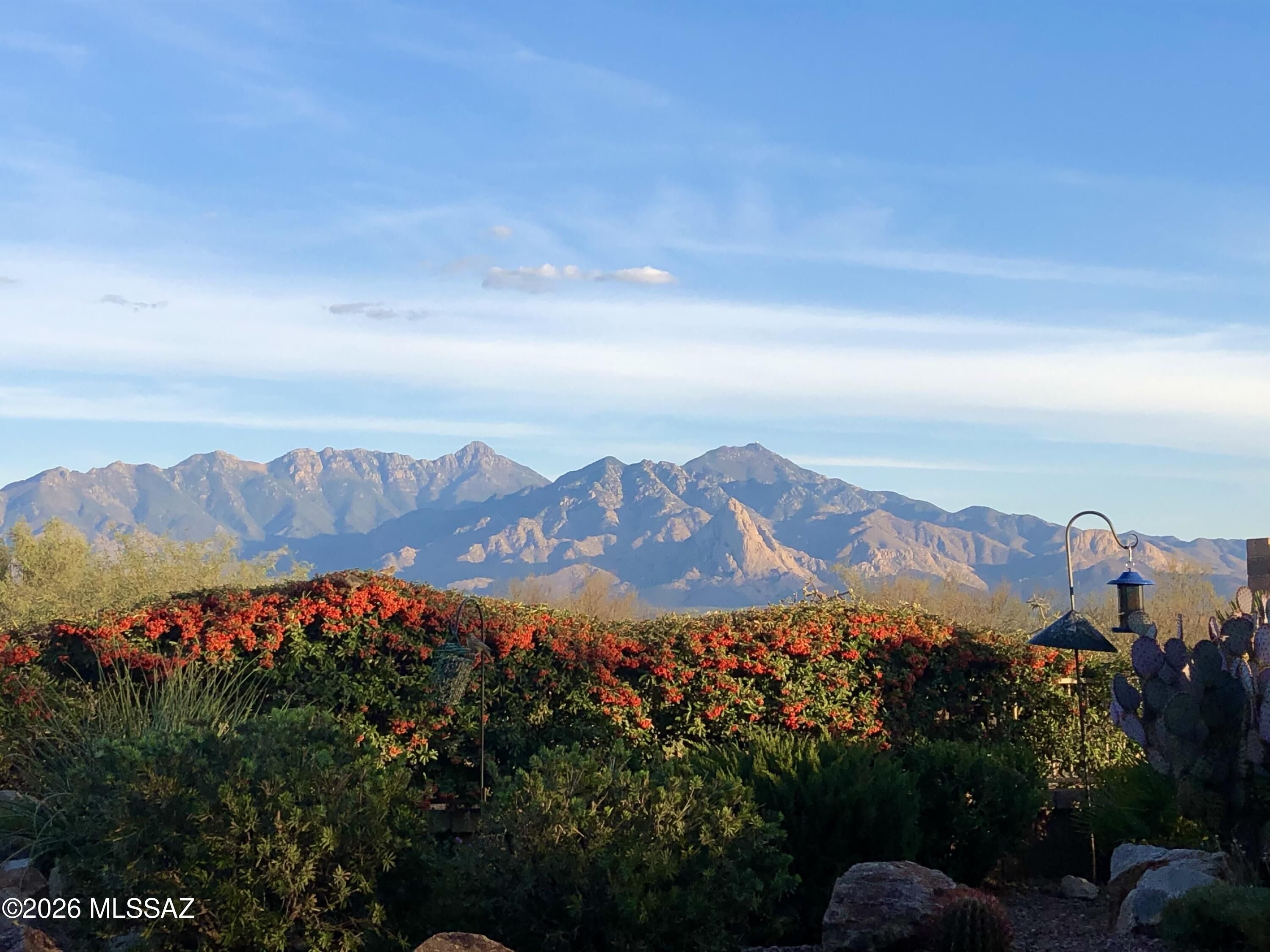 Perched at the quiet edge of the Canoa Ranch Sierra neighborhood - where pavement gives way to natural desert - this exceptional Green Valley home offers rare privacy, tranquility, and breathtaking 270-degree mountain views. With no neighbors to the east, west, or south, the setting feels expansive and serene, ideal for full-time or seasonal living. Positioned along the golf course yet set back from view, the home captures sweeping vistas of the Santa Rita Mountains, with distant Tumacacori, Rincon, and Northern Mexico ranges. The 1802 sq ft residence is light-filled with high ceilings, 2 bedrooms, 2 baths, and views from nearly every window. The rare third-car garage features a mini-split and 352 sq ft of office or workshop, easily convertible back to garage use.