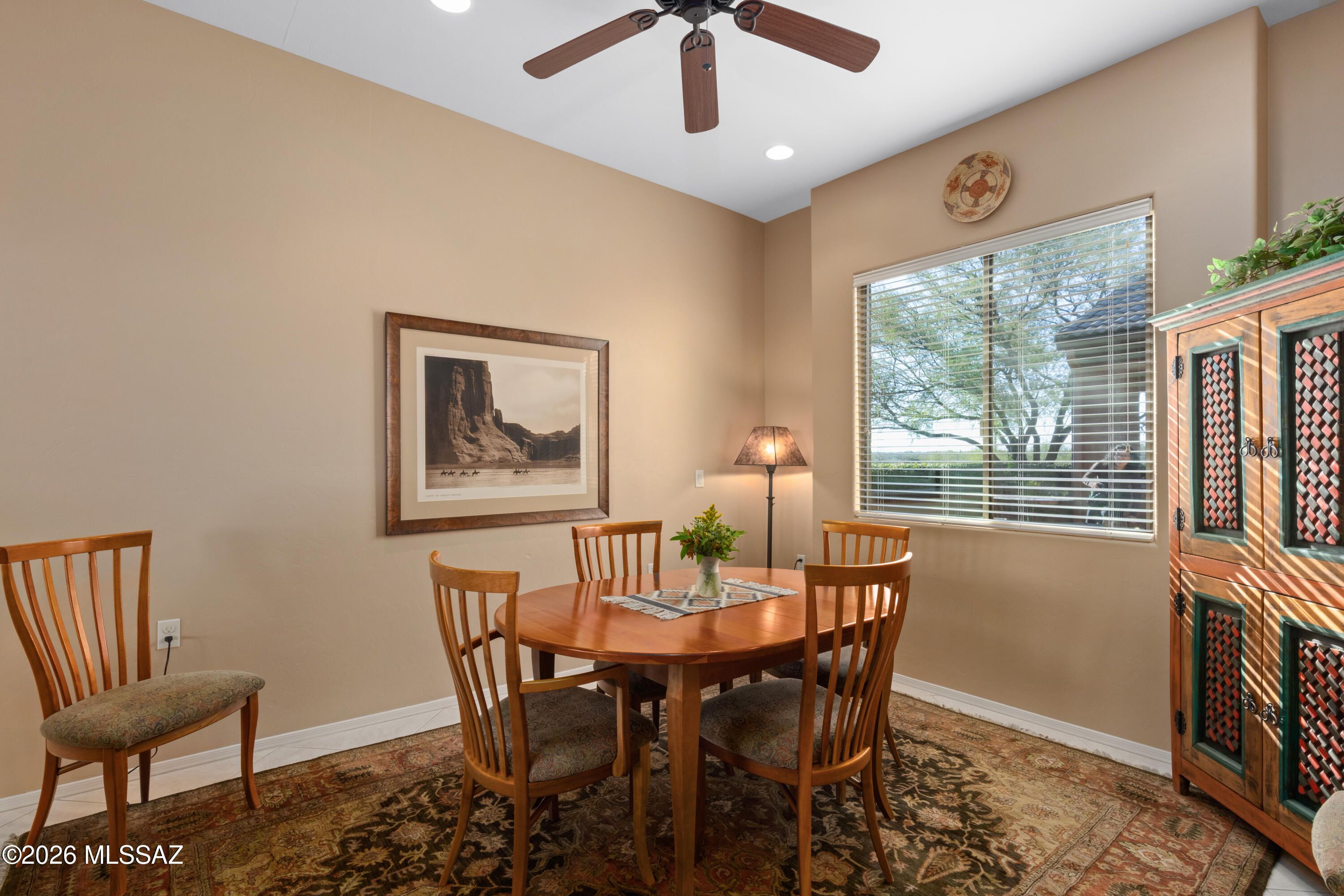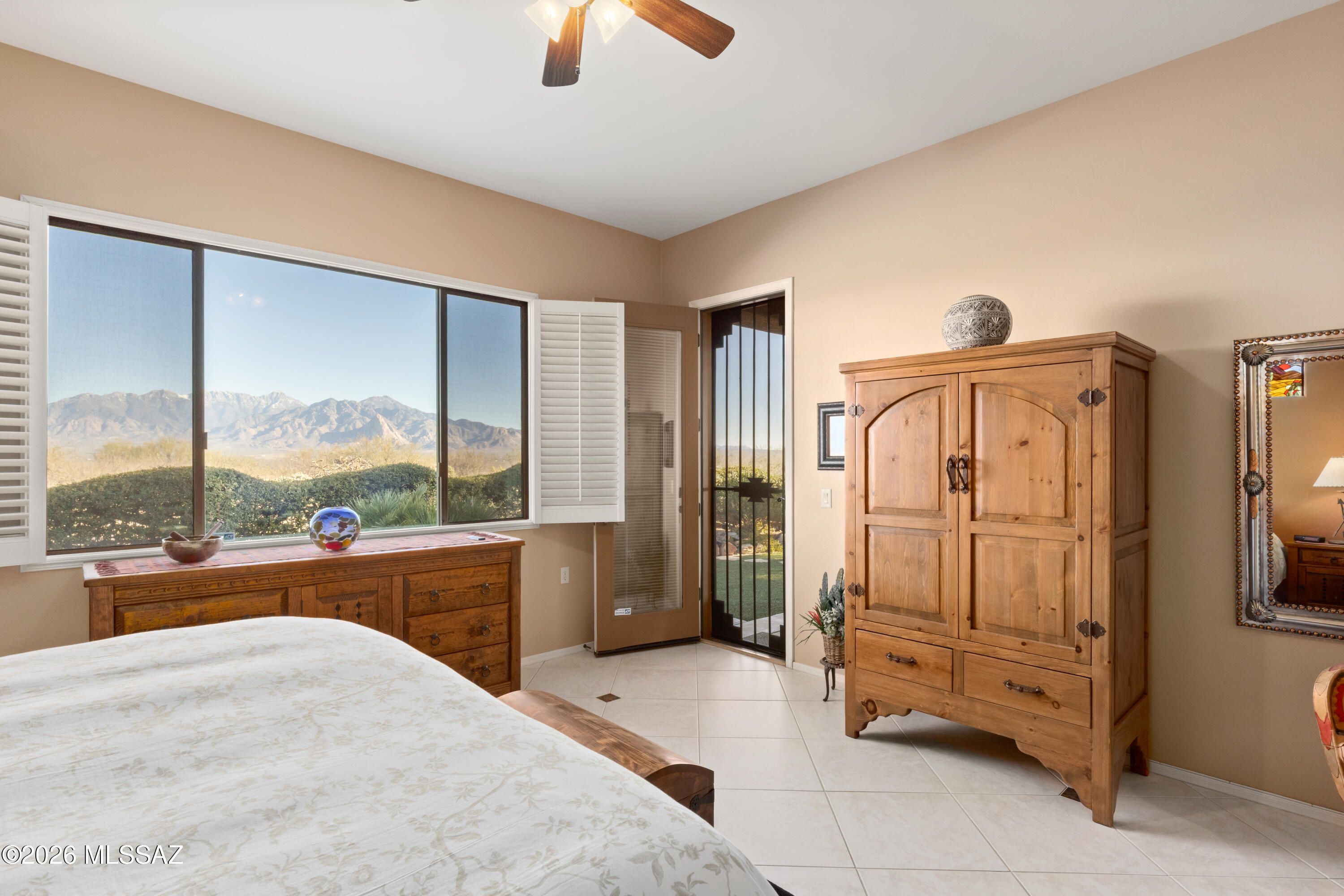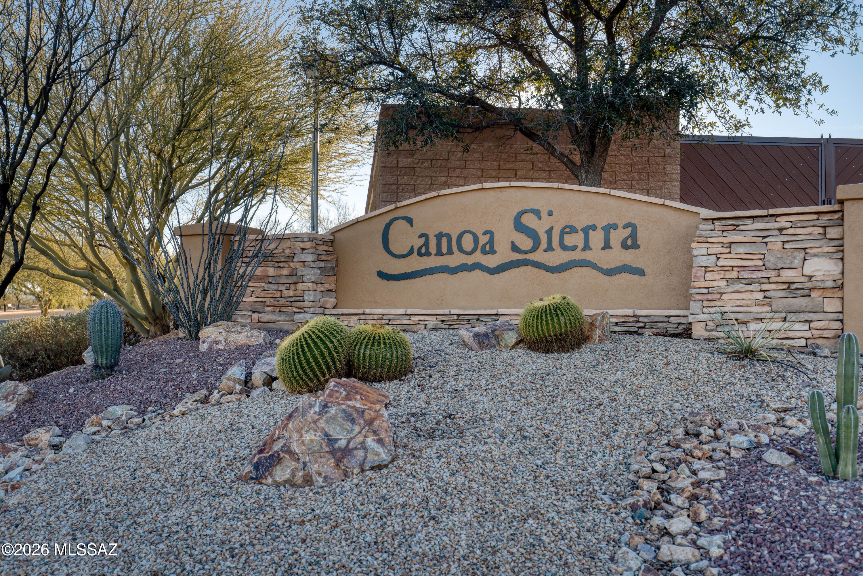 Perched at the quiet edge of the Canoa Ranch Sierra neighborhood - where pavement gives way to natural desert - this exceptional Green Valley home offers rare privacy, tranquility, and breathtaking 270-degree mountain views. With no neighbors to the east, west, or south, the setting feels expansive and serene, ideal for full-time or seasonal living. Positioned along the golf course yet set back from view, the home captures sweeping vistas of the Santa Rita Mountains, with distant Tumacacori, Rincon, and Northern Mexico ranges. The 1802 sq ft residence is light-filled with high ceilings, 2 bedrooms, 2 baths, and views from nearly every window. The rare third-car garage features a mini-split and 352 sq ft of office or workshop, easily convertible back to garage use.