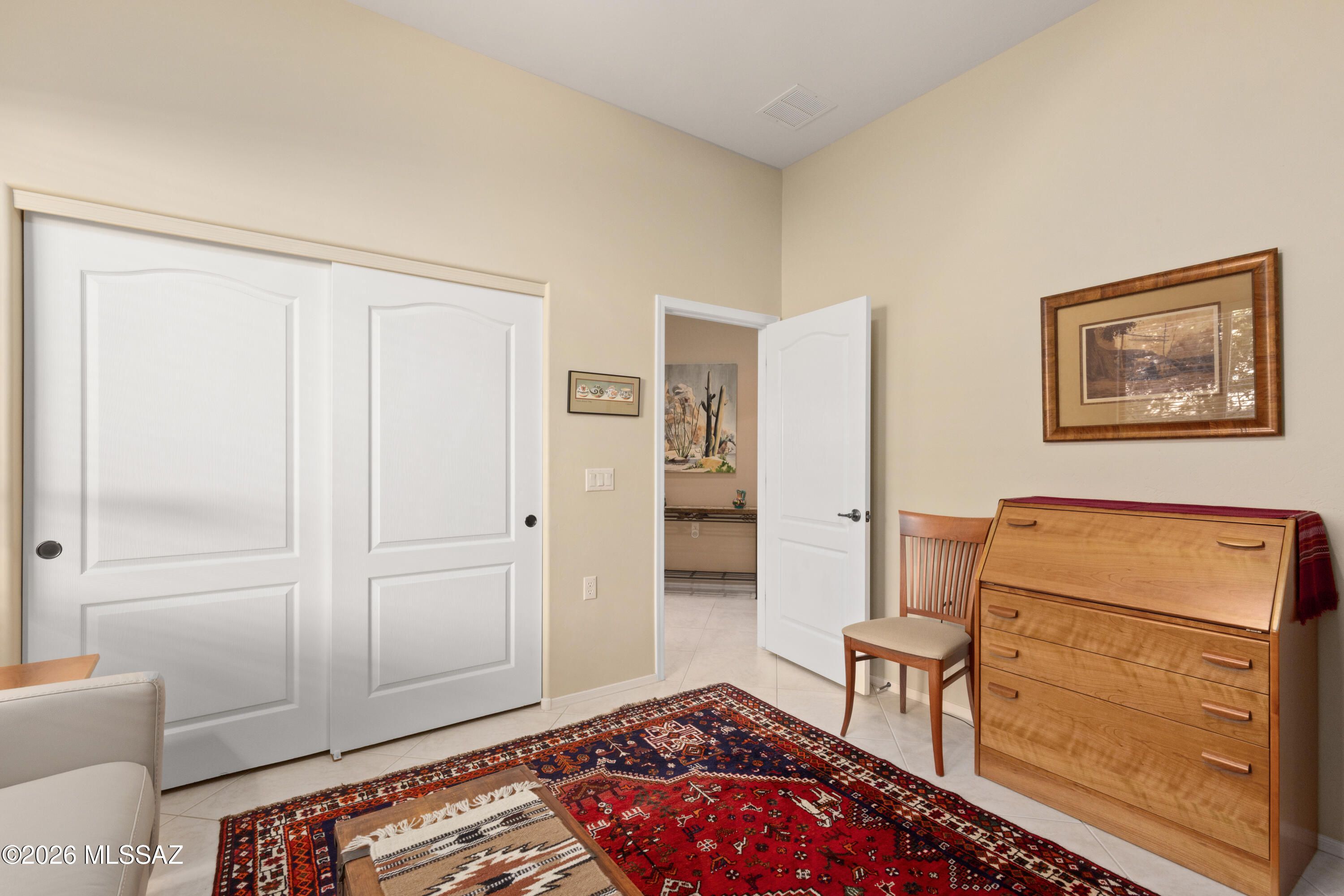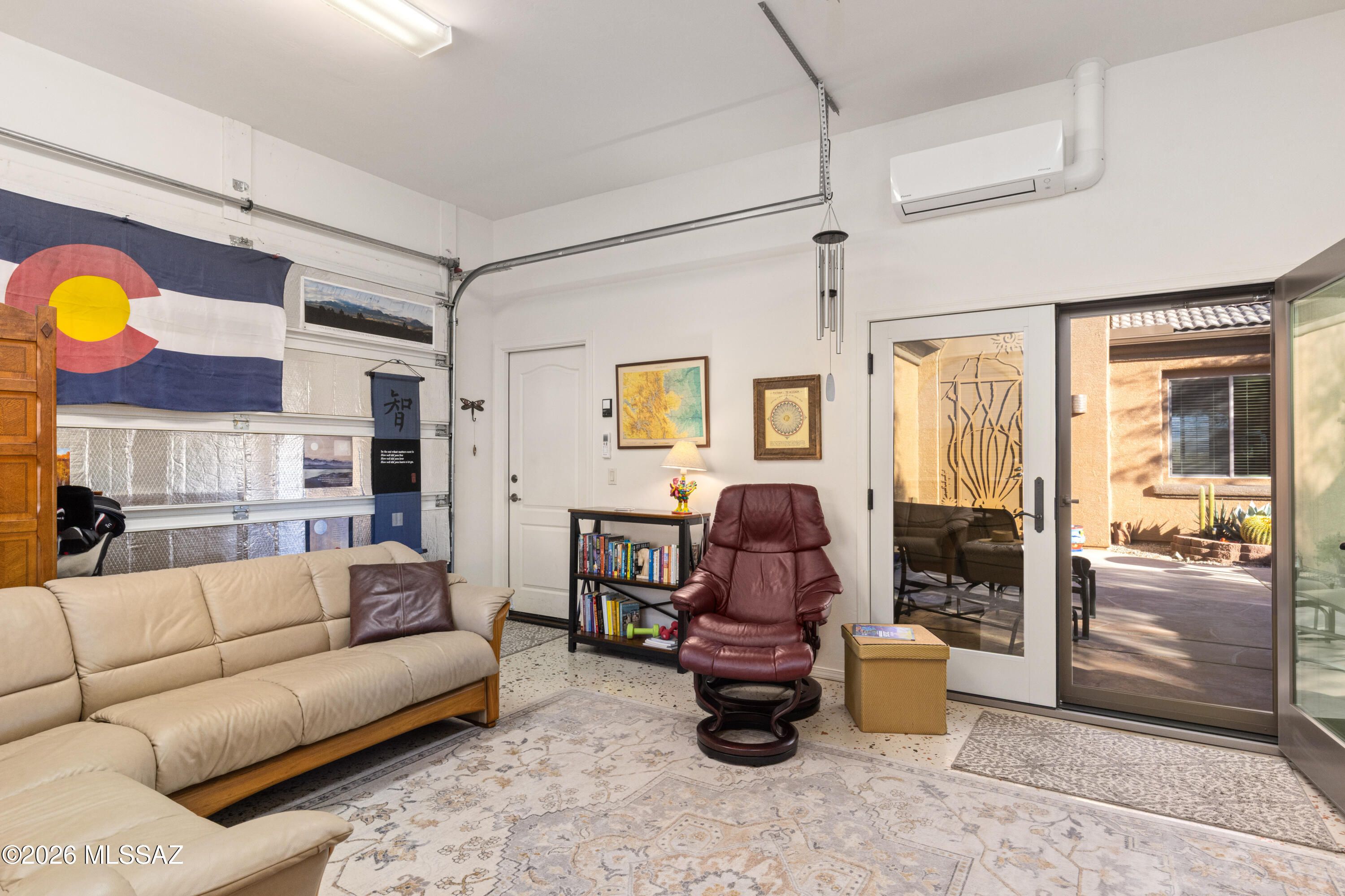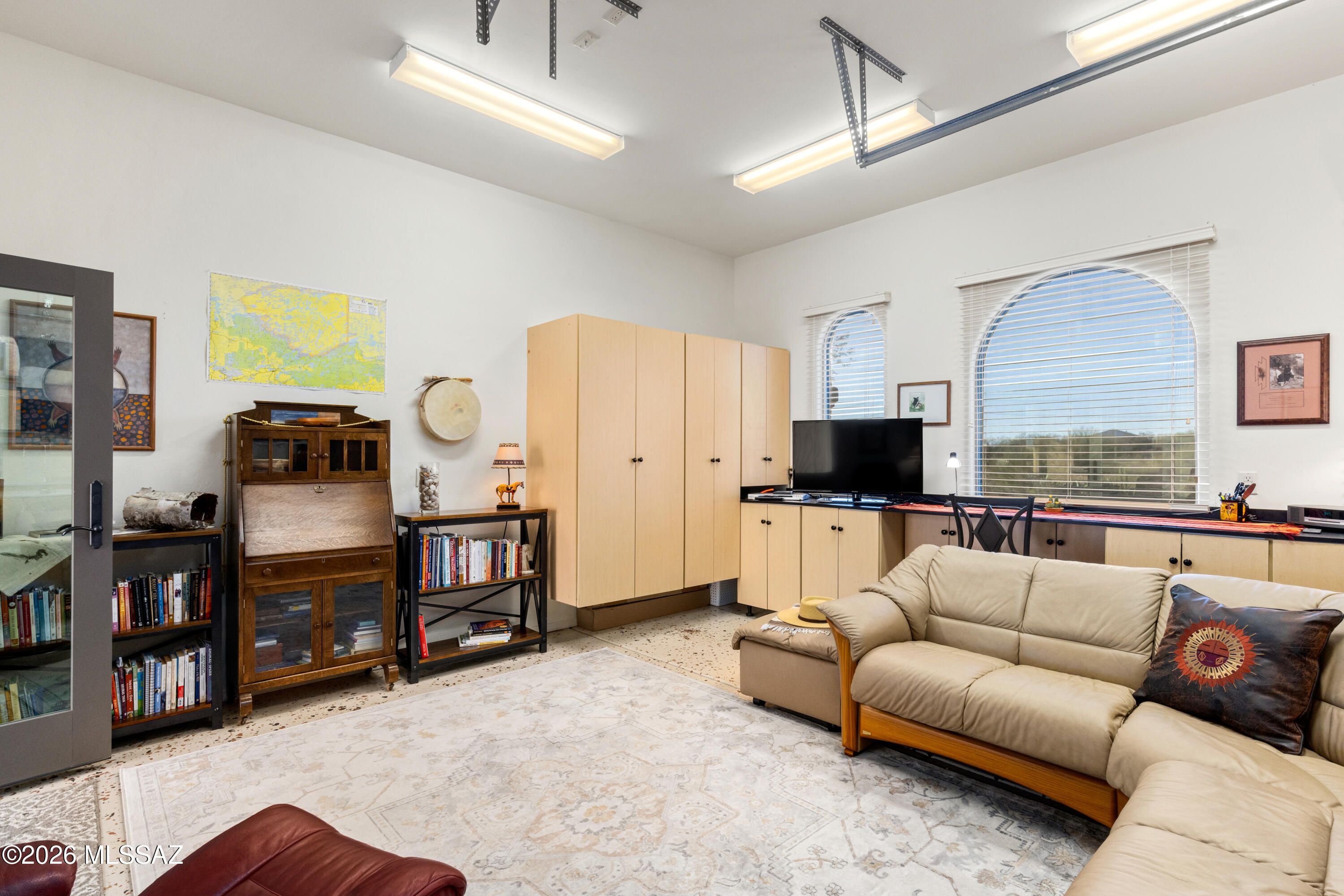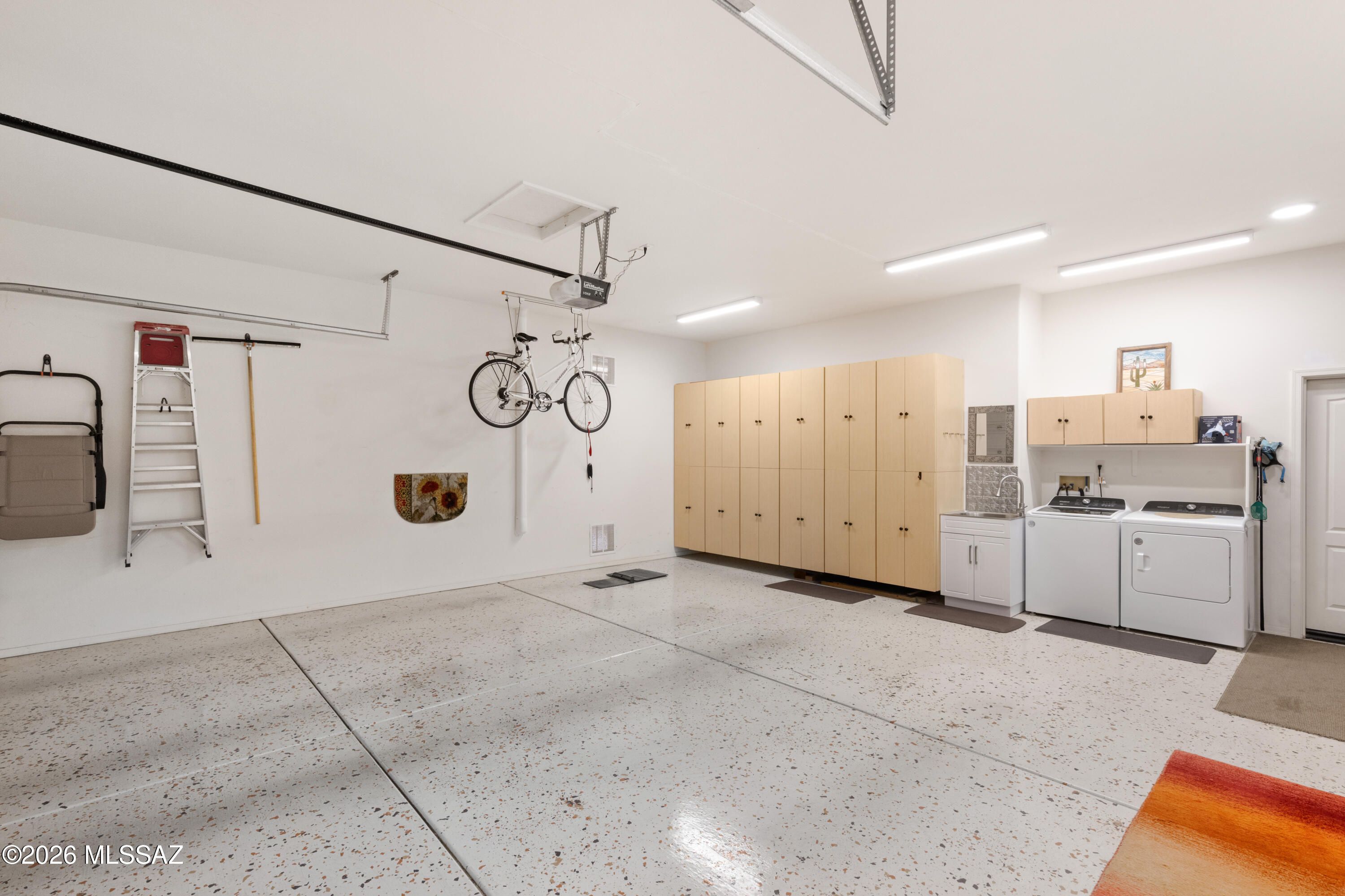 Perched at the quiet edge of the Canoa Ranch Sierra neighborhood - where pavement gives way to natural desert - this exceptional Green Valley home offers rare privacy, tranquility, and breathtaking 270-degree mountain views. With no neighbors to the east, west, or south, the setting feels expansive and serene, ideal for full-time or seasonal living. Positioned along the golf course yet set back from view, the home captures sweeping vistas of the Santa Rita Mountains, with distant Tumacacori, Rincon, and Northern Mexico ranges. The 1802 sq ft residence is light-filled with high ceilings, 2 bedrooms, 2 baths, and views from nearly every window. The rare third-car garage features a mini-split and 352 sq ft of office or workshop, easily convertible back to garage use.