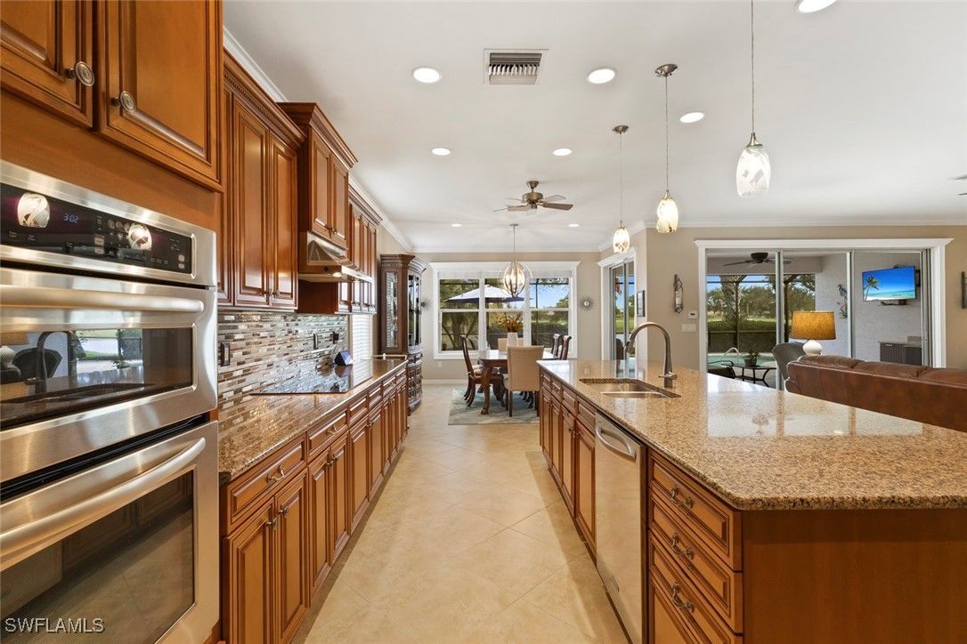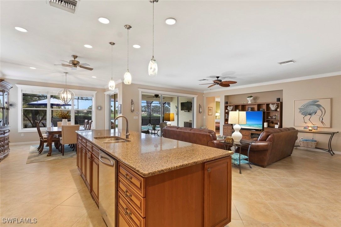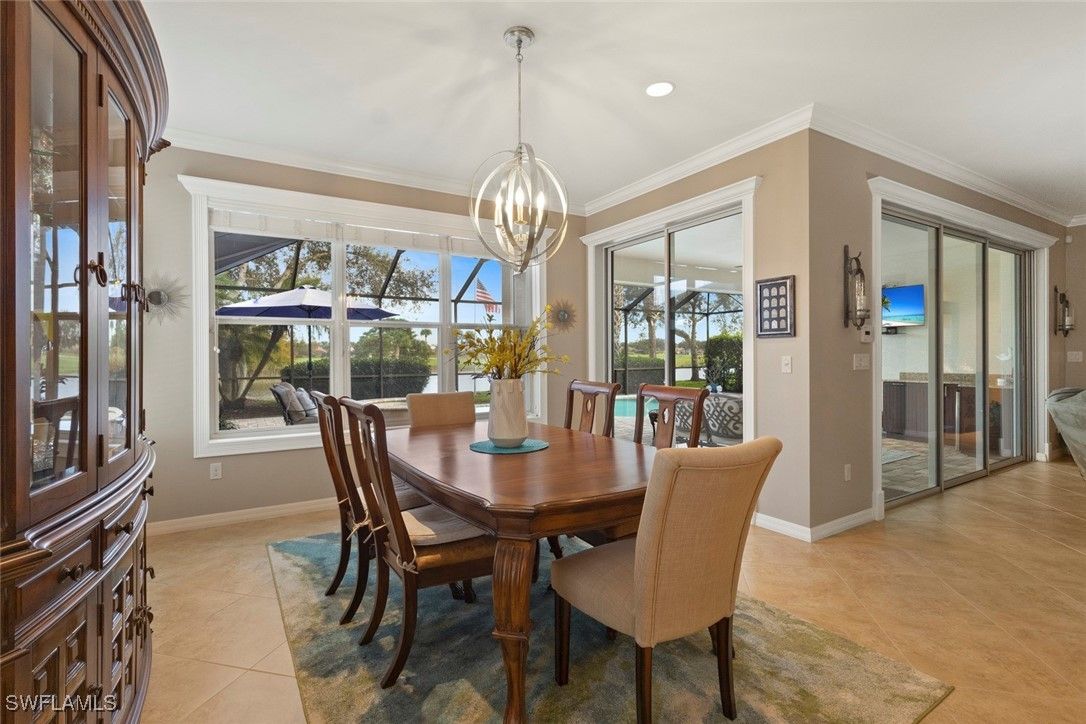 THIS HOME HAS IT ALL — A PRIVATE POOL & SPA, GOLF MEMBERSHIP INCLUDED, AND STUNNING GOLF COURSE VIEWS! Enjoy premium views of the 4th fairway of Panther Run Golf Course, perfectly positioned alongside tranquil water in the 55+ Del Webb Naples community. This DUNWOODY (similar to the popular STELLAR) floor plan offers 3 bedrooms plus a den and is filled with desirable upgrades throughout. The GOURMET KITCHEN is a chef’s delight and ideal for entertaining, featuring a large center island, upgraded appliances, and ADDITIONAL WINDOWS for abundant natural light. Plantation shutters, window treatments and crown molding throughout add timeless elegance, while TILE AND WOOD FLOORING span the main living areas, with carpet in just one guest bedroom for added comfort. A spacious and versatile den provides the flexibility for a home office, guest space, or hobby room. Step outside to the EXTENDED LANAI, where true Florida living shines with a SCREENED-IN POOL AND SPA overlooking the golf course and water - an ideal setting to relax, entertain, and take in breathtaking SUNRISE views. The luxurious PRIMARY SUITE serves as a private retreat, complete with a custom walk-in closet and an en-suite bath offering dual sinks, a walk-in shower, and a soaking tub. Additional highlights include a THREE CAR GARAGE with space for a golf cart, storage, and hobbies, plus valuable updates for peace of mind including a NEWER WATER HEATER (2025), NEWER HVAC system (2023), and fresh exterior paint. In Del Webb Naples, you’ll enjoy WORLD-CLASS AMENITIES that rival luxury resorts: dine at the Rusty Putter Restaurant, soak in the RESORT-STYLE or LAP POOLS, break a sweat in the state-of-the-art FITNESS CENTER, and play your way through PICKLEBALL, TENNIS, bocce, billiards - even a top-tier GOLF SIMULATOR! Need groceries, church, or a bite to eat? Just hop in your golf cart and cruise into town - Publix and the heart of Ave Maria are just minutes away. This isn’t just a home - it’s a LIFESTYLE UPGRADE in one of Southwest Florida’s most vibrant 55+ communities. Don’t miss your chance to live where fun, fitness, and friendships flourish year-round!