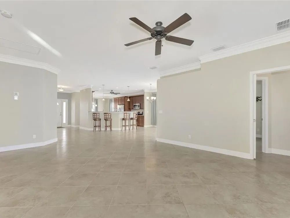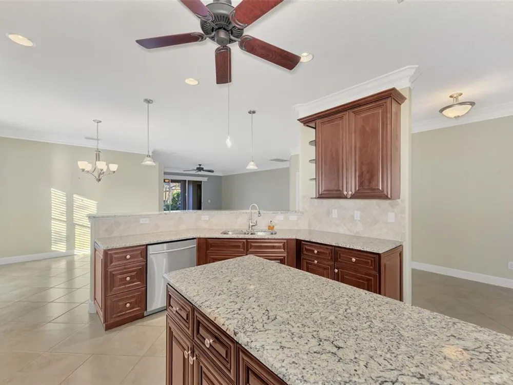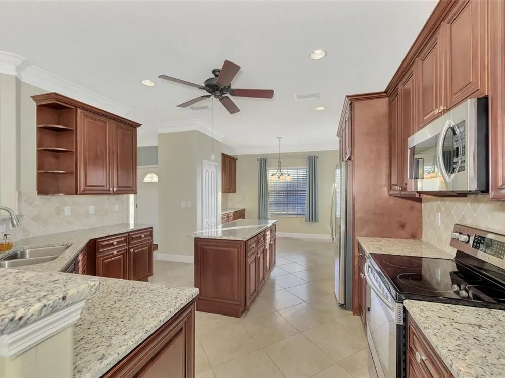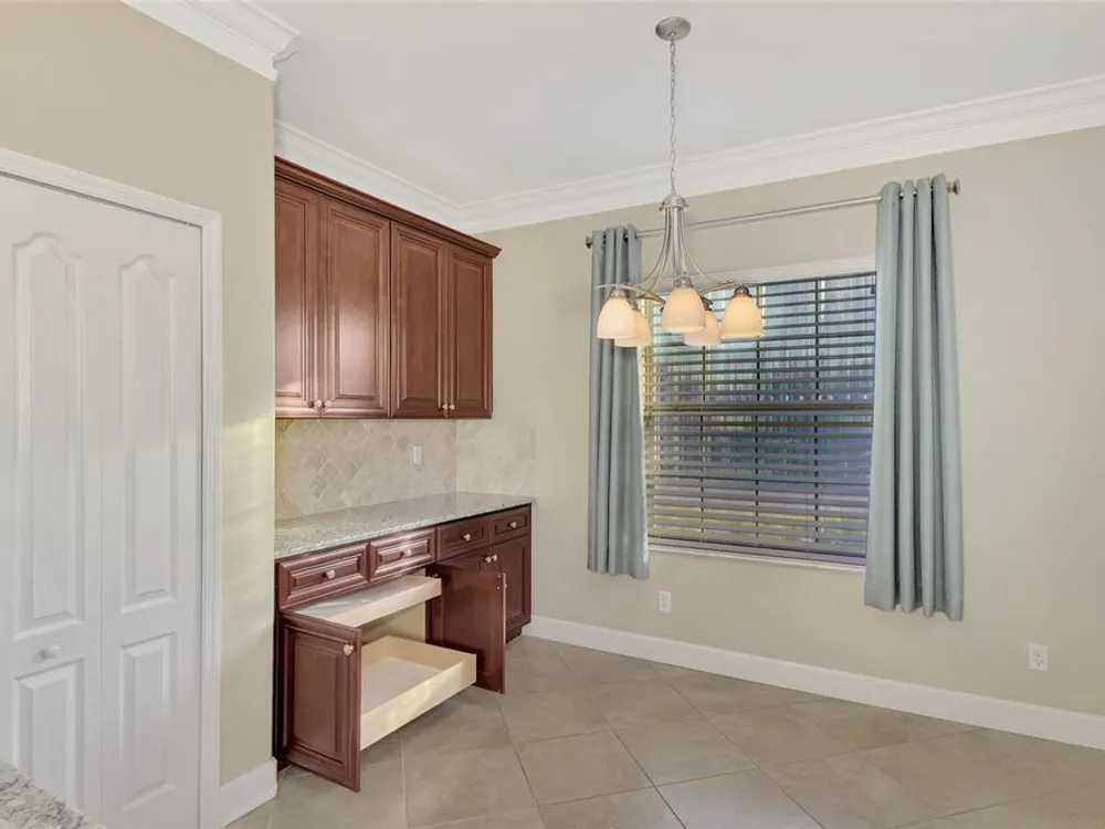 - Built-in Features, Ceiling Fan(s), Crown Molding, Eat-in Kitchen, Open Floorplan, Solid-Wood Cabinets, Split Bedrooms, Stone Counters, Thermostat, Walk-In Closet(s), Window Treatments