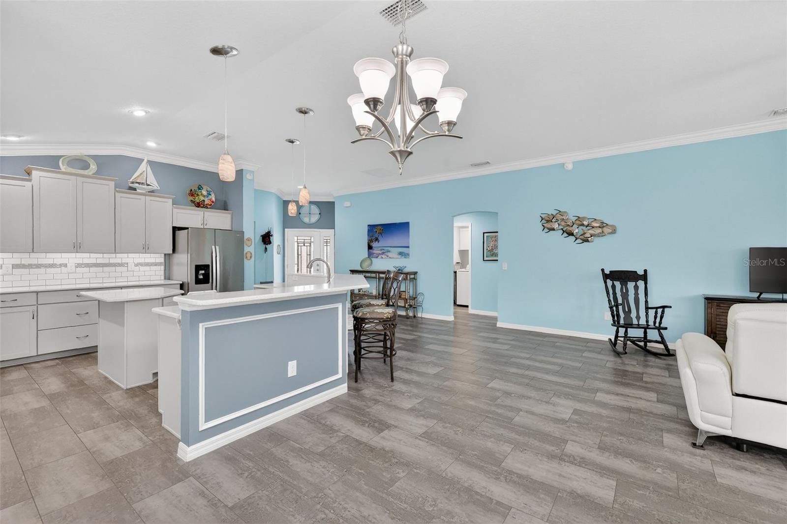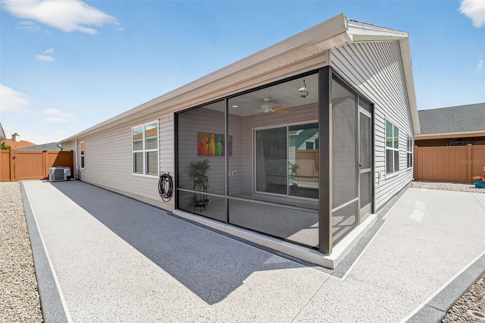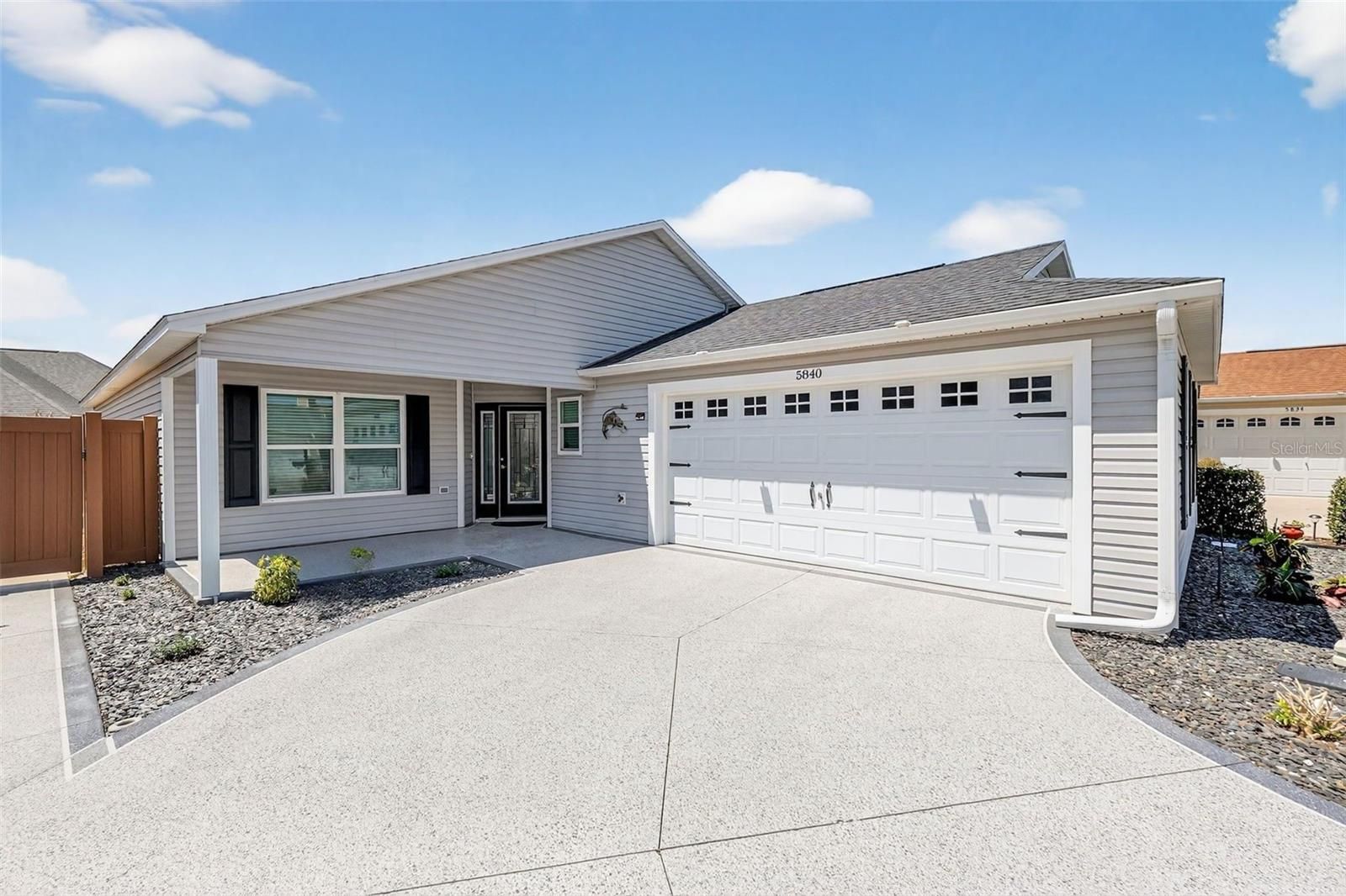 One or more photo(s) has been virtually staged. This STUNNING, PRIVATE 3/2 Melrose Courtyard Villa with 24’x20’ FULL TWO-CAR GARAGE and LOW-MAINTENANCE STONED LANDSCAPING in the contemporary village of DeSoto is the essence of MODERN comfort and style! JUST MINUTES to BROWNWOOD and the new EASTPORT TOWN SQUARE! DECORATIVELY PAINTED drive and walkway, CHARMING front porch, and entry with CONTEMPORARY LEADED-GLASS side-lite welcome you into this INCREDIBLE villa. The SPECTACULAR, EXPANSIVE kitchen is a chef’s dream boasting gorgeous STAGGERED LIGHT GRAY shaker cabinetry, QUARTZ countertops, TILE backsplash, STAINLESS appliances with GAS cooking, CENTER ISLAND, DOUBLE built-in PANTRY with PULL-OUTS, UNDER-COUNTER lighting, and an EAT-IN breakfast bar with decorative WAINSCOTING - perfect for casual dining. UPGRADES include CROWN MOLDING, GRAY LUXURY VINYL PLANK TILE flooring, and EXTENDED baseboards THROUGHOUT the ENTIRE home! The OPEN CONCEPT design and soaring HIGH ceilings of the living, dining, and kitchen create a VOLUMINOUS main living area. From the living room, a set of sliding glass doors invites you into the SPACIOUS screened lanai surrounded by DECORATIVELY PAINTED rear and side patios that create multiple areas for lounging, dining and entertaining. This FABULOUS OUTDOOR OASIS is enhanced by thoughtfully designed stone landscaping, providing a clean, polished look with minimal upkeep. A combination of fencing and a masonry wall encloses the courtyard-style setting, delivering EXCEPTIONAL PRIVACY and a serene, secluded atmosphere. Back inside, the primary bedroom features a VAULTED ceiling, DOUBLE windows, and WALK-IN closet. It’s en suite bathroom boasts LIGHT GRAY shaker cabinetry with QUARTZ COUNTERTOPS, DUAL sinks, ROMAN-STYLE TILED WALK-IN shower, and a separate water closet. Bedroom two offers a VAULTED ceiling, DOUBLE windows, and a built-in closet. The second bathroom features an LIGHT GRAY shaker vanity with extended shelving and QUARTZ top, tub and shower combination, and a hall LINEN closet. The third bedroom has a built-in closet and offers an ideal space for a home office or additional sleeping area. A centrally-located INTERIOR laundry room features additional LIGHT GRAY shaker cabinets for EXTRA STORAGE needs. The TWO CAR GARAGE boasts an EPOXIED floor, NOVA whole house water filtration system, utility sink, shelving, and PLENTY of space for parking and storage! *Furniture and Golf Cart are Available Separately* DON’T MISS YOUR OPPORTUNITY TO OWN THIS INCREDIBLE VILLA! The village of DeSoto is conveniently located JUST MINUTES to the new EASTPORT TOWN SQUARE! Only about one mile to Everglades Regional Recreation Complex – the largest in The Villages – and about one mile to Magnolia Plaza with Publix, restaurants, banking and more! Close to Fenney Grill and Family Pool; Sugar Cane and Riverbend Adult Pools and Recreation Centers; several Executive Golf Courses (all golf cart accessible); Hogeye and Fenney Nature Trails; an Archery Range and Air Gun Range; Rupert Dog Park; and Edna’s on the Green! PLEASE WATCH OUR WALKTHROUGH VIDEO of this SPECTACULAR HOME in an AMAZING LOCATION, and call today to schedule your Private Showing or Virtual Tour!