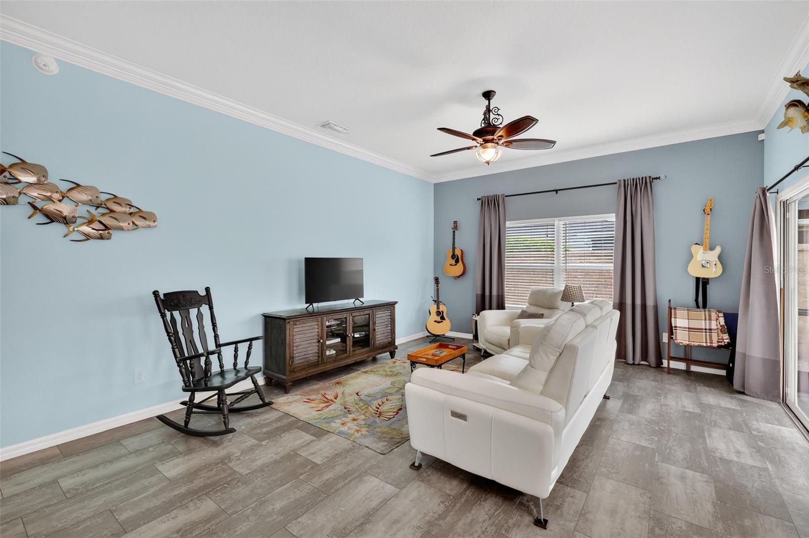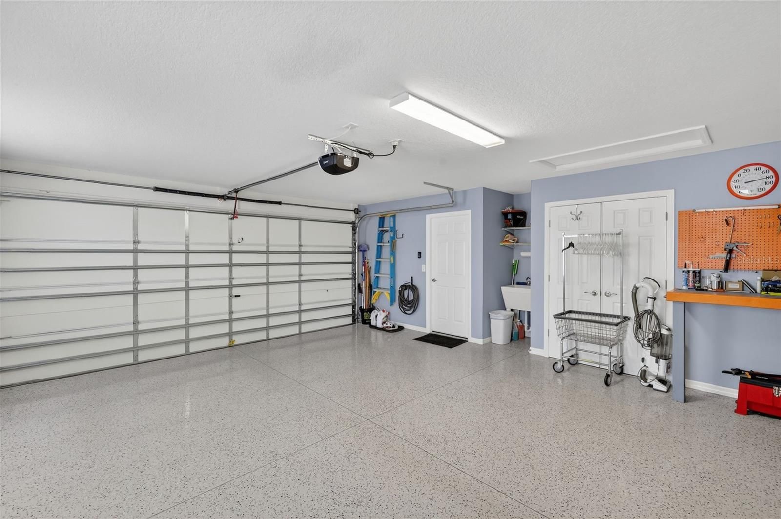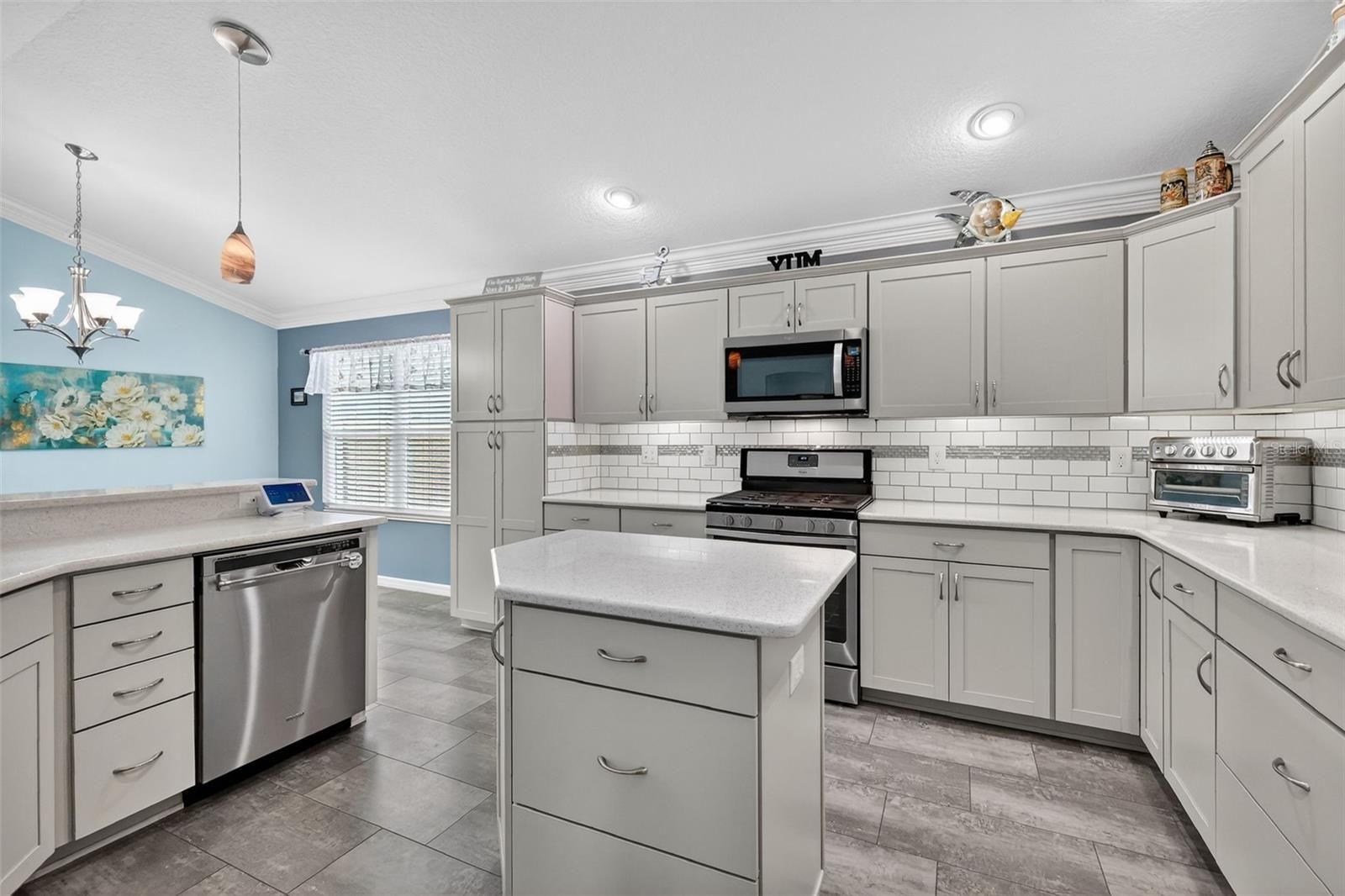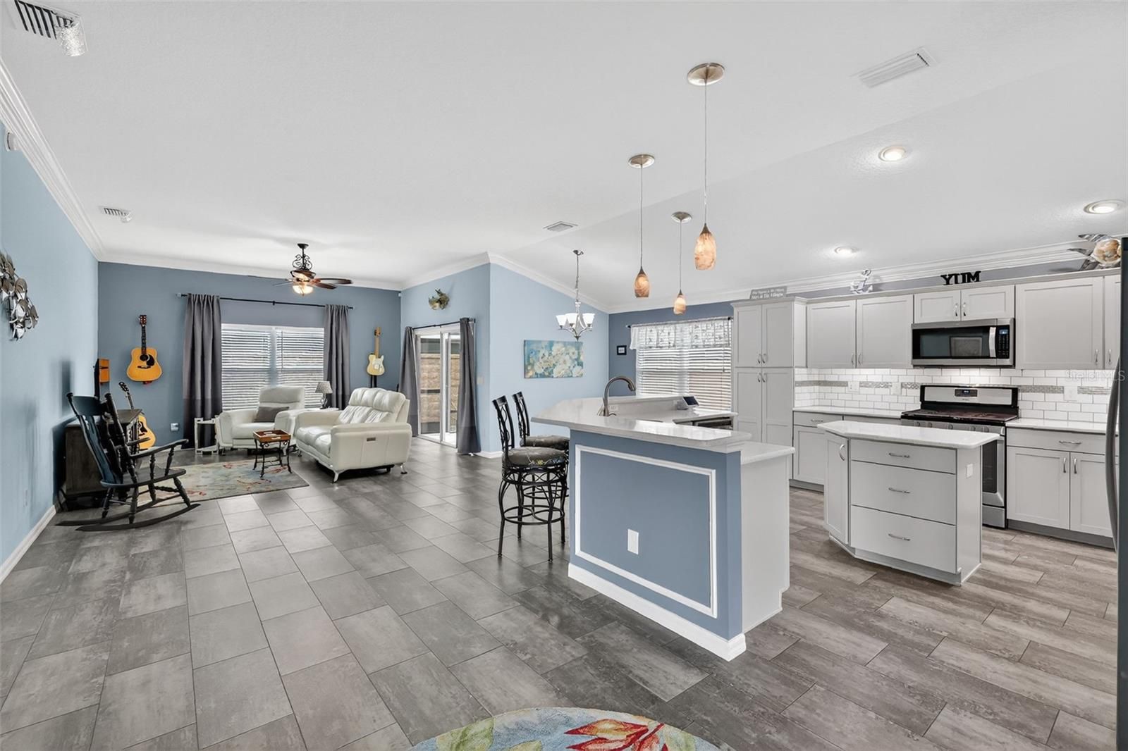One or more photo(s) has been virtually staged. This STUNNING, PRIVATE 3/2 Melrose Courtyard Villa with 24’x20’ FULL TWO-CAR GARAGE and LOW-MAINTENANCE STONED LANDSCAPING in the contemporary village of DeSoto is the essence of MODERN comfort and style! JUST MINUTES to BROWNWOOD and the new EASTPORT TOWN SQUARE! DECORATIVELY PAINTED drive and walkway, CHARMING front porch, and entry with CONTEMPORARY LEADED-GLASS side-lite welcome you into this INCREDIBLE villa. The SPECTACULAR, EXPANSIVE kitchen is a chef’s dream boasting gorgeous STAGGERED LIGHT GRAY shaker cabinetry, QUARTZ countertops, TILE backsplash, STAINLESS appliances with GAS cooking, CENTER ISLAND, DOUBLE built-in PANTRY with PULL-OUTS, UNDER-COUNTER lighting, and an EAT-IN breakfast bar with decorative WAINSCOTING - perfect for casual dining. UPGRADES include CROWN MOLDING, GRAY LUXURY VINYL PLANK TILE flooring, and EXTENDED baseboards THROUGHOUT the ENTIRE home! The OPEN CONCEPT design and soaring HIGH ceilings of the living, dining, and kitchen create a VOLUMINOUS main living area. From the living room, a set of sliding glass doors invites you into the SPACIOUS screened lanai surrounded by DECORATIVELY PAINTED rear and side patios that create multiple areas for lounging, dining and entertaining. This FABULOUS OUTDOOR OASIS is enhanced by thoughtfully designed stone landscaping, providing a clean, polished look with minimal upkeep. A combination of fencing and a masonry wall encloses the courtyard-style setting, delivering EXCEPTIONAL PRIVACY and a serene, secluded atmosphere. Back inside, the primary bedroom features a VAULTED ceiling, DOUBLE windows, and WALK-IN closet. It’s en suite bathroom boasts LIGHT GRAY shaker cabinetry with QUARTZ COUNTERTOPS, DUAL sinks, ROMAN-STYLE TILED WALK-IN shower, and a separate water closet. Bedroom two offers a VAULTED ceiling, DOUBLE windows, and a built-in closet. The second bathroom features an LIGHT GRAY shaker vanity with extended shelving and QUARTZ top, tub and shower combination, and a hall LINEN closet. The third bedroom has a built-in closet and offers an ideal space for a home office or additional sleeping area. A centrally-located INTERIOR laundry room features additional LIGHT GRAY shaker cabinets for EXTRA STORAGE needs. The TWO CAR GARAGE boasts an EPOXIED floor, NOVA whole house water filtration system, utility sink, shelving, and PLENTY of space for parking and storage! *Furniture and Golf Cart are Available Separately* DON’T MISS YOUR OPPORTUNITY TO OWN THIS INCREDIBLE VILLA! The village of DeSoto is conveniently located JUST MINUTES to the new EASTPORT TOWN SQUARE! Only about one mile to Everglades Regional Recreation Complex – the largest in The Villages – and about one mile to Magnolia Plaza with Publix, restaurants, banking and more! Close to Fenney Grill and Family Pool; Sugar Cane and Riverbend Adult Pools and Recreation Centers; several Executive Golf Courses (all golf cart accessible); Hogeye and Fenney Nature Trails; an Archery Range and Air Gun Range; Rupert Dog Park; and Edna’s on the Green! PLEASE WATCH OUR WALKTHROUGH VIDEO of this SPECTACULAR HOME in an AMAZING LOCATION, and call today to schedule your Private Showing or Virtual Tour!