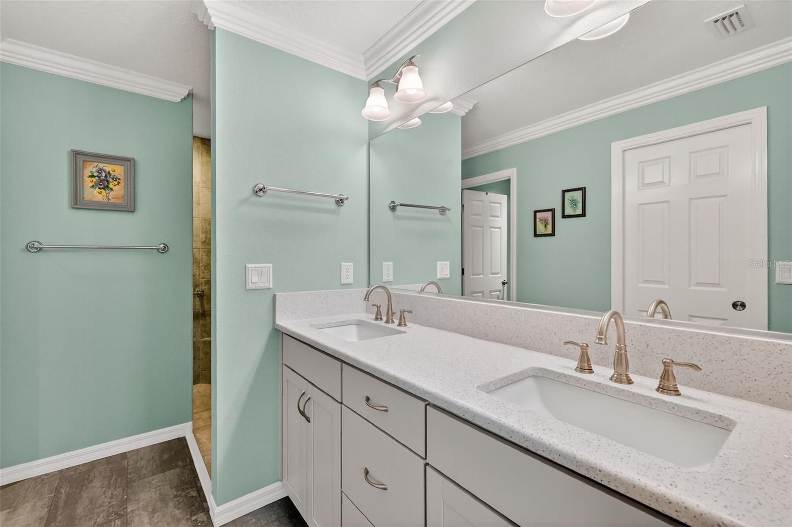 - Ceiling Fan(s), Crown Molding, Eat-in Kitchen, High Ceilings, Living/Dining Room, Open Floorplan, Main Level Primary, Solid Surface Counters, Split Bedrooms, Vaulted Ceiling(s), Walk-In Closet(s)