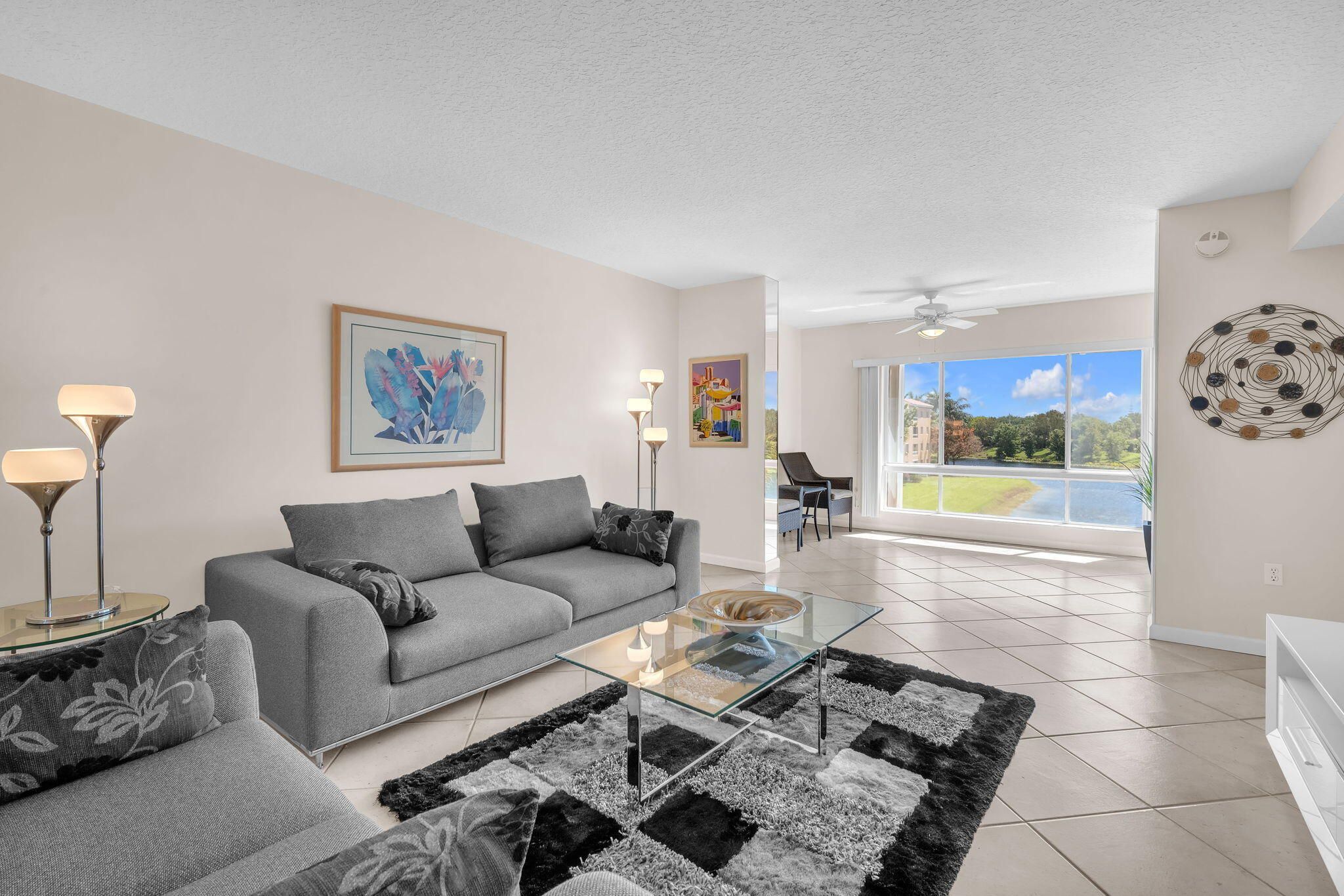 Enjoy serene lakefront living in this bright and spacious 3BR/2BA condo. This 1,509 sq ft. home is filled with natural light and showcases stunning water views from the main living areas. The open concept layout includes a large living/dining space, a separate laundry closet, and a generous primary suite with a walk-in closet. The kitchen offers ample cabinetry and overlooks the living area—perfect for entertaining. Located in Coral Lakes, offering a true country club lifestyle with resort style amenities. Ideal for active adults seeking comfort, convenience, and scenic surroundings. Residents enjoy access to a full suite of resort-style amenities including a clubhouse, theater, shows, cafe, indoor and outdoor pools, tennis, pickleball and more. Accordion shutters throughout.