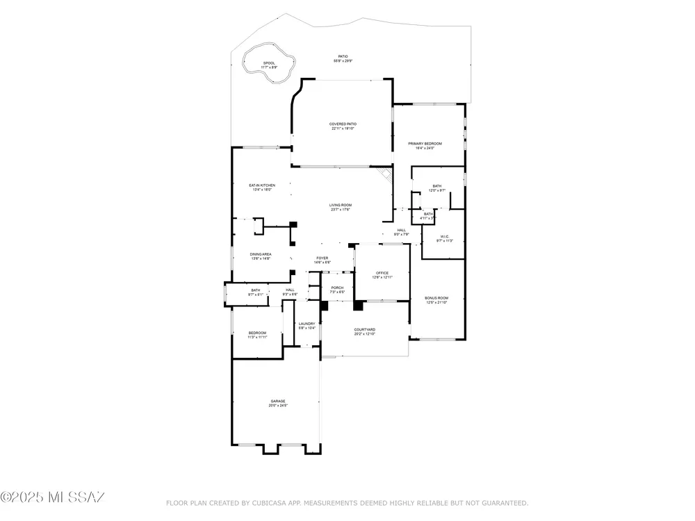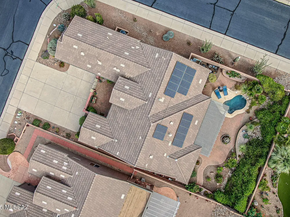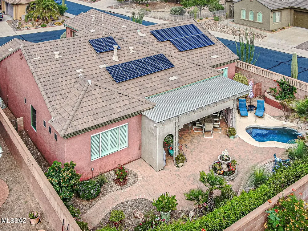 Absolutely STUNNING 2BR + Den + Bonus Room home in desirable Canoa Terrace! Owned solar for extra efficiency. Step inside & soak in the amazing view of the tropical backyard. Chefs kitchen features granite counters, gas cooktop, eat-in area, & pantry. Open concept to lovely living room, highlighted w/ a gorgeous bee hive gas fireplace. The spacious primary suite features clerestory windows, door to patio, & ensuite bath w/ beautiful tiled walk-in shower, dual vanity, & large walk-in closet. Split-bedroom layout provides an inviting private guest room w/ bath adjacent. Large den/office off living room, AND additional oversized bonus room w/ AC split-perfect for an extra den, craft, or media space. Step outside to your private backyard oasis w/ tropical pebble-tec spool & waterfall....