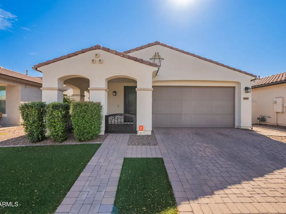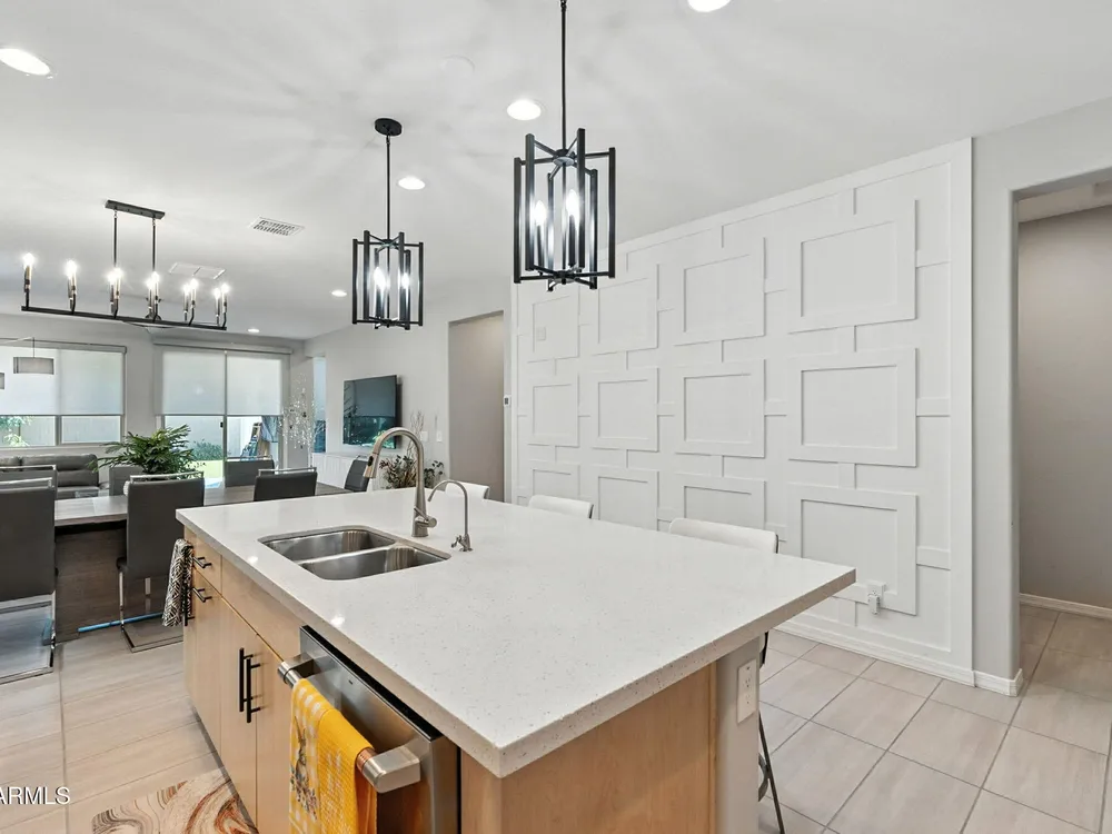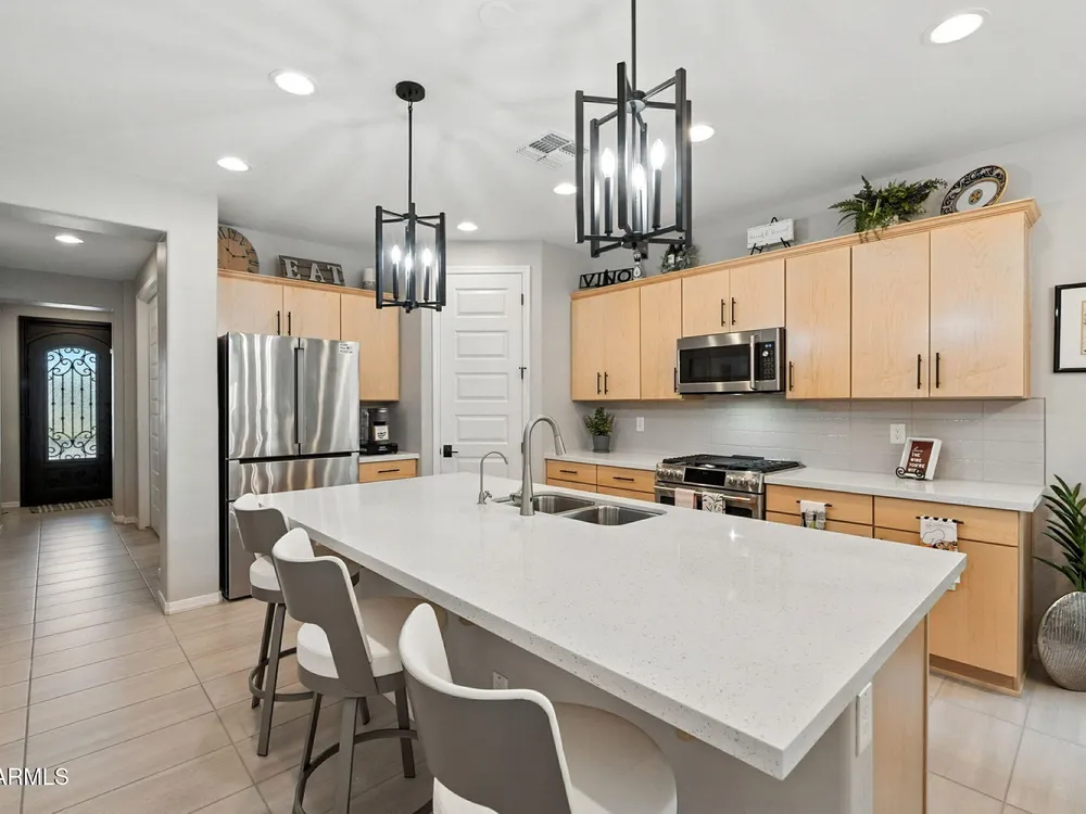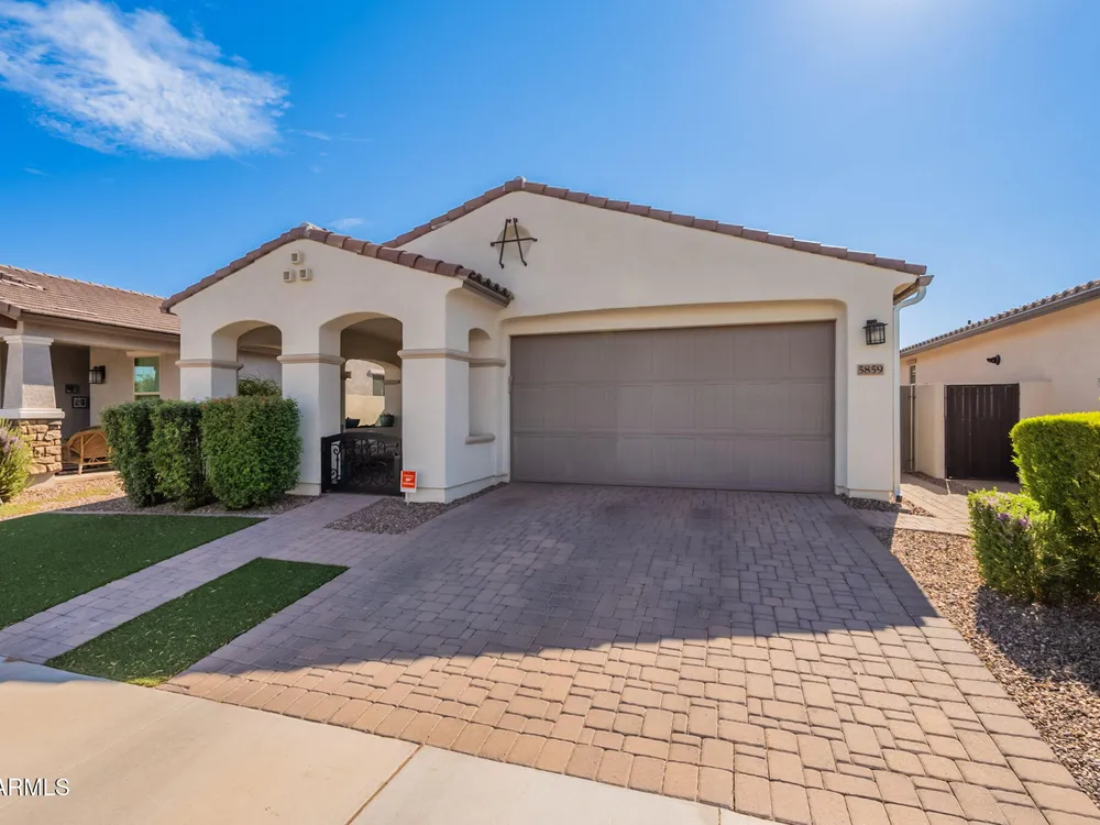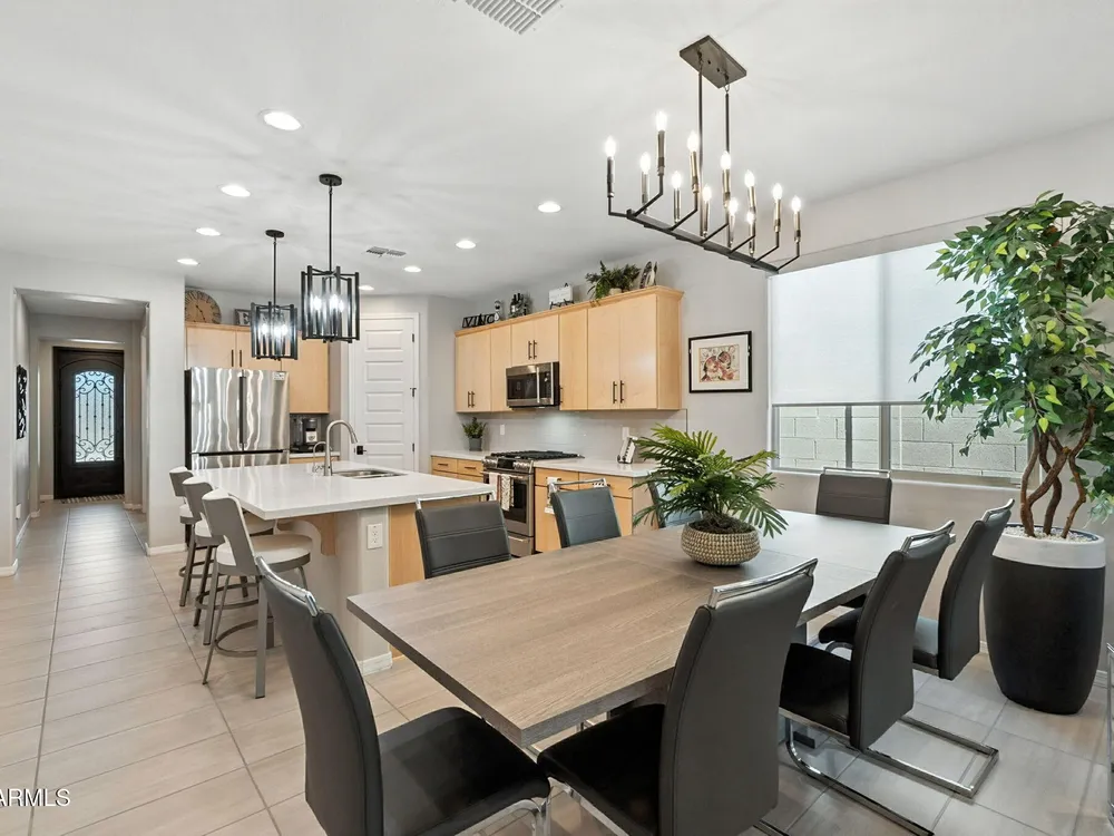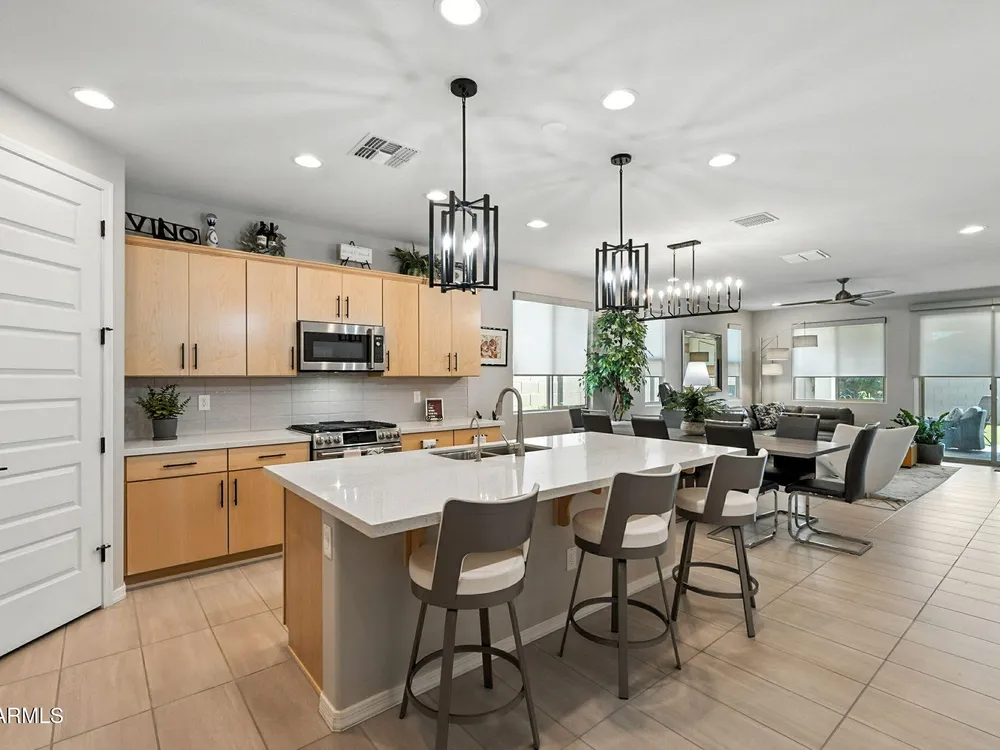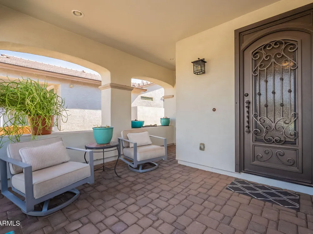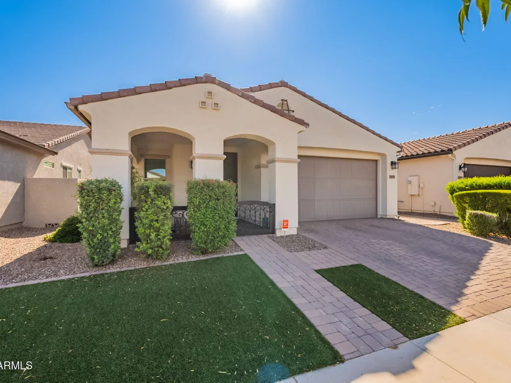 Stunning 2 bedroom, 2 bath home with a den in the 55+ community of Encore at Eastmark. Home is highly upgraded! Enter the home through the large iron door and front patio w/ iron gates.Home features great room concept with eat in kitchen. Kitchen has upgraded cabinets that roll out, panty, large island with R/O, stainless appliances including refrigerator, gas range/oven, granite counters and tiled backsplash. Primary bedroom has a spacious shower, dual sinks, granite counters, large walk in closet with access to the laundry room ( washer and dryer are 2 months old and covey). Home has upgraded fans and light fixtures, automatic blinds and decorative walls. Backyard is easy to maintain with covered patio, tv, and upgraded turf. Garage has epoxy floors, refrigerator & additional storage.