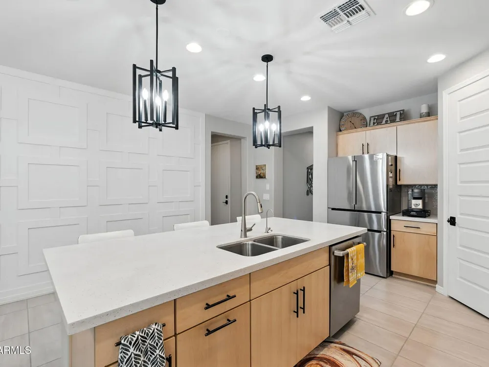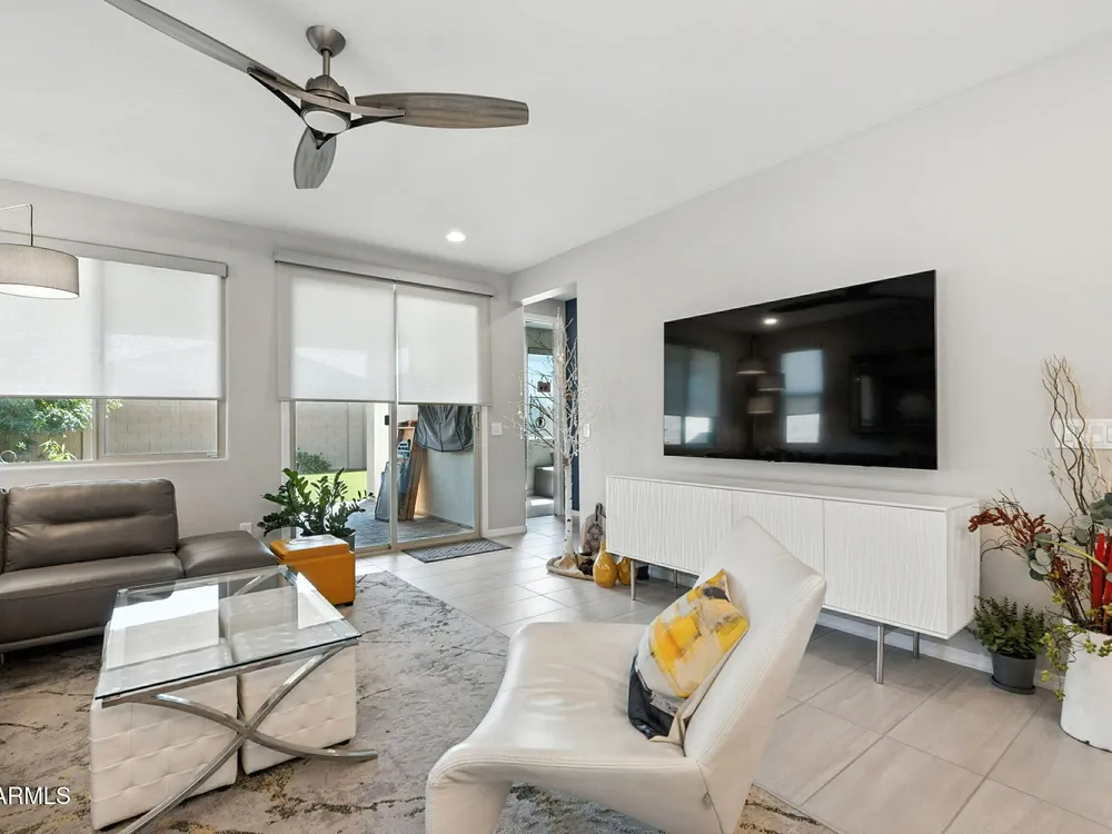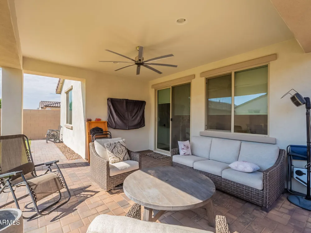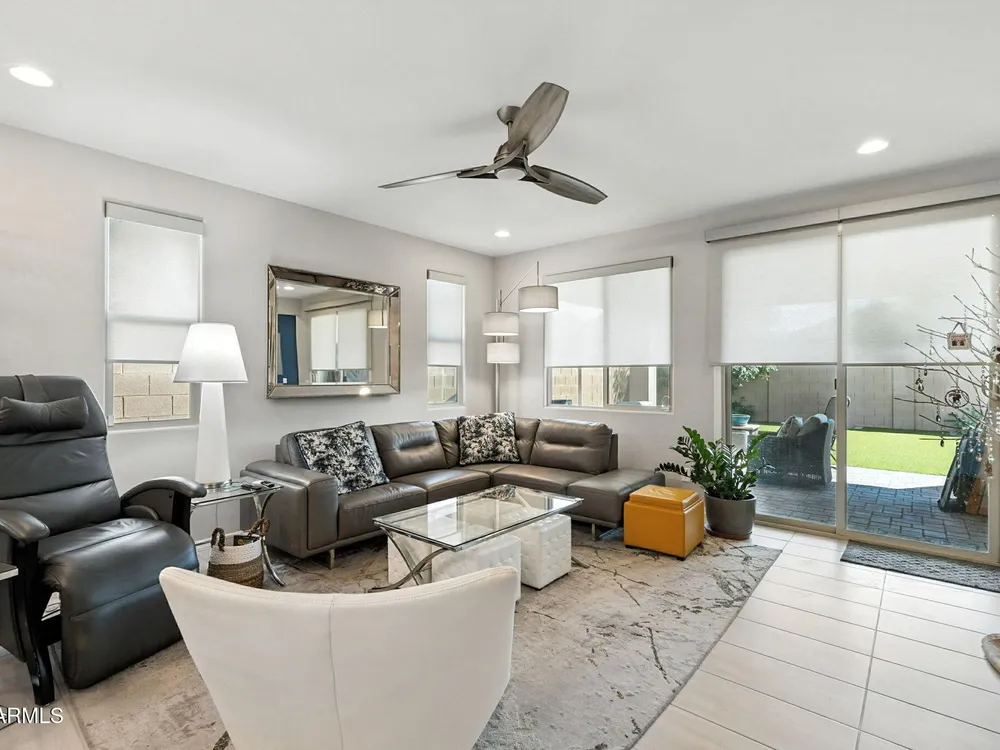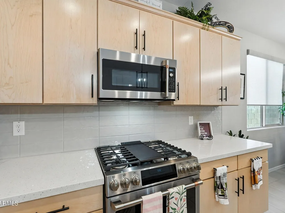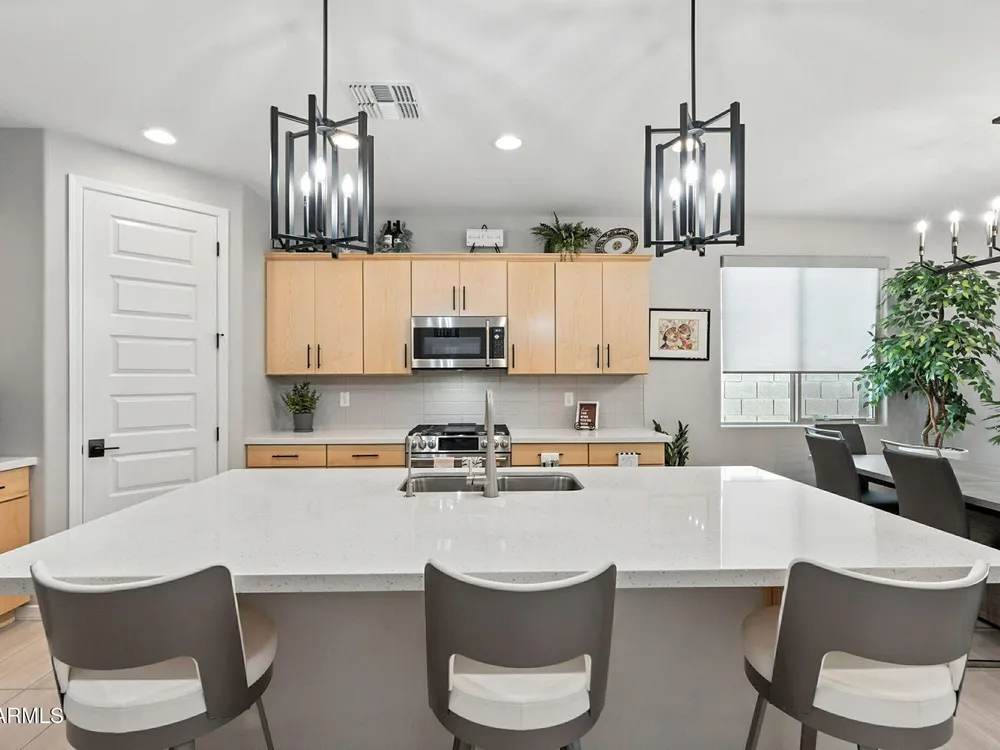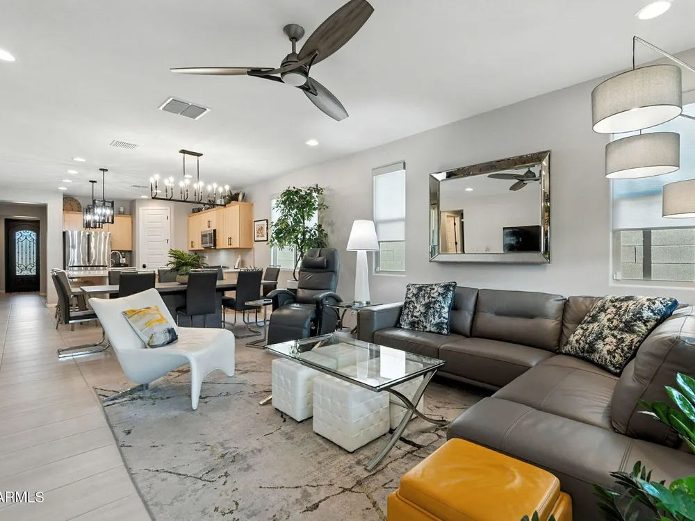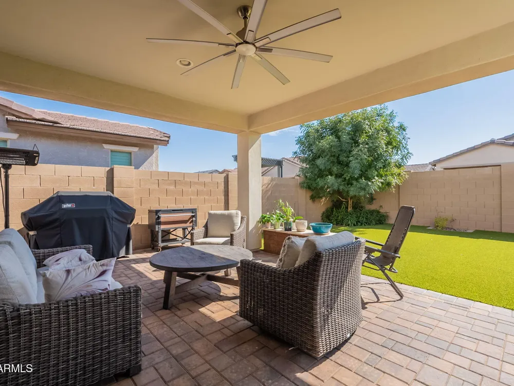Stunning 2 bedroom, 2 bath home with a den in the 55+ community of Encore at Eastmark. Home is highly upgraded! Enter the home through the large iron door and front patio w/ iron gates.Home features great room concept with eat in kitchen. Kitchen has upgraded cabinets that roll out, panty, large island with R/O, stainless appliances including refrigerator, gas range/oven, granite counters and tiled backsplash. Primary bedroom has a spacious shower, dual sinks, granite counters, large walk in closet with access to the laundry room ( washer and dryer are 2 months old and covey). Home has upgraded fans and light fixtures, automatic blinds and decorative walls. Backyard is easy to maintain with covered patio, tv, and upgraded turf. Garage has epoxy floors, refrigerator & additional storage.