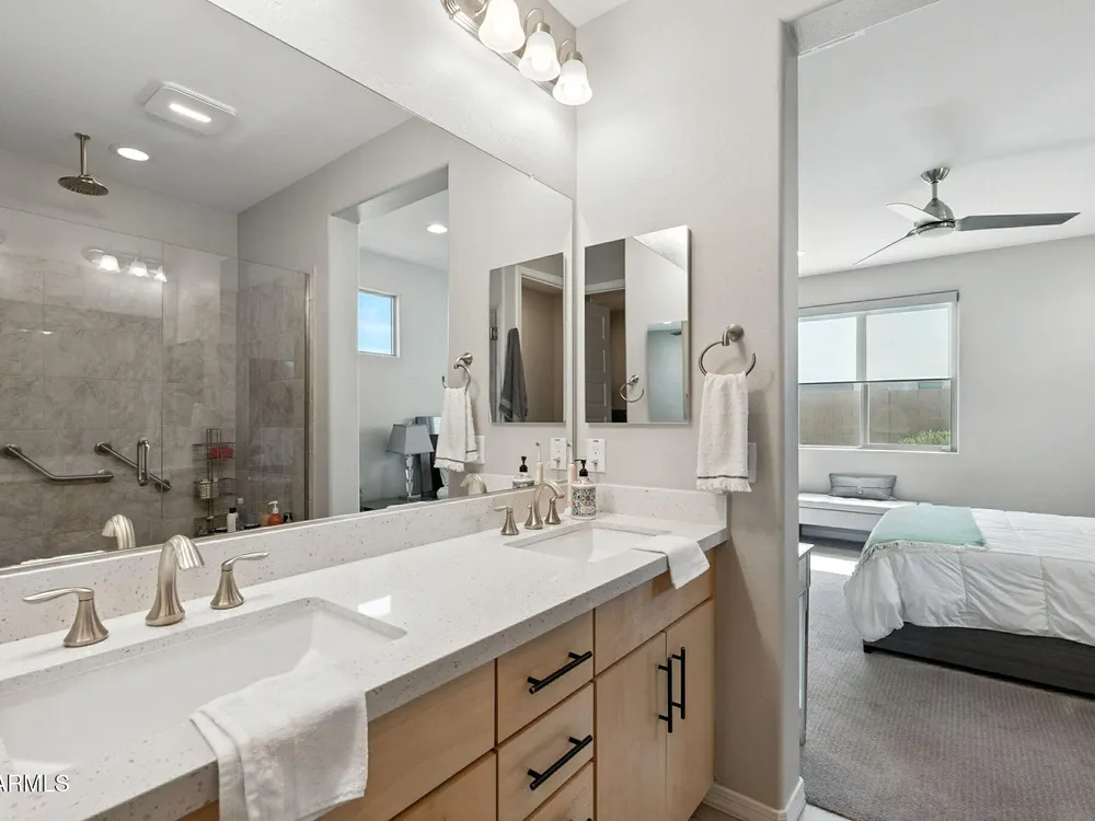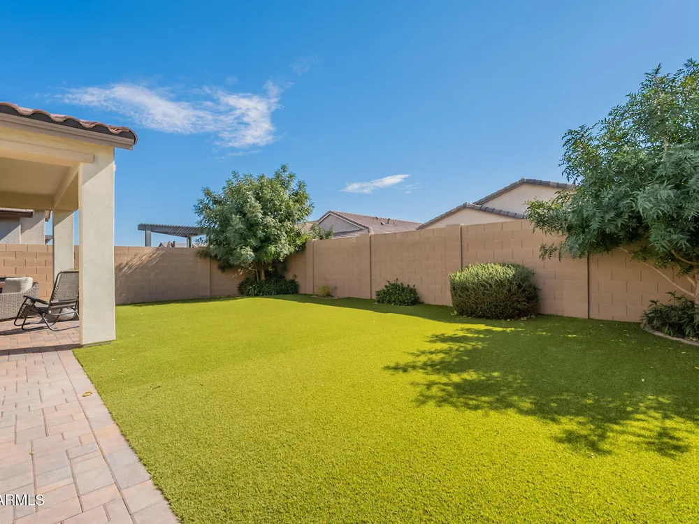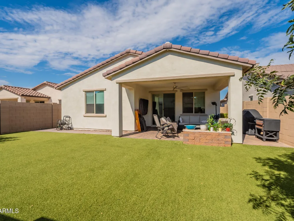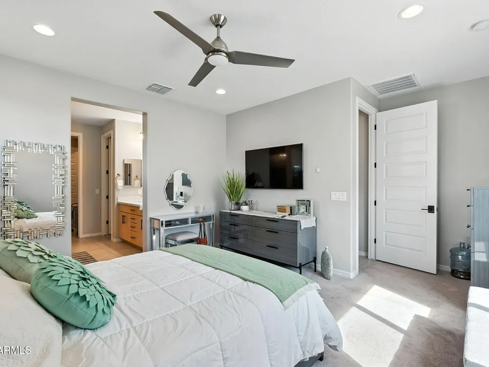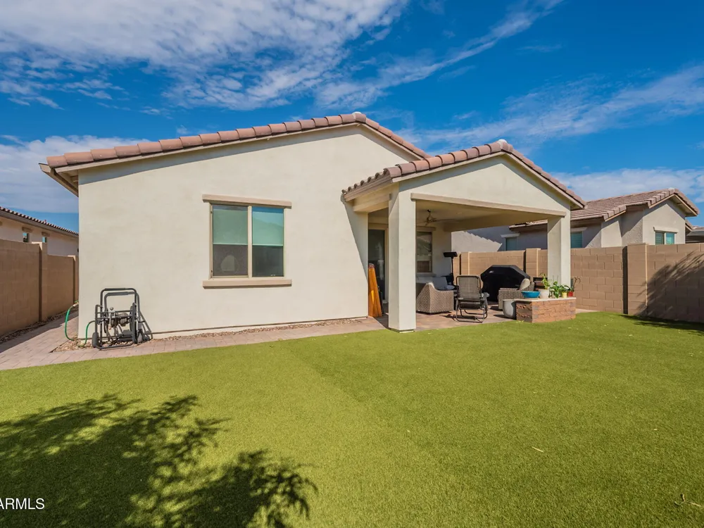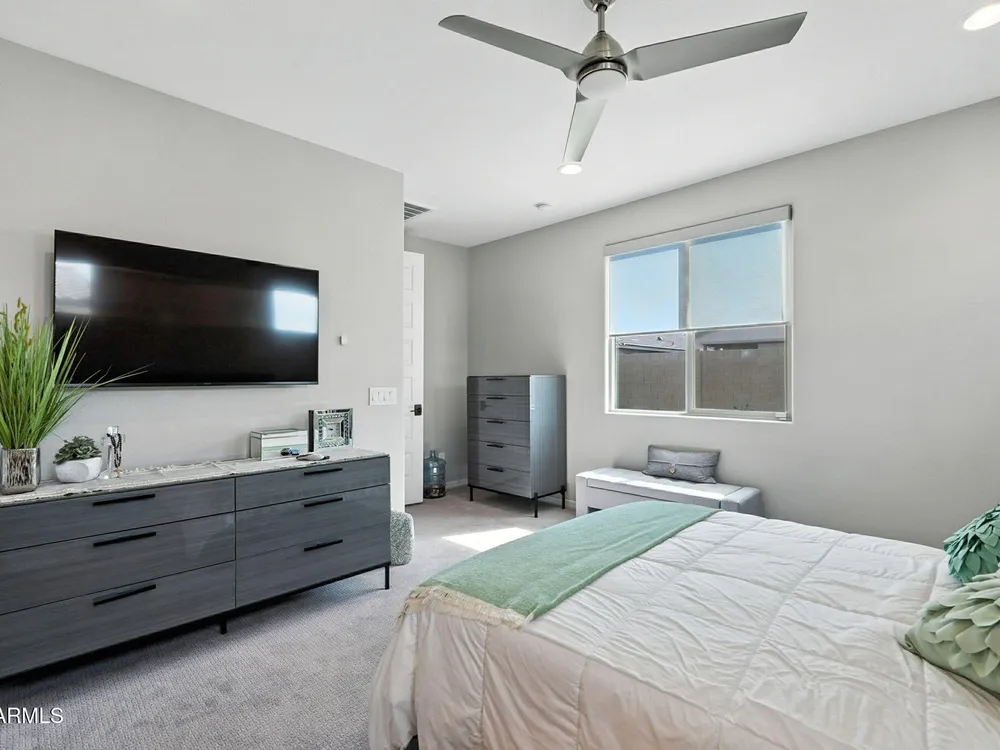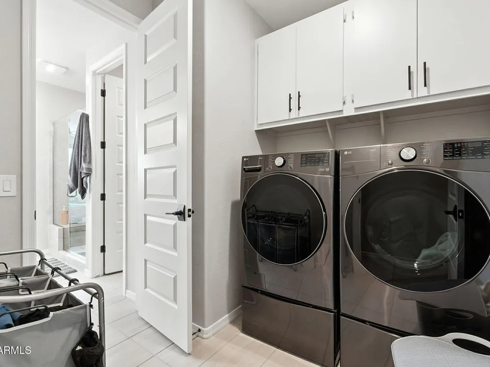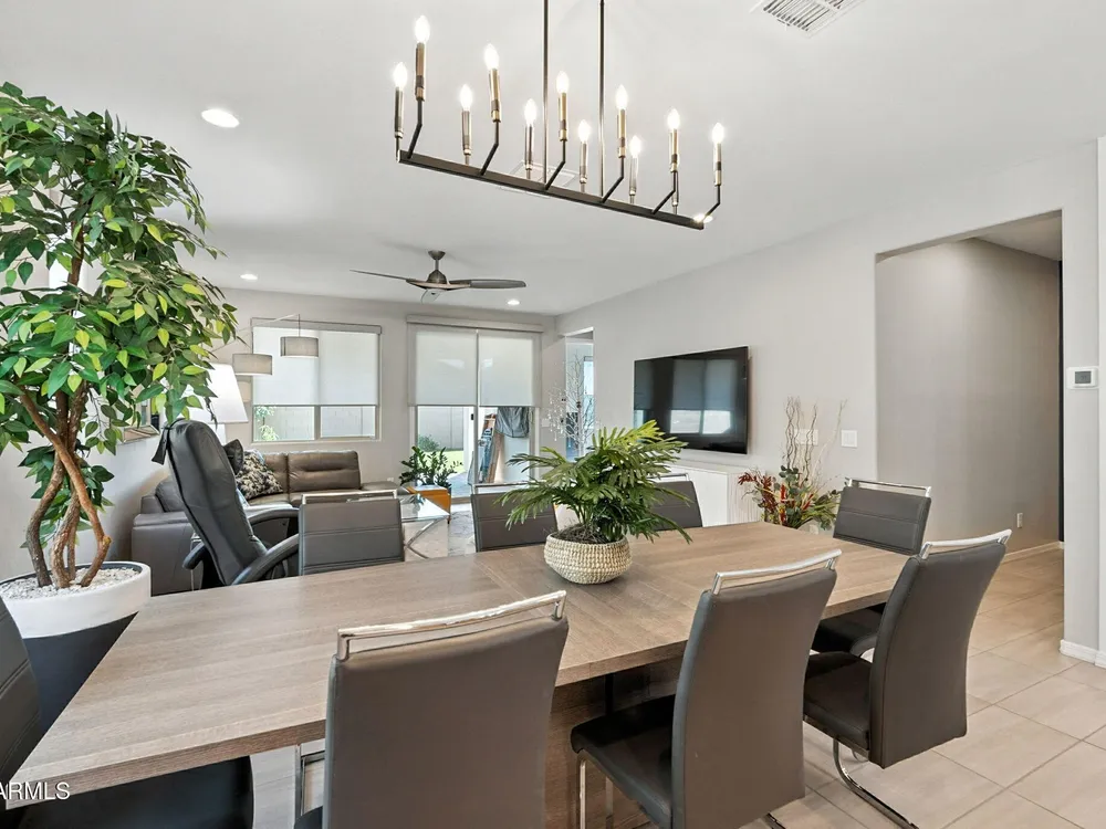 Stunning 2 bedroom, 2 bath home with a den in the 55+ community of Encore at Eastmark. Home is highly upgraded! Enter the home through the large iron door and front patio w/ iron gates.Home features great room concept with eat in kitchen. Kitchen has upgraded cabinets that roll out, panty, large island with R/O, stainless appliances including refrigerator, gas range/oven, granite counters and tiled backsplash. Primary bedroom has a spacious shower, dual sinks, granite counters, large walk in closet with access to the laundry room ( washer and dryer are 2 months old and covey). Home has upgraded fans and light fixtures, automatic blinds and decorative walls. Backyard is easy to maintain with covered patio, tv, and upgraded turf. Garage has epoxy floors, refrigerator & additional storage.