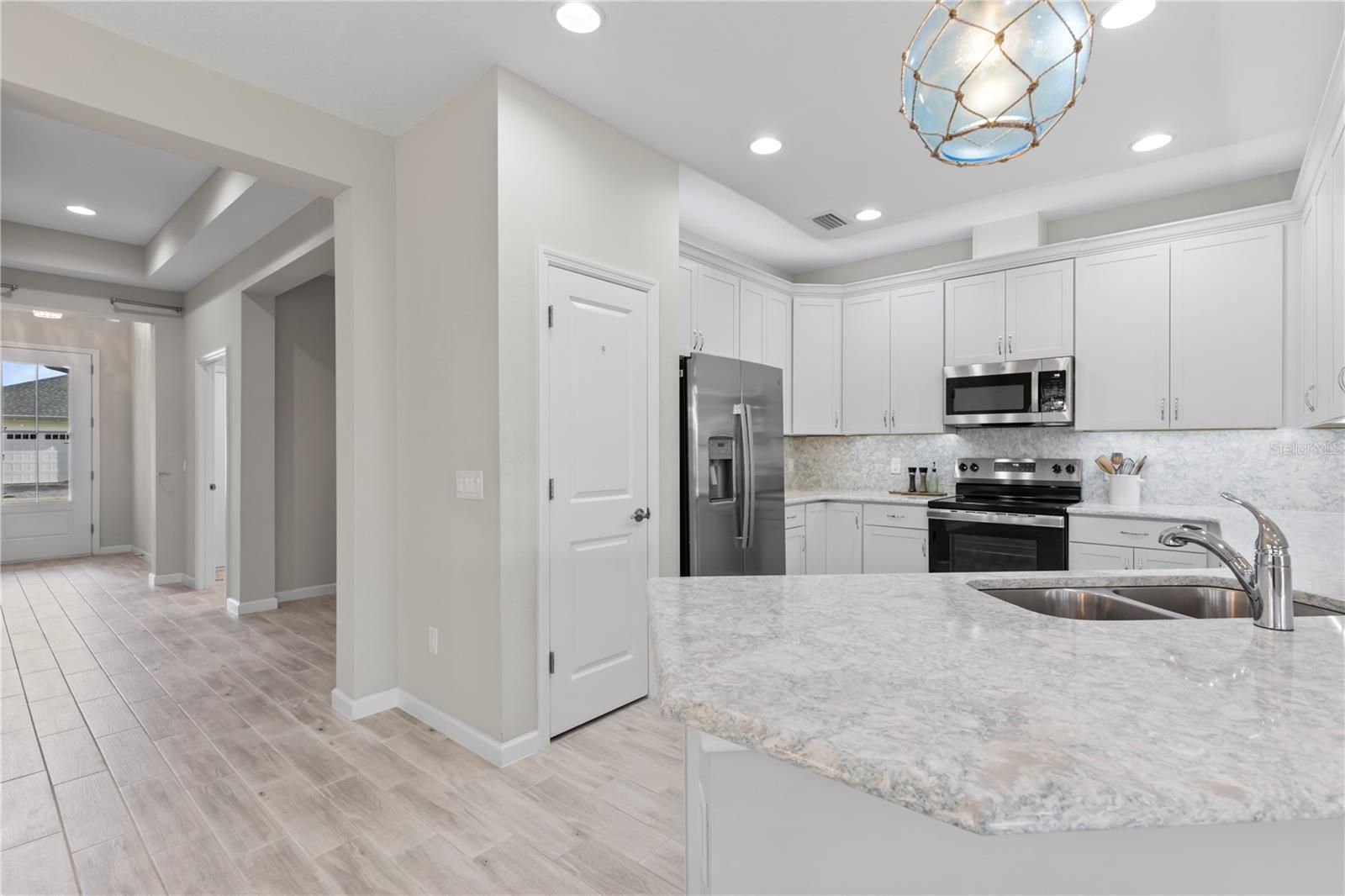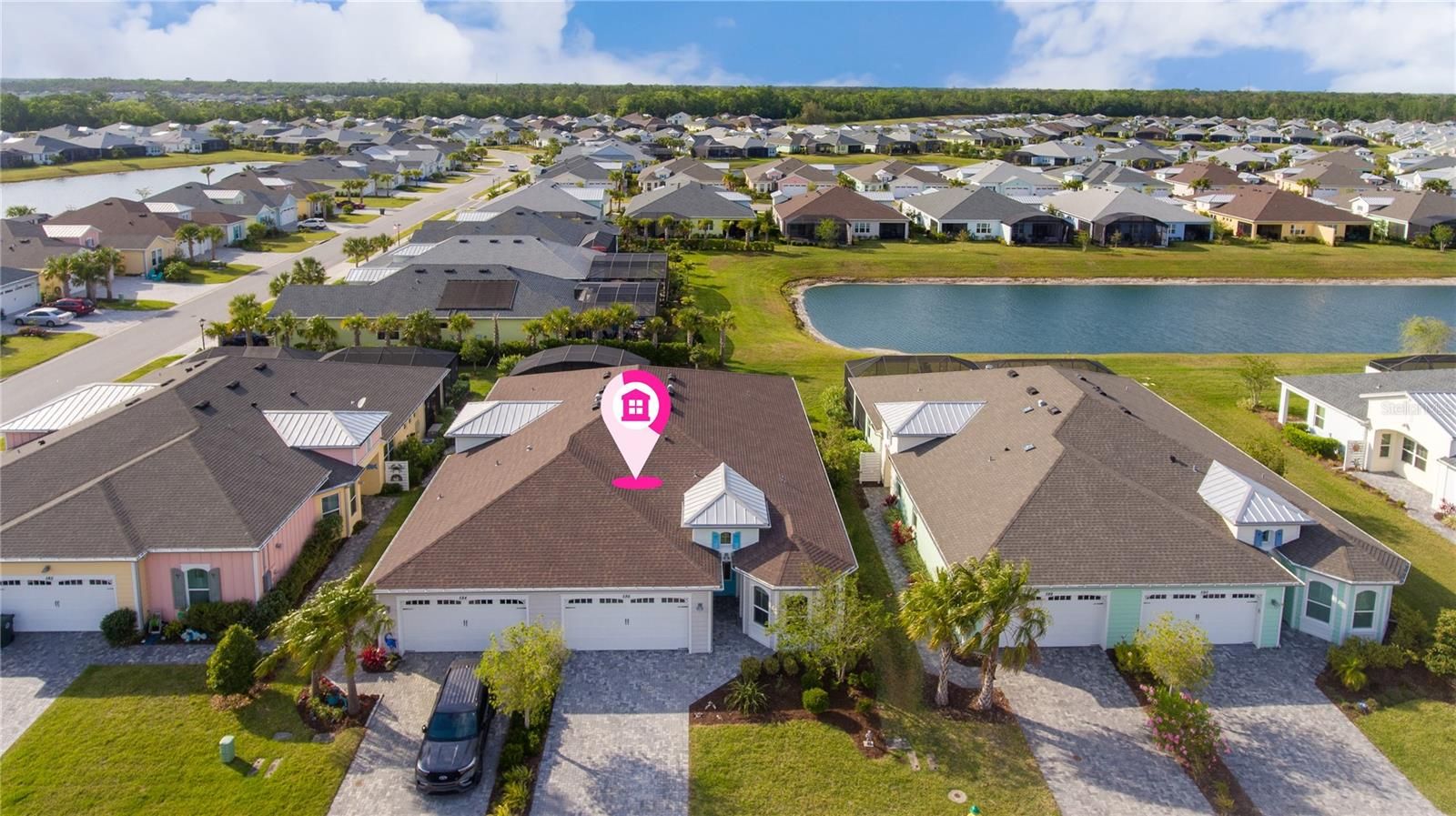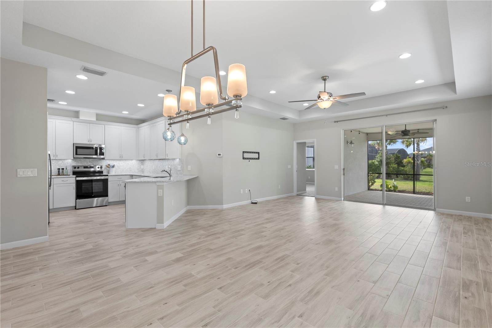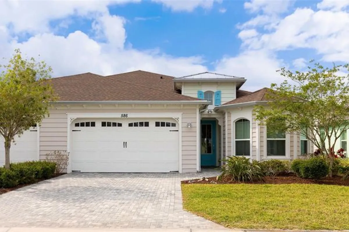 Step right in to your new home in this vibrant 55+ community of Latitude Daytona Beach! This beautiful villa, known as the ''Nevis model,'' boasts 1,862 square feet of living space. The kitchen features brand new, never-before-used stainless steel appliances, a pantry, and ample counter space. You'll appreciate the plank tile flooring throughout, beautifully complemented by fresh carpeting in both the primary suite and the second bedroom. The den can serve as a third bedroom, while an additional room offers options for a game room, bar area, or extra sitting space. A spacious laundry room (with washer and dryer included) and a 2-car garage with epoxy flooring complete this fantastic home. It truly feels brand new! Enjoy your morning coffee or evening cocktails on your lanai as you take in the serene pond view. You'll also have access to exceptional amenities, such as resort-style pools, a fitness center featuring an indoor lap pool, a band shell for weekly live performances, a restaurant and bar, parks, a dog park, and even a private beach club with transportation. If you're ready to embrace your best life, this is the ideal place for you!