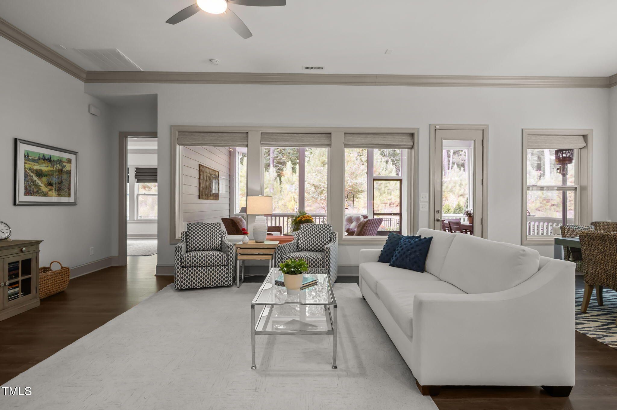 Simply stunning! One of the largest one level floor plans in the Encore neighborhood, this home shows like a model with significant high-end details and custom finishes. Enjoy a fabulous flow and design, from the foyer to the great room and expansive screened-in porch. The owners retreat is discretely tucked away, with forever green views. Everyone has their own space in the huge ensuite with separate vanities, a soaking tub and zero-entry walk-in shower with a stone accent wall. An amazing walk-in closet features an island and custom shelving for keeping everything organized. Enjoy direct access to the laundry room (with sink) from the primary closet. The centrally located den/office can also be used as a formal dining space. Enjoy time with four-legged family members in the fully fenced in backyard. Time to live your best life in this highly sought-after, 55+ community with incredible amenities. Encore residents relish their private clubhouse and pool, PLUS access to all of Briar Chapel's biking & running paths, racquet courts, theme park-like pool (daily pass), and fitness room.