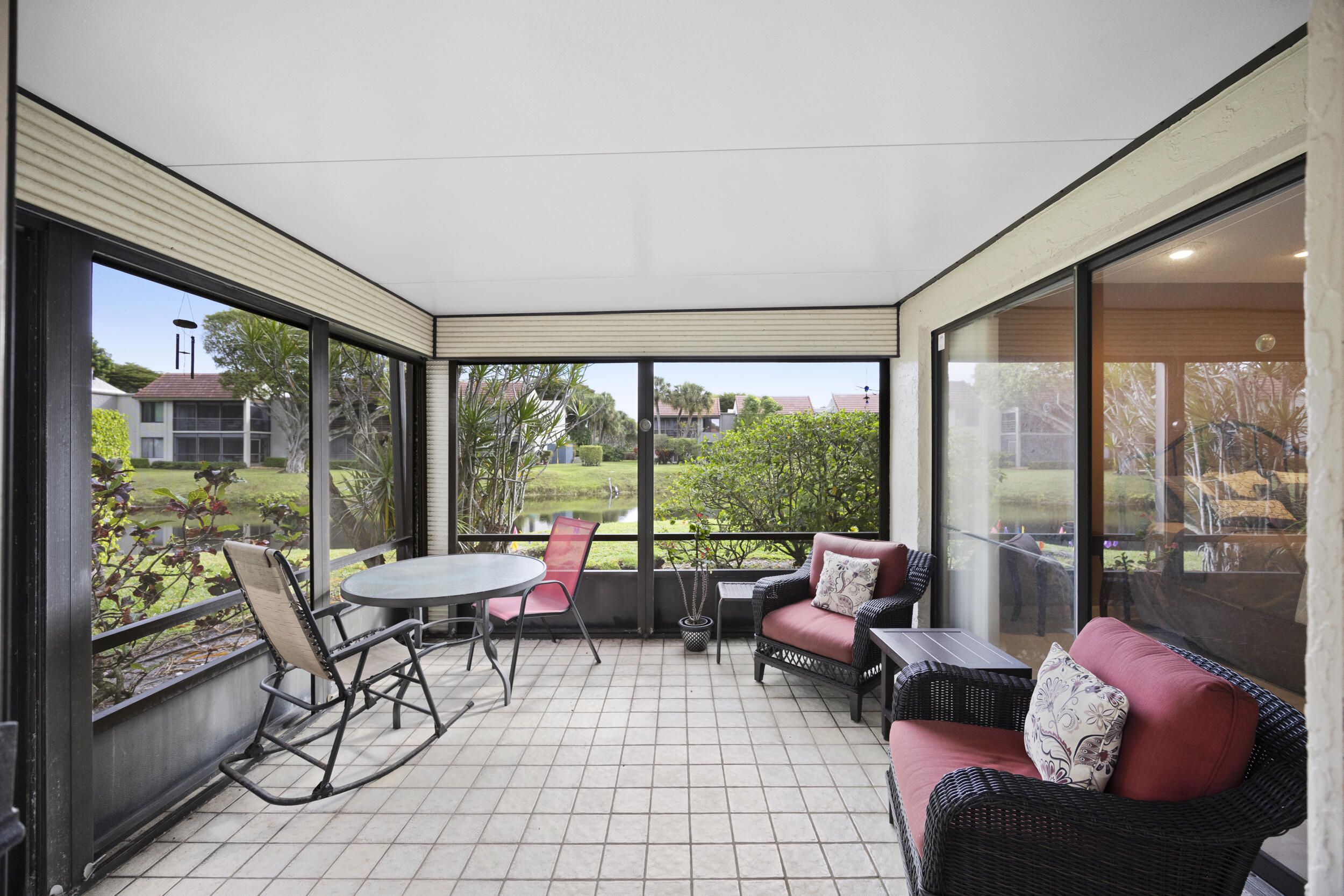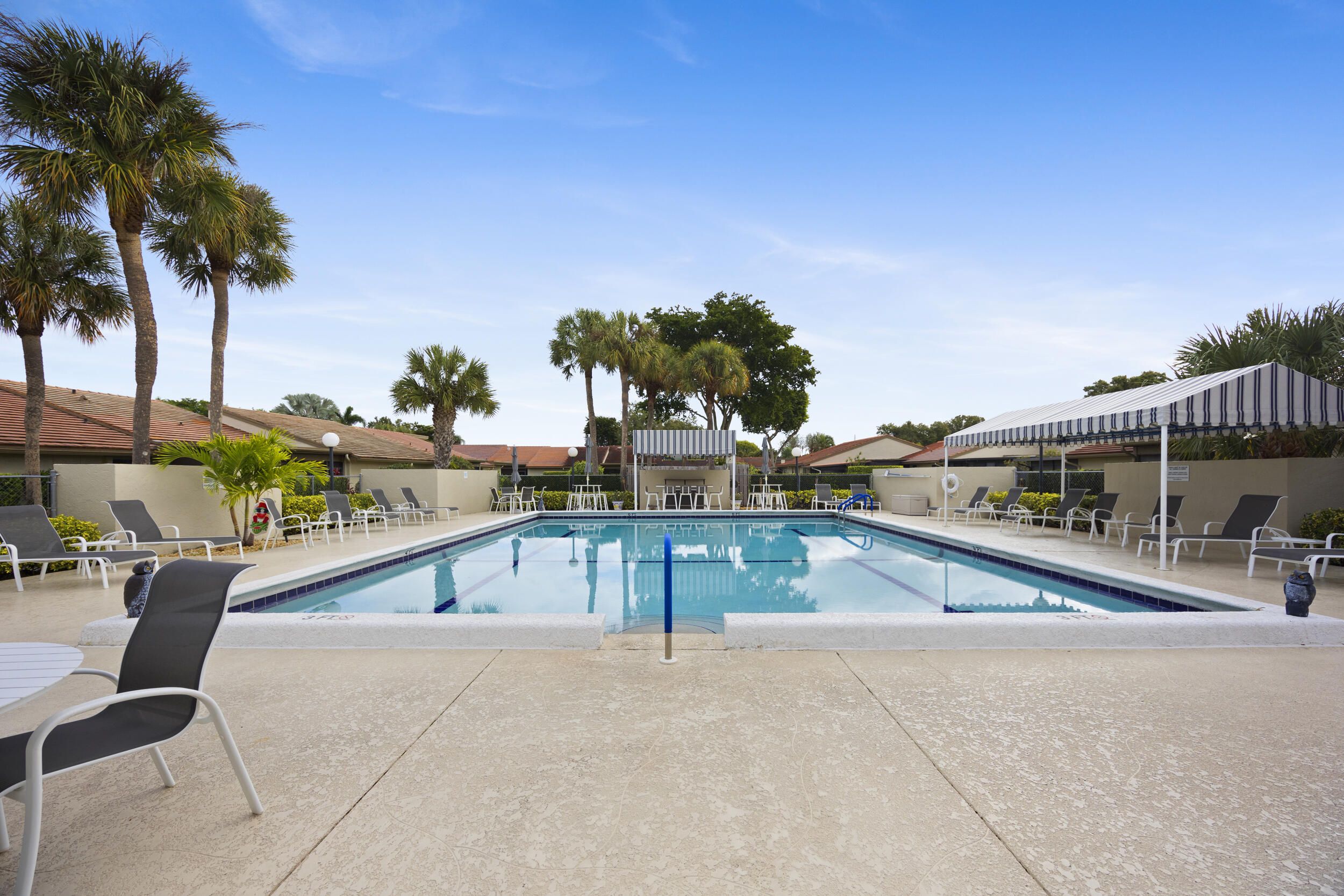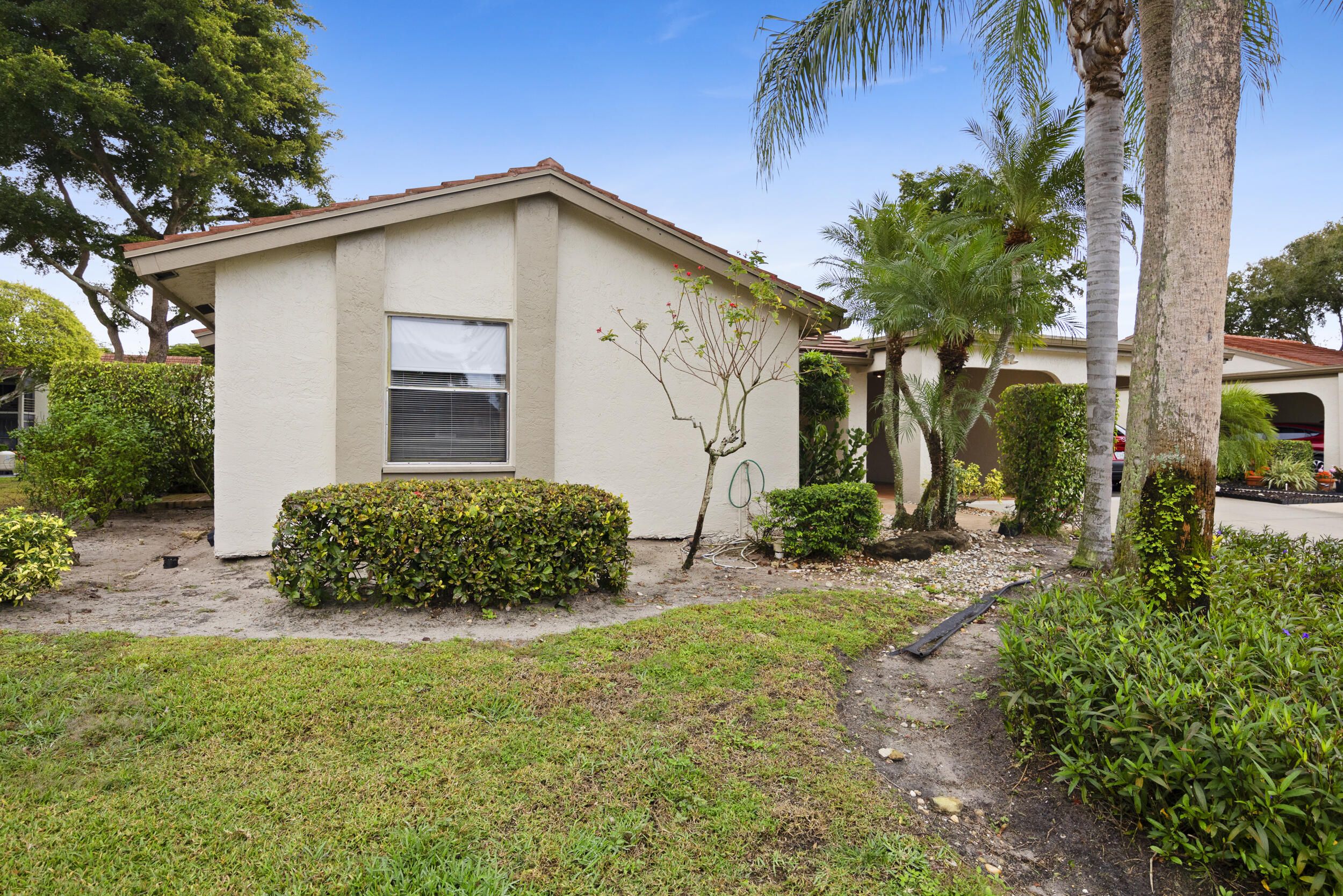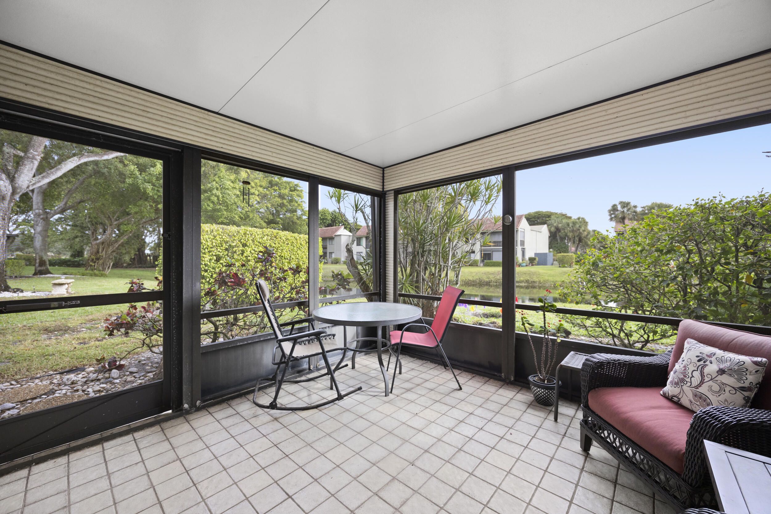 Welcome to this beautifully maintained end-unit villa offering 3 bedrooms and 2 baths in a desirable active 55+ community. The spacious layout includes a bright living room, formal dining area, Florida room, and a convenient interior laundry room. Enjoy peaceful water views from the screened-in patio, perfect for morning coffee or relaxing evenings. This villa features ample storage, a private carport, and the added privacy of an end unit. Aggressively priced and move-in ready, it's an exceptional value. The friendly, well-kept community offers a pool just steps away, a manned 24-hour guard gate, and no mandatory memberships. Ideally located less than 30 minutes from Palm Beach International Airport, with easy access to shopping, dining, & everyday conveniences. A fantastic opportunity to enjoy comfort, security, and an active lifestyle...don't miss it! Seller will even leave all furnishings behind if the buyer prefers!