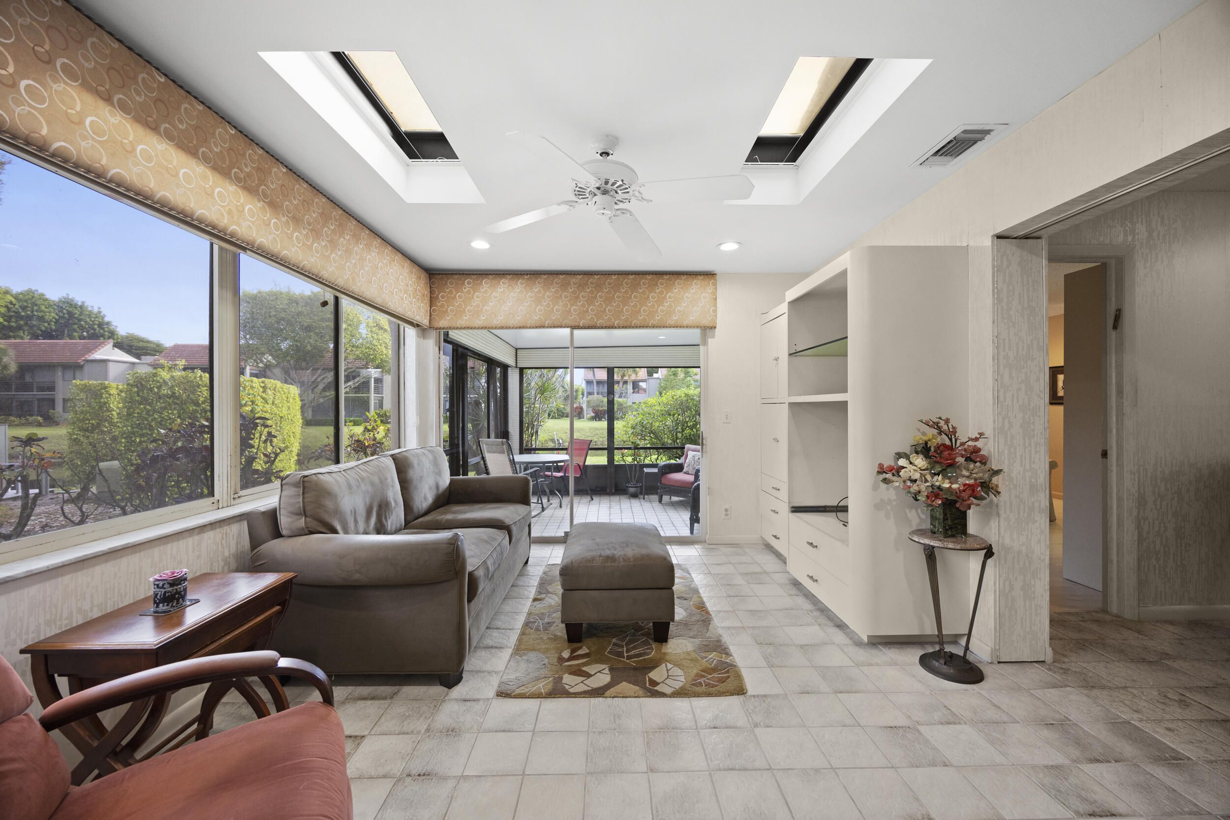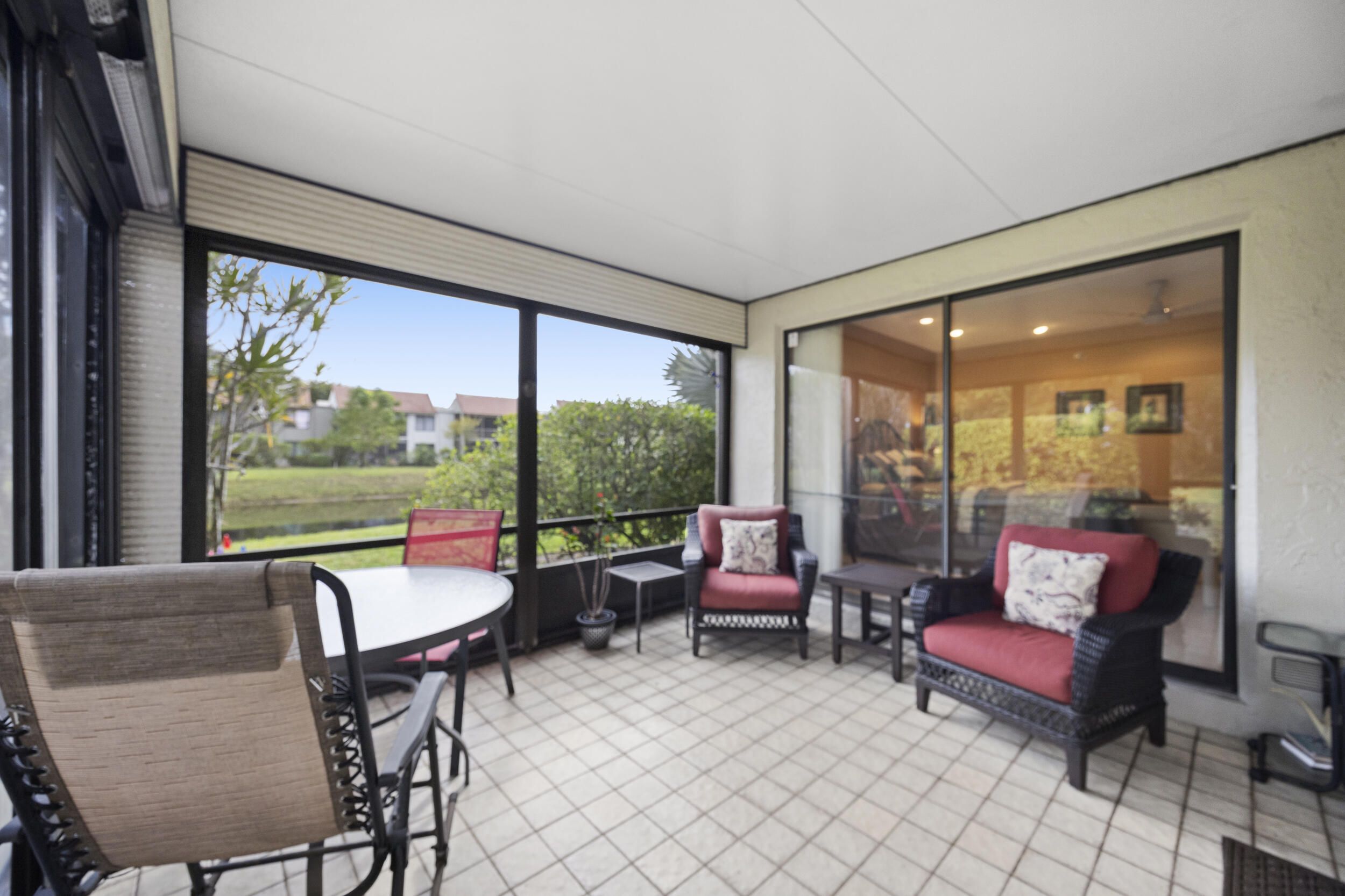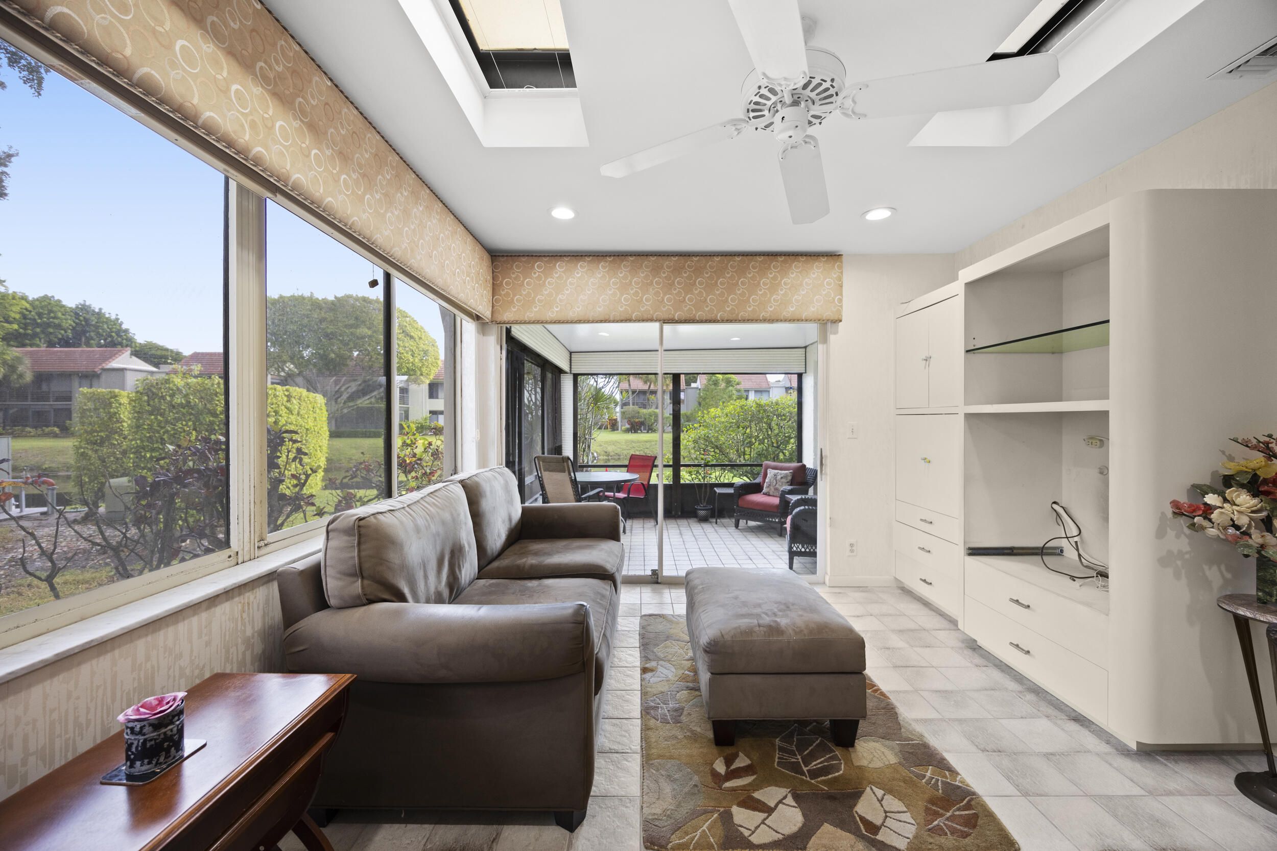 Welcome to this beautifully maintained end-unit villa offering 3 bedrooms and 2 baths in a desirable active 55+ community. The spacious layout includes a bright living room, formal dining area, Florida room, and a convenient interior laundry room. Enjoy peaceful water views from the screened-in patio, perfect for morning coffee or relaxing evenings. This villa features ample storage, a private carport, and the added privacy of an end unit. Aggressively priced and move-in ready, it's an exceptional value. The friendly, well-kept community offers a pool just steps away, a manned 24-hour guard gate, and no mandatory memberships. Ideally located less than 30 minutes from Palm Beach International Airport, with easy access to shopping, dining, & everyday conveniences. A fantastic opportunity to enjoy comfort, security, and an active lifestyle...don't miss it! Seller will even leave all furnishings behind if the buyer prefers!