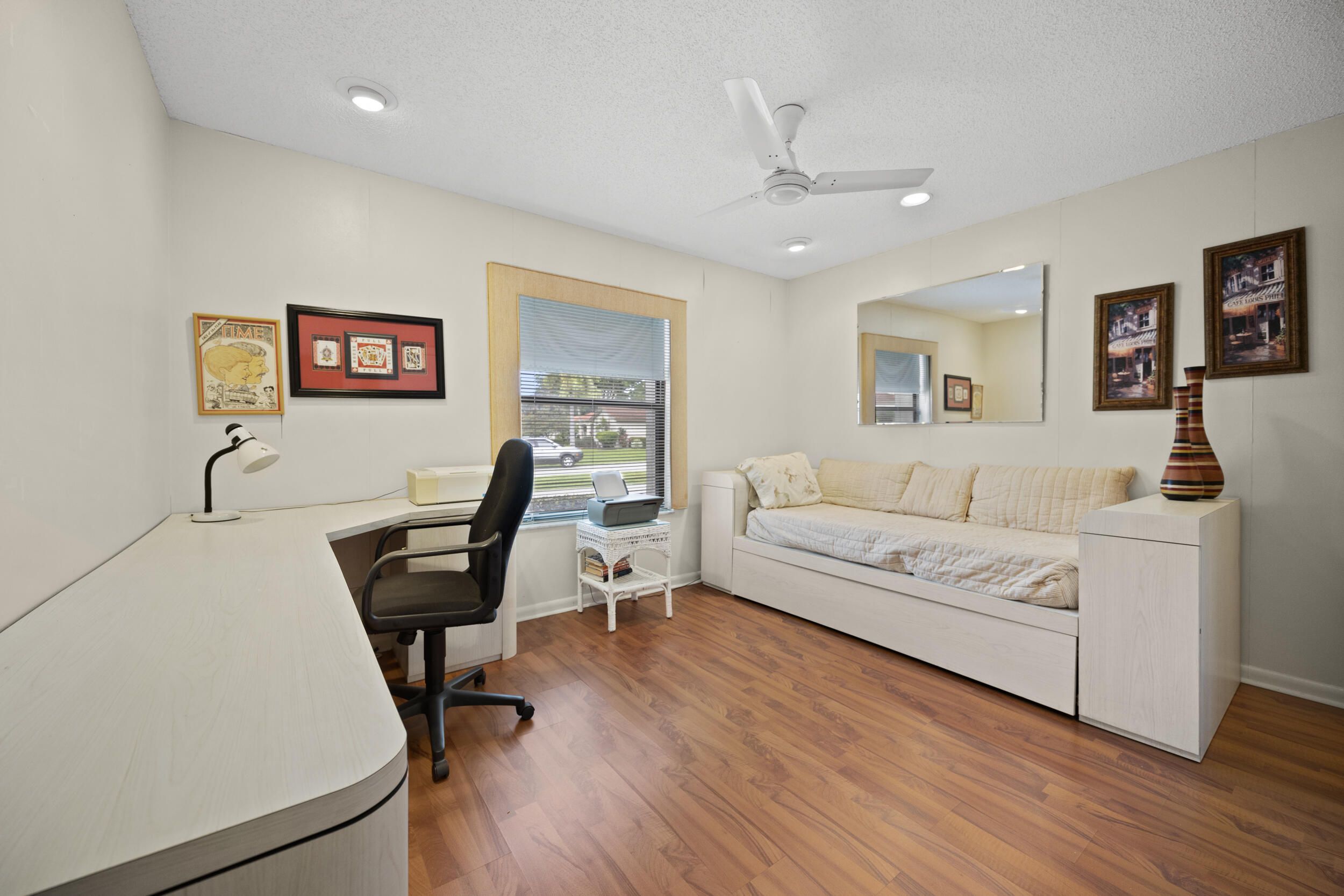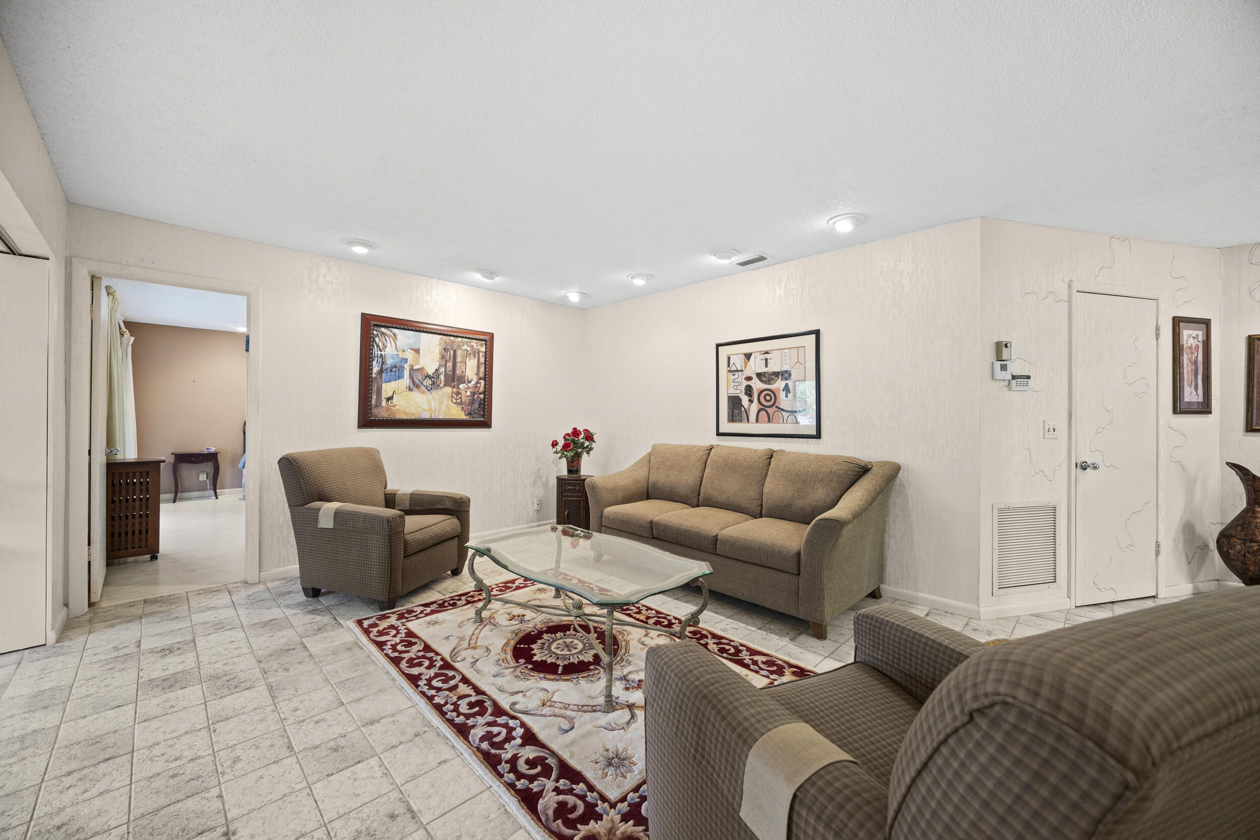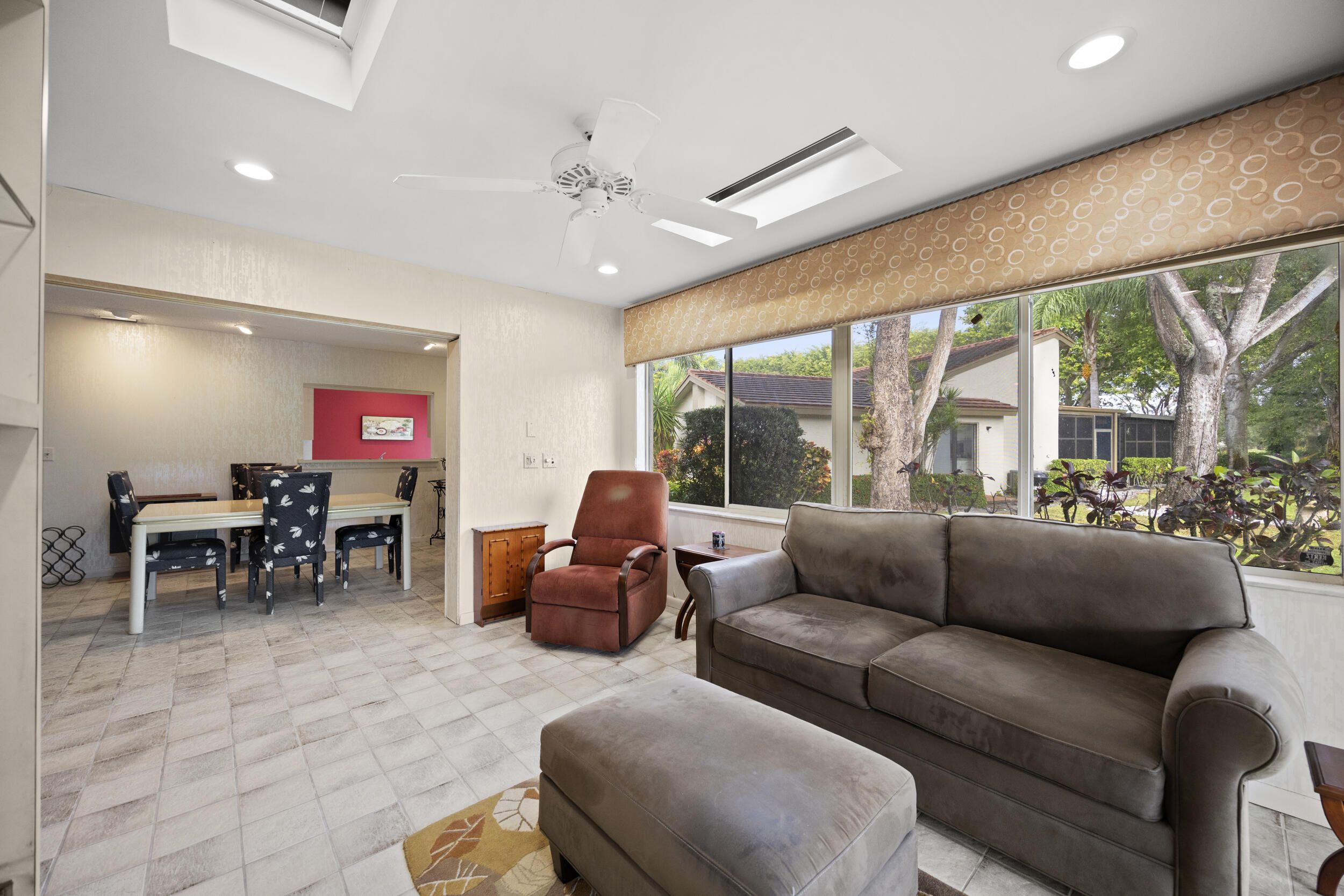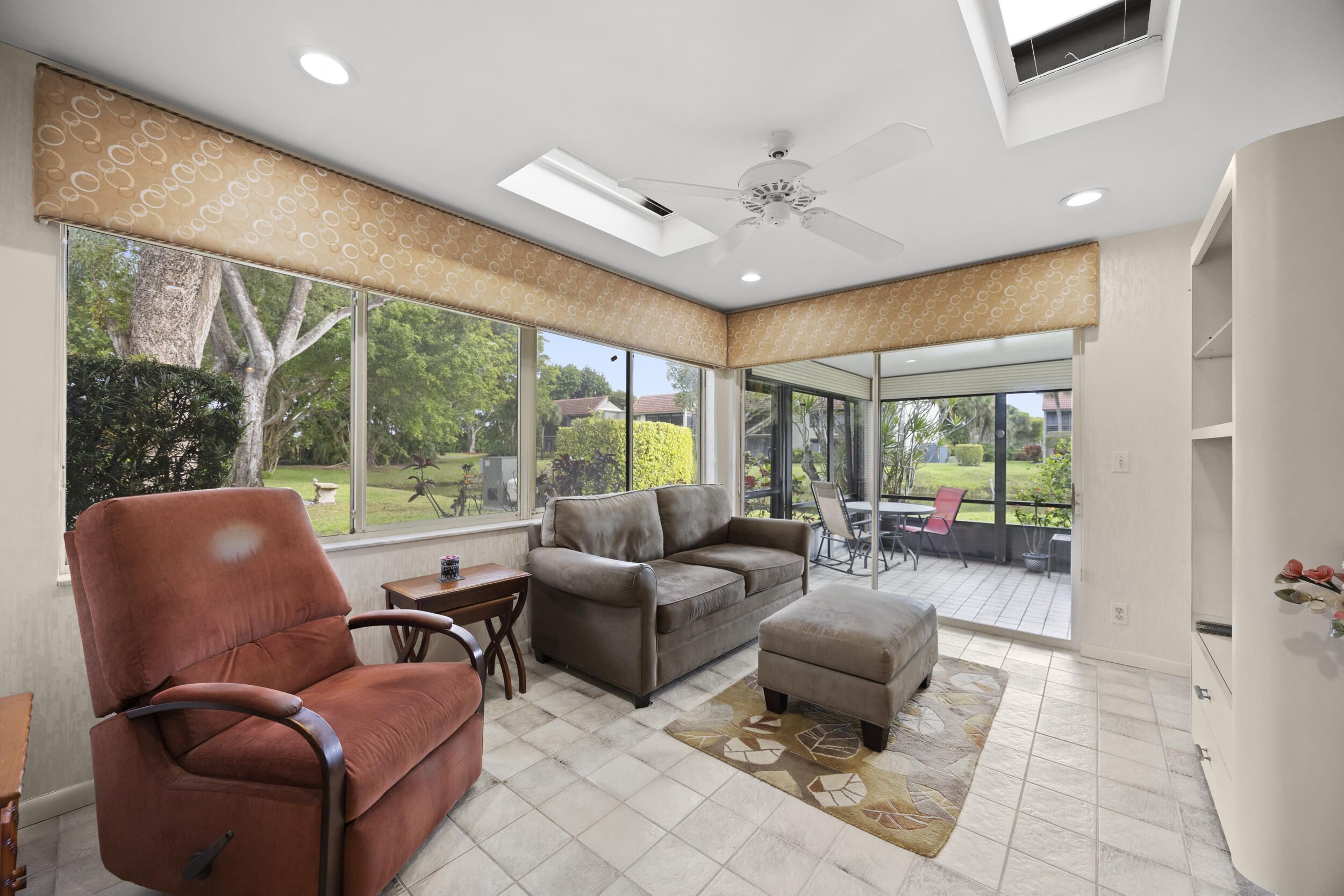 Welcome to this beautifully maintained end-unit villa offering 3 bedrooms and 2 baths in a desirable active 55+ community. The spacious layout includes a bright living room, formal dining area, Florida room, and a convenient interior laundry room. Enjoy peaceful water views from the screened-in patio, perfect for morning coffee or relaxing evenings. This villa features ample storage, a private carport, and the added privacy of an end unit. Aggressively priced and move-in ready, it's an exceptional value. The friendly, well-kept community offers a pool just steps away, a manned 24-hour guard gate, and no mandatory memberships. Ideally located less than 30 minutes from Palm Beach International Airport, with easy access to shopping, dining, & everyday conveniences. A fantastic opportunity to enjoy comfort, security, and an active lifestyle...don't miss it! Seller will even leave all furnishings behind if the buyer prefers!