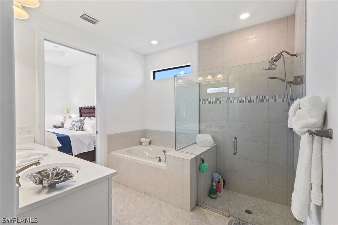 - Bedroom on Main Level, Bathtub, Tray Ceiling(s), Dual Sinks, Family/Dining Room, French Door(s)/Atrium Door(s), Kitchen Island, Living/Dining Room, Main Level Primary, Pantry, Separate Shower, Cable TV, Walk-In Pantry, Walk-In Closet(s), Window Treatments, Split Bedrooms
