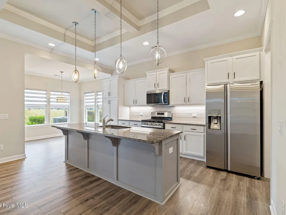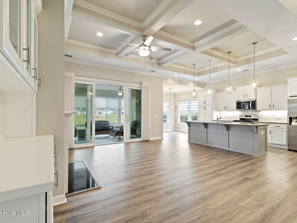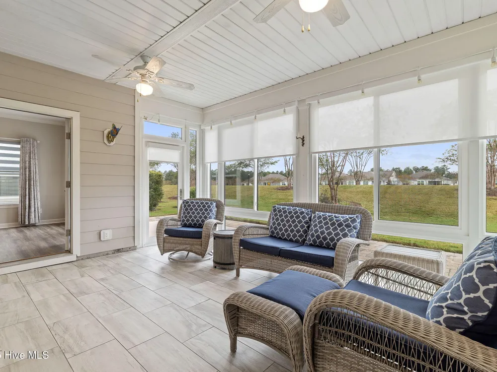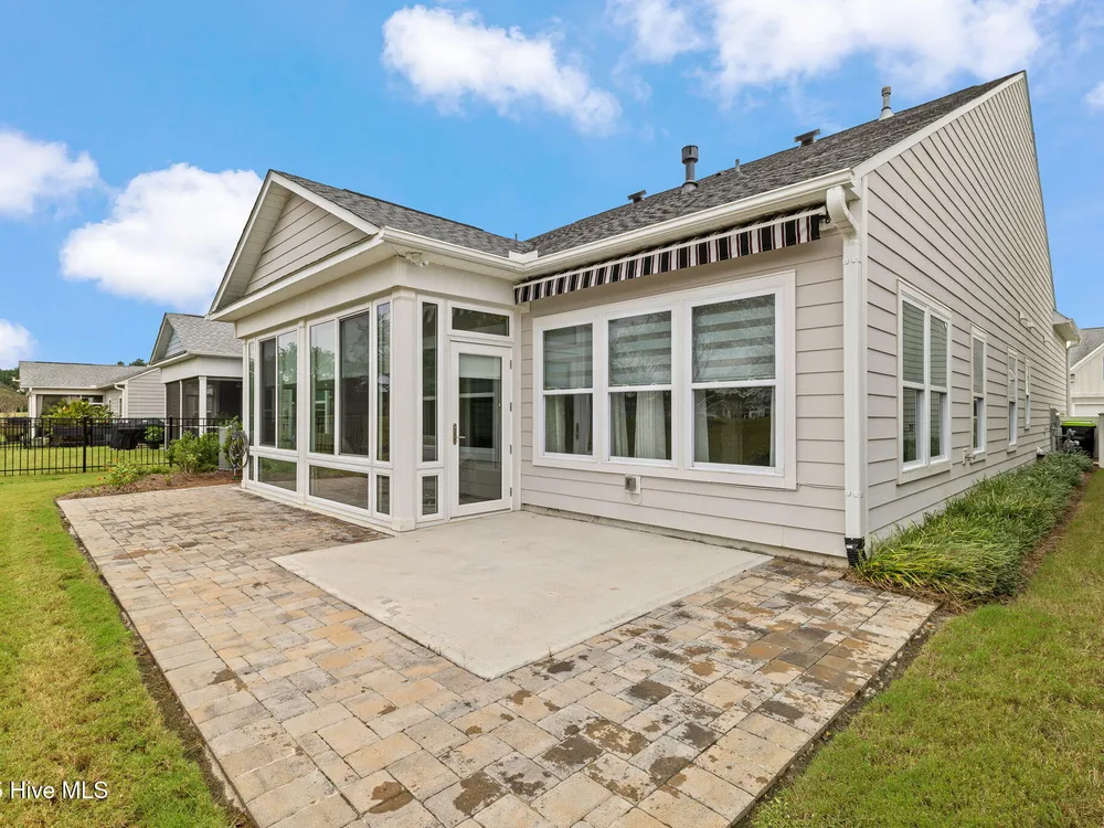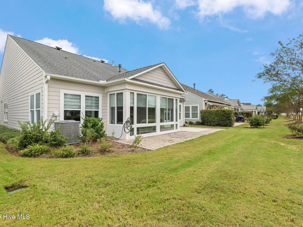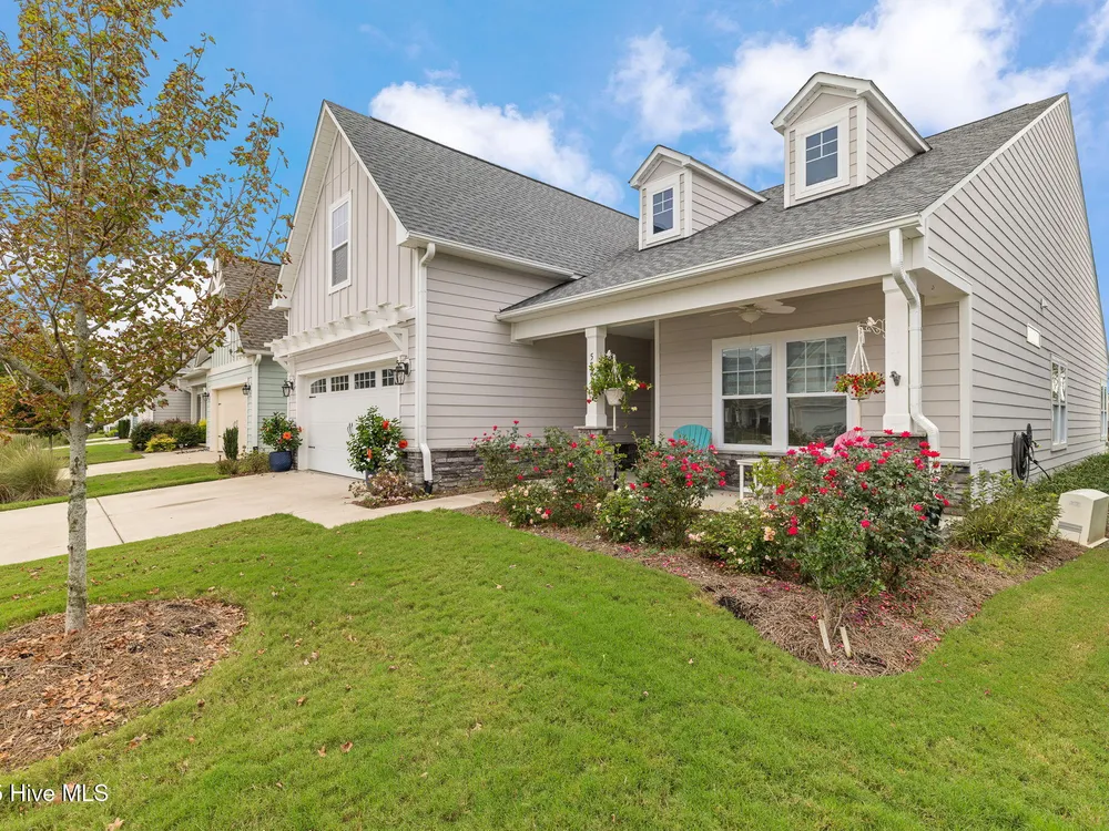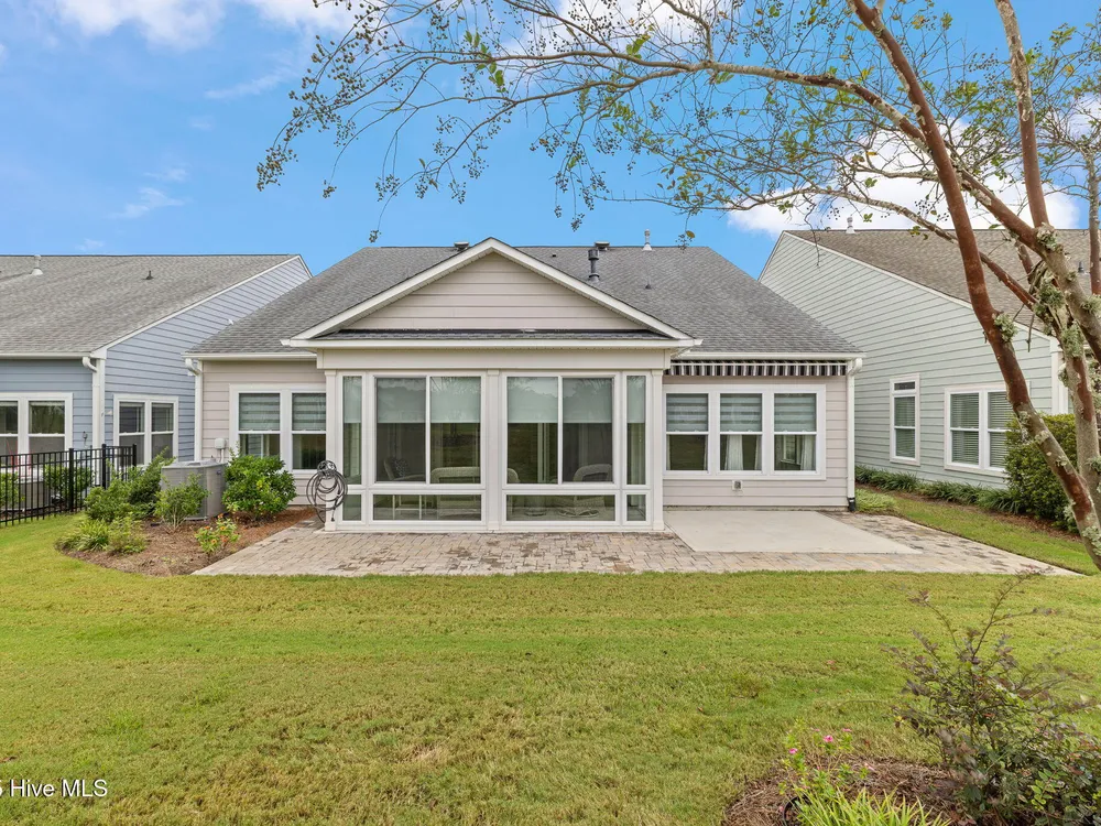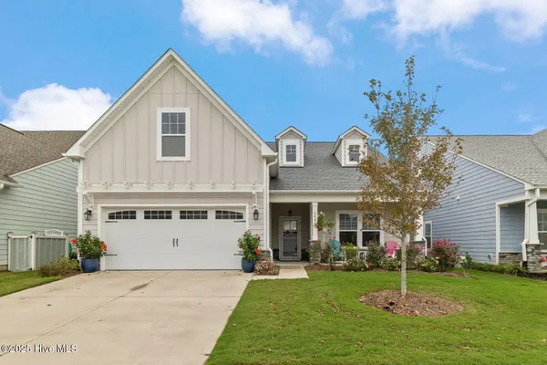 Beautifully maintained and full of thoughtful upgrades, this Brunswick Forest 3 bedroom, 3 bath charming home of 2,445 square feet is a rare find! Built in 2020 in the coveted section of Park West, you will be impressed from the moment you arrive by the lovely landscaping, covered front porch, and elegant entrance. Stepping inside this immaculate home, you'll notice the meticulous craftsmanship, 10-foot coffered ceilings, designer window coverings, contemporary LVP flooring throughout all living spaces and the primary suite, and overall attention to detail. Just past a spacious secondary bedroom with full hall bathroom, you are greeted by the large, open living room featuring a cozy gas fireplace, elegant trey ceiling with ceiling fan, beautifully custom-crafted cabinets, and expansive windows. The light-filled kitchen is a showstopper with abundant cabinets, roll out drawers, stunning granite countertops, subway tile backsplash, stainless steel appliances, butler's pantry/coffee station, large pantry, and center kitchen island. A sunny breakfast nook offers everyday dining, and a formal dining room off the kitchen offers space for all your special occasions. You'll delight in the 8x16 glassed sunroom enclosure with porcelain floors with enough room for relaxing and entertaining year-round. Beyond the enclosed sunroom you will find an enlarged outside rear patio with awning to enjoy your beautiful coastal lifestyle. The downstairs primary bedroom with tray ceiling offers lots of natural light and features a spacious sitting room/office space with direct access to the porch. The upgraded master bathroom boasts a luxurious walk-in shower, dual sinks, and huge custom-designed closet. The spacious laundry room is located off the main entrance. Upstairs, you'll find a private bedroom and a full bathroom. A spacious 2-car garage with shelving features plenty of room for oversized vehicles.