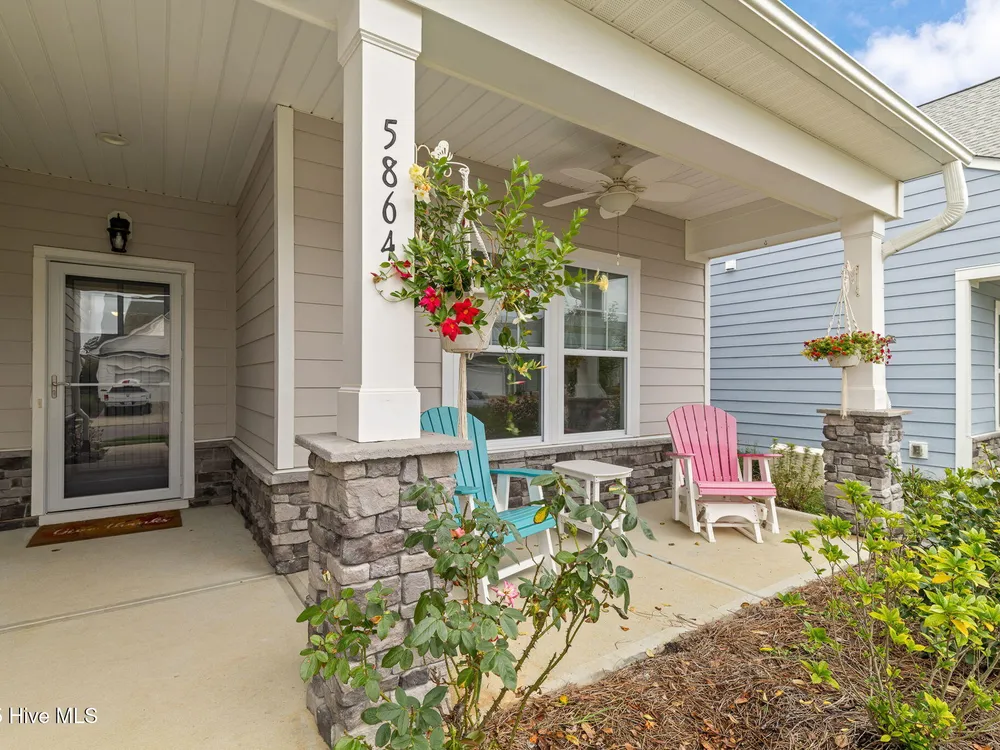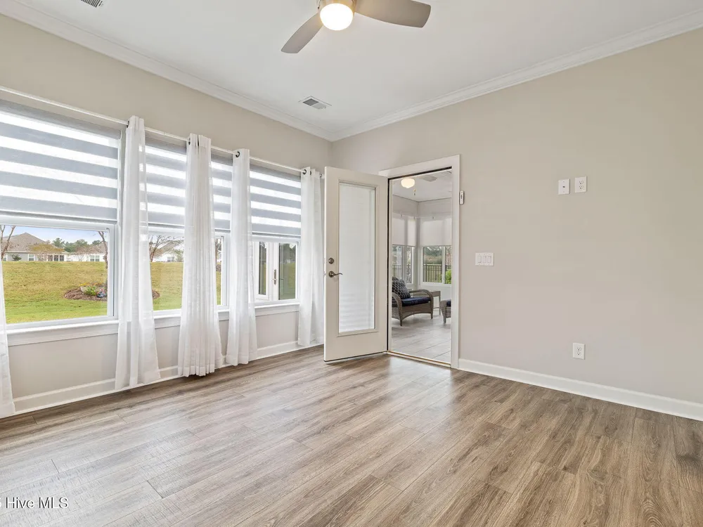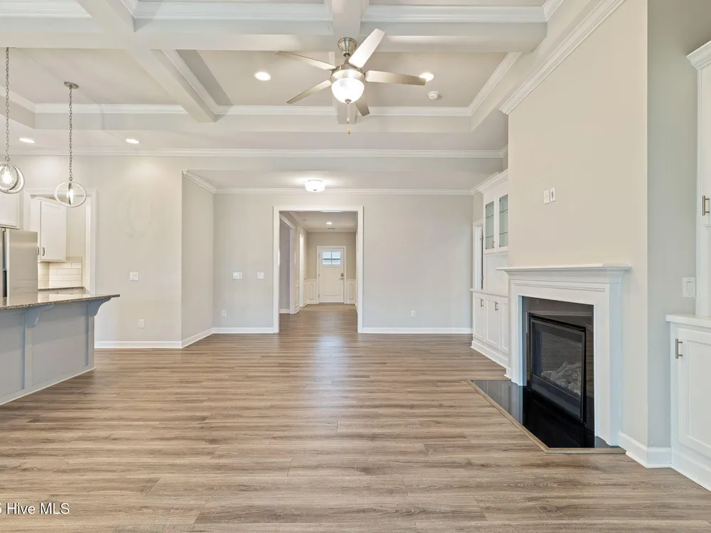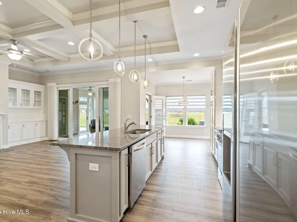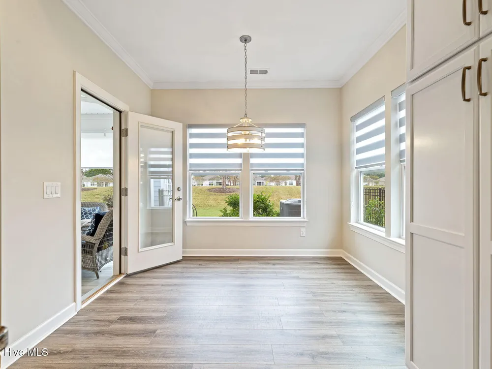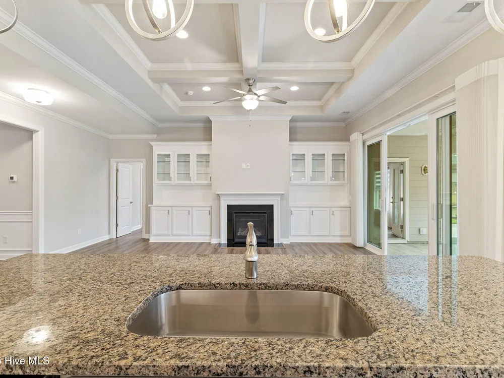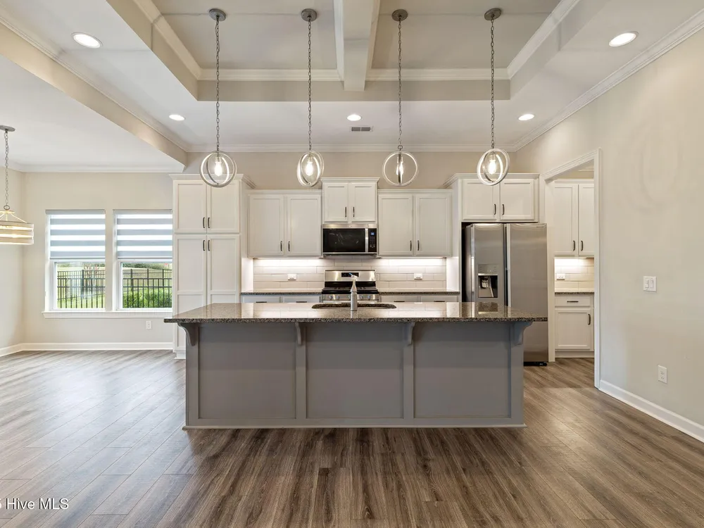 Beautifully maintained and full of thoughtful upgrades, this Brunswick Forest 3 bedroom, 3 bath charming home of 2,445 square feet is a rare find! Built in 2020 in the coveted section of Park West, you will be impressed from the moment you arrive by the lovely landscaping, covered front porch, and elegant entrance. Stepping inside this immaculate home, you'll notice the meticulous craftsmanship, 10-foot coffered ceilings, designer window coverings, contemporary LVP flooring throughout all living spaces and the primary suite, and overall attention to detail. Just past a spacious secondary bedroom with full hall bathroom, you are greeted by the large, open living room featuring a cozy gas fireplace, elegant trey ceiling with ceiling fan, beautifully custom-crafted cabinets, and expansive windows. The light-filled kitchen is a showstopper with abundant cabinets, roll out drawers, stunning granite countertops, subway tile backsplash, stainless steel appliances, butler's pantry/coffee station, large pantry, and center kitchen island. A sunny breakfast nook offers everyday dining, and a formal dining room off the kitchen offers space for all your special occasions. You'll delight in the 8x16 glassed sunroom enclosure with porcelain floors with enough room for relaxing and entertaining year-round. Beyond the enclosed sunroom you will find an enlarged outside rear patio with awning to enjoy your beautiful coastal lifestyle. The downstairs primary bedroom with tray ceiling offers lots of natural light and features a spacious sitting room/office space with direct access to the porch. The upgraded master bathroom boasts a luxurious walk-in shower, dual sinks, and huge custom-designed closet. The spacious laundry room is located off the main entrance. Upstairs, you'll find a private bedroom and a full bathroom. A spacious 2-car garage with shelving features plenty of room for oversized vehicles.