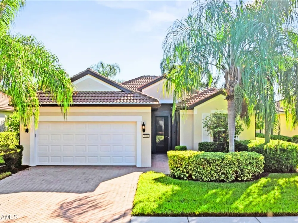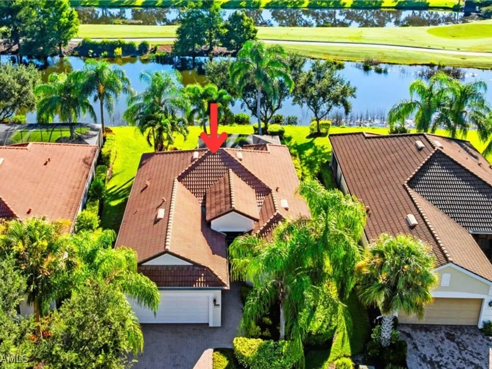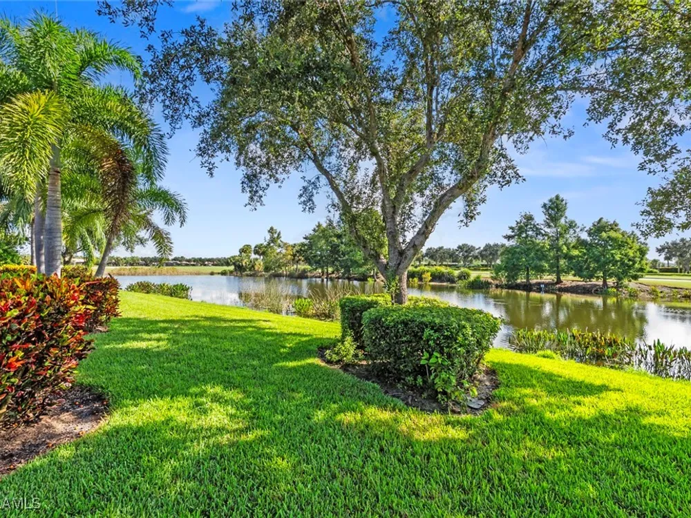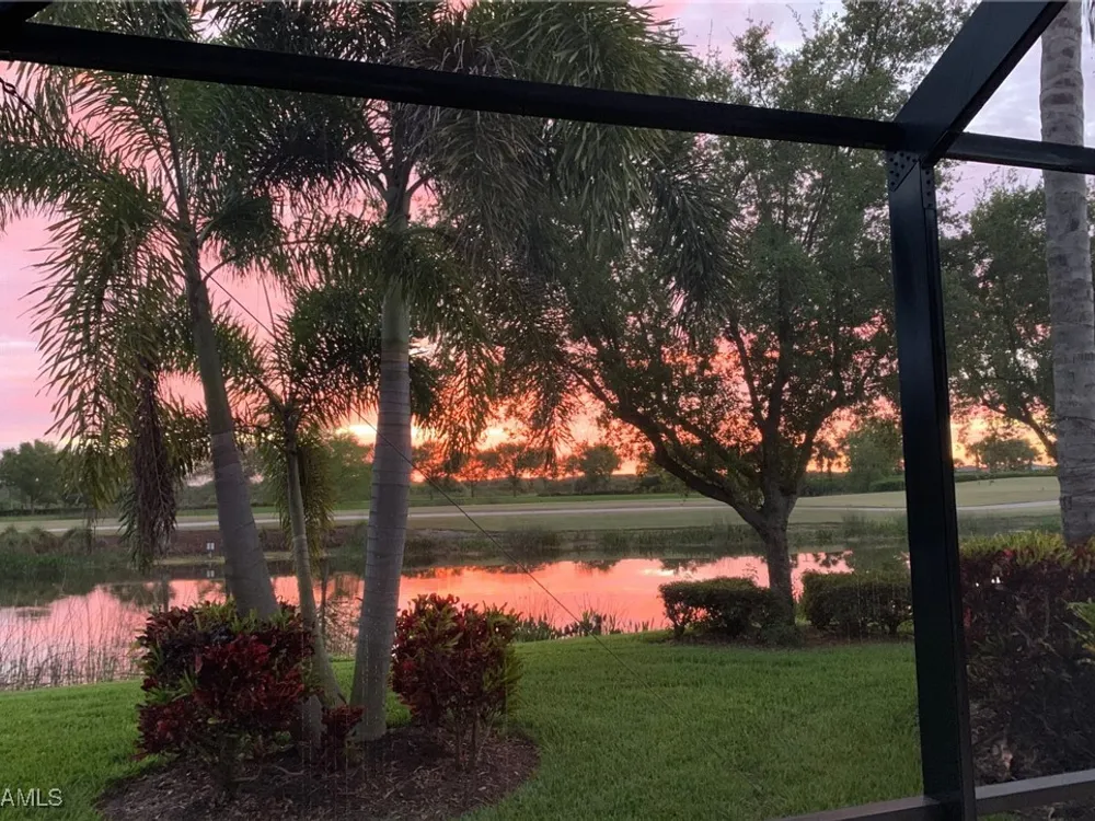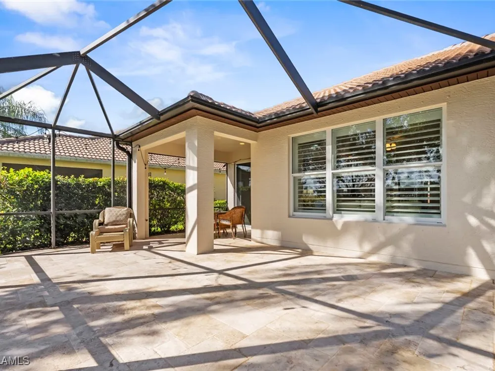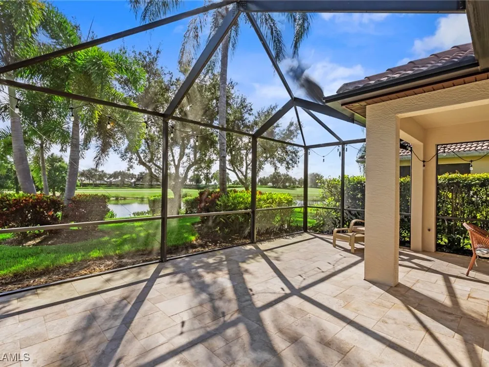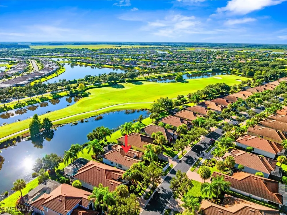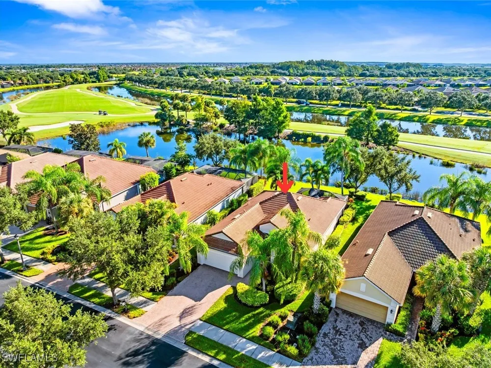 GOLF & WATER VIEWS! Step into this beautifully maintained COPPER RIDGE floor plan in the 55+ Del Webb Naples golf community. Enjoy breathtaking SUNRISES from the oversized EXTENDED LANAI finished with upgraded TRAVERTINE PAVERS - perfect for morning coffee or evening gatherings. Inside, the KITCHEN is appointed with a newer dishwasher, LG refrigerator, and plenty of space for culinary creativity. The PRIMARY SUITE is a private retreat featuring a custom walk-in closet, dual sinks, a walk-in shower, and a relaxing soaking tub. A guest bedroom plus a flexible den provide ideal space for visitors, a home office, or hobbies. ADDITIONAL UPGRADES include a newer washer and dryer, PLANTATION SHUTTERS, wainscoting, luxury vinyl and TILE FLOORING THROUGHOUT, and fresh interior and exterior paint. For peace of mind, the Simply Safe ALARM SYSTEM is equipped with fire and moisture detection, interior/exterior cameras, and motion sensors. With FURNISHINGS NEGOTIABLE, this home is ready to move in NOW!This home comes with the SOCIAL MEMBERSHIP, but take note GOLF LOVERS, Panther Run Golf Club offers optional MEMBERSHIPS with premium golf experiences just steps from your backyard. In Del Webb Naples, you’ll enjoy WORLD-CLASS AMENITIES that rival luxury resorts: dine at the Rusty Putter Restaurant, soak in the RESORT-STYLE or LAP POOLS, break a sweat in the state-of-the-art FITNESS CENTER, and play your way through PICKLEBALL, TENNIS, bocce, billiards - even a top-tier GOLF SIMULATOR! Need groceries, church, or a bite to eat? Just hop in your golf cart and cruise into town - Publix and the heart of Ave Maria are just minutes away. This isn’t just a home - it’s a LIFESTYLE UPGRADE in one of Southwest Florida’s most vibrant 55+ communities. Don’t miss your chance to live where fun, fitness, and friendships flourish year-round!