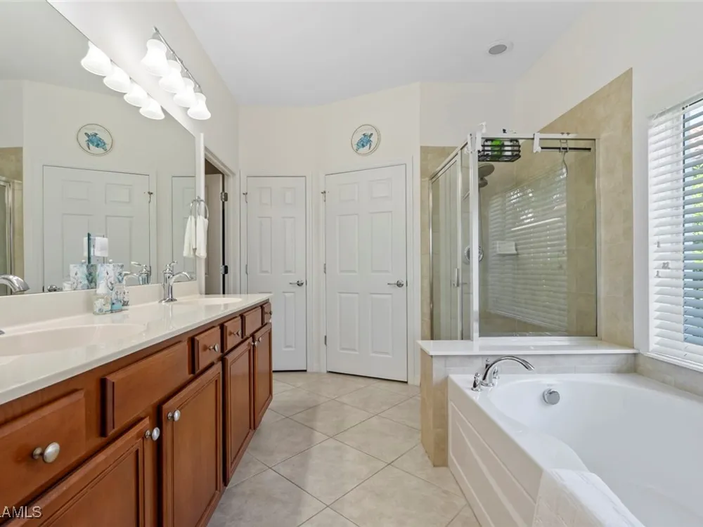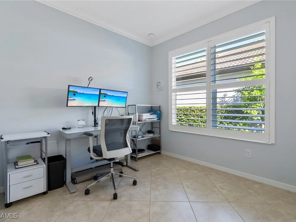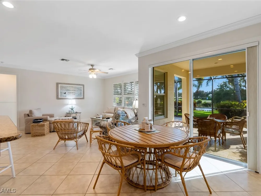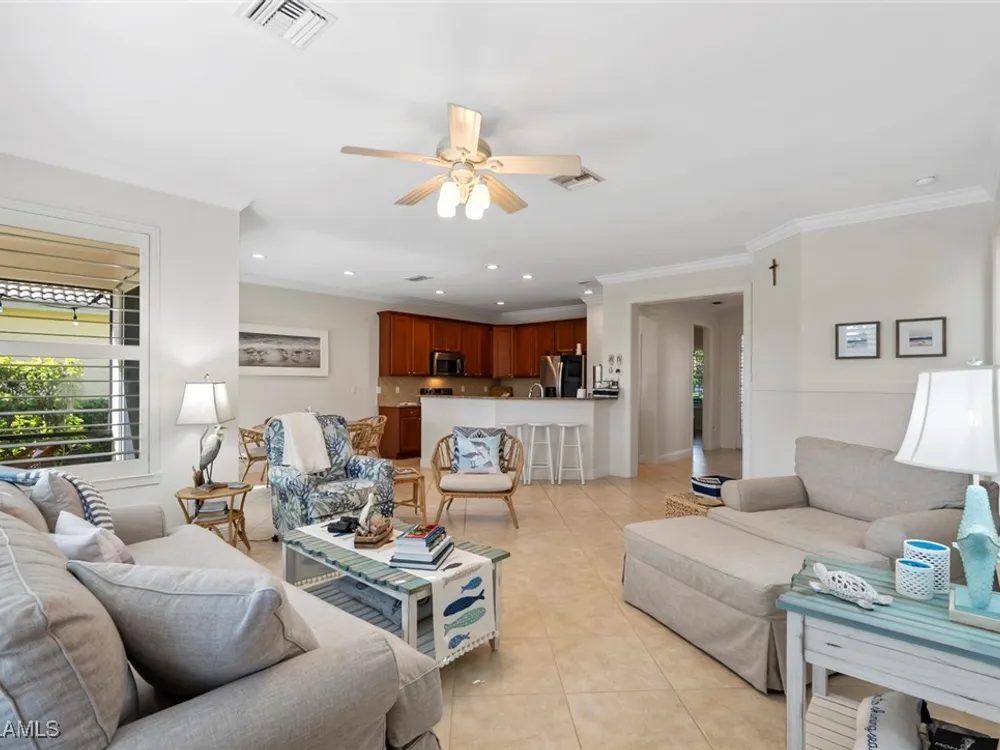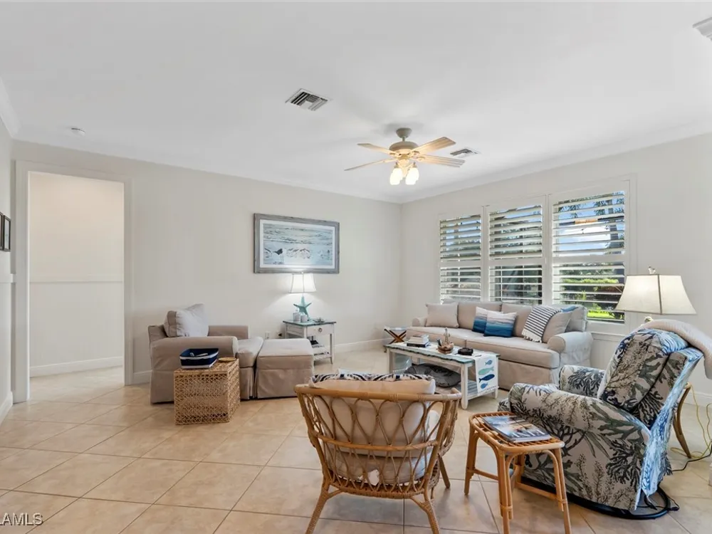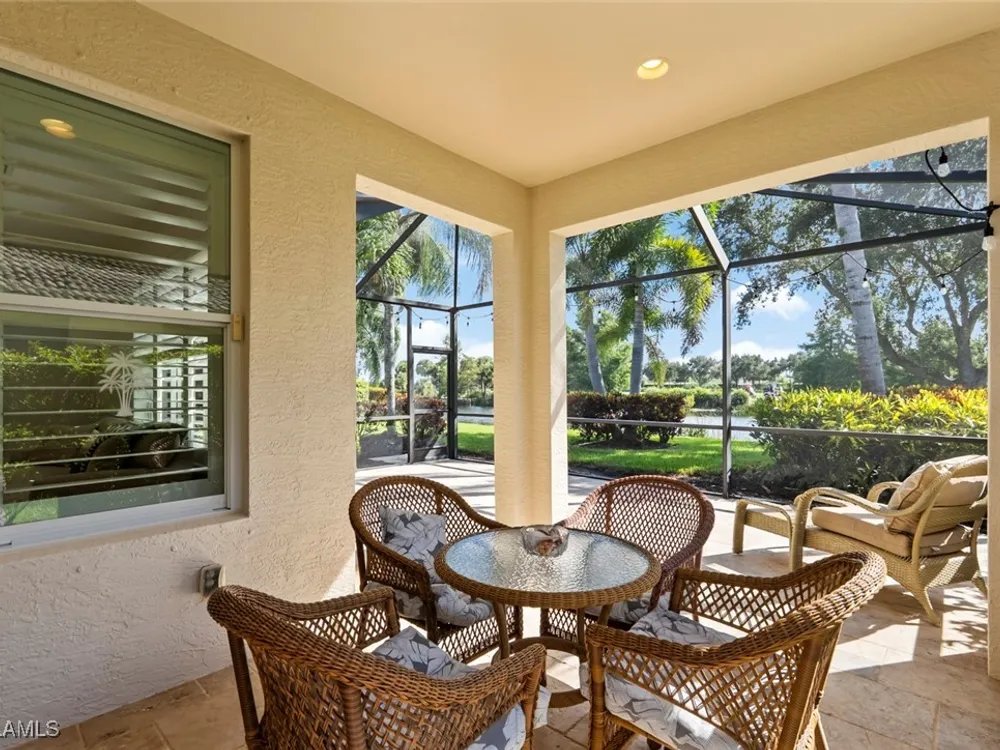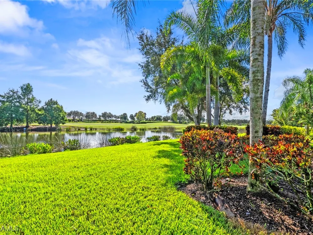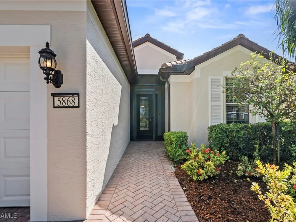 GOLF & WATER VIEWS! Step into this beautifully maintained COPPER RIDGE floor plan in the 55+ Del Webb Naples golf community. Enjoy breathtaking SUNRISES from the oversized EXTENDED LANAI finished with upgraded TRAVERTINE PAVERS - perfect for morning coffee or evening gatherings. Inside, the KITCHEN is appointed with a newer dishwasher, LG refrigerator, and plenty of space for culinary creativity. The PRIMARY SUITE is a private retreat featuring a custom walk-in closet, dual sinks, a walk-in shower, and a relaxing soaking tub. A guest bedroom plus a flexible den provide ideal space for visitors, a home office, or hobbies. ADDITIONAL UPGRADES include a newer washer and dryer, PLANTATION SHUTTERS, wainscoting, luxury vinyl and TILE FLOORING THROUGHOUT, and fresh interior and exterior paint. For peace of mind, the Simply Safe ALARM SYSTEM is equipped with fire and moisture detection, interior/exterior cameras, and motion sensors. With FURNISHINGS NEGOTIABLE, this home is ready to move in NOW!This home comes with the SOCIAL MEMBERSHIP, but take note GOLF LOVERS, Panther Run Golf Club offers optional MEMBERSHIPS with premium golf experiences just steps from your backyard. In Del Webb Naples, you’ll enjoy WORLD-CLASS AMENITIES that rival luxury resorts: dine at the Rusty Putter Restaurant, soak in the RESORT-STYLE or LAP POOLS, break a sweat in the state-of-the-art FITNESS CENTER, and play your way through PICKLEBALL, TENNIS, bocce, billiards - even a top-tier GOLF SIMULATOR! Need groceries, church, or a bite to eat? Just hop in your golf cart and cruise into town - Publix and the heart of Ave Maria are just minutes away. This isn’t just a home - it’s a LIFESTYLE UPGRADE in one of Southwest Florida’s most vibrant 55+ communities. Don’t miss your chance to live where fun, fitness, and friendships flourish year-round!