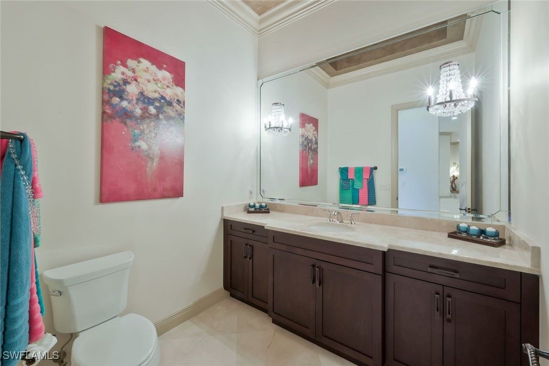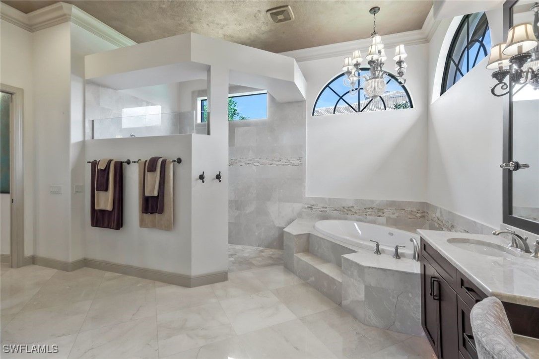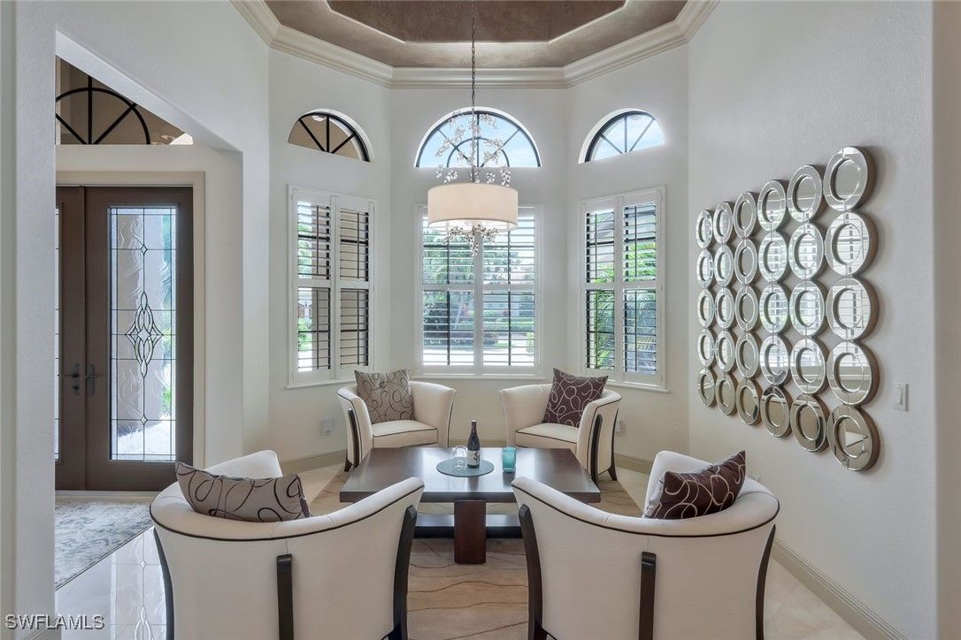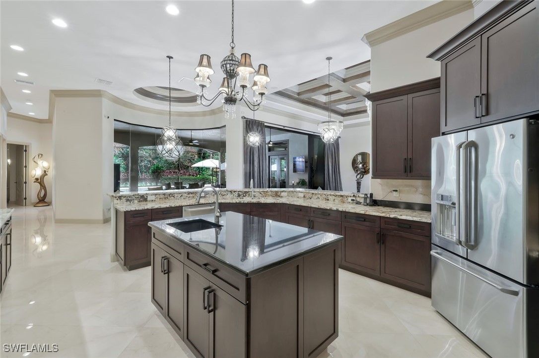 Step into the epitome of luxury and sophistication with this stunning custom estate home, nestled in the prestigious, guard-gated Hammock Isles in The Vineyards, a highly sought-after community in Naples. This exceptional home offers over 3,700 sq. ft. of elegant indoor living space and an impressive 2,500 sq. ft. of outdoor living, perfect for both relaxation and entertainment. Designed for comfort and convenience, this 4 bedroom +den, 5 bath home features a 3-car garage, oversized, paved driveway, all ensuite bathrooms plus powder room/pool bath, coffered and tray ceilings with 8-inch crown molding, marble flooring throughout and Sonos Surround System. The home is adorned with exquisite chandelier lighting, stainless steel GE Cafe appliances, plantation shutters, granite counter tops in the kitchen and laundry room, marble counter tops in all bathrooms, while the primary suite features his and her walk-in closets and separate water closets; hers with a bidet. Impact windows, including rolldown hurricane shutters on the lanai, provide peace of mind, while smart home features such as Ring Doorbell and Nest indoor/outdoor security system complete the experience. Enjoy movie nights in your very own media room, or relax in the beautifully landscaped outdoor area, which includes a heated pool and Infinity spa, spacious outdoor kitchen, deluxe lanai furnishings, and multiple dining areas, perfect for entertaining family and friends. The oversized .81-acre lot, enhanced with upscale landscaping and lighting, adds to the home’s privacy and charm. The Vineyards Country Club offers two 18-hole golf courses, a racquet center with pickleball and tennis courts, a wellness center, spa, and clubhouse with both upscale and casual dining options, along with a variety of social clubs and events. While social memberships are available, golf memberships are currently waitlisted. Additionally, Vineyards Community Park provides extra recreational options with sports facilities and walking paths. This home is ideally located with close proximity to Physicians Regional Hospital, pristine beaches, world-class shopping, dining, and golf, plus easy access to I-75 for quick trips to the airport or day excursions to Marco Island. This exquisite estate blends luxury, comfort, and convenience in one perfect package. Don’t miss the chance to make this dream home yours!