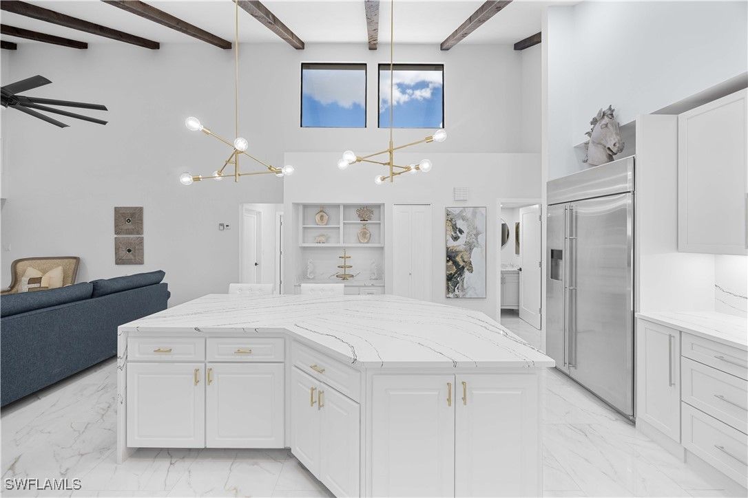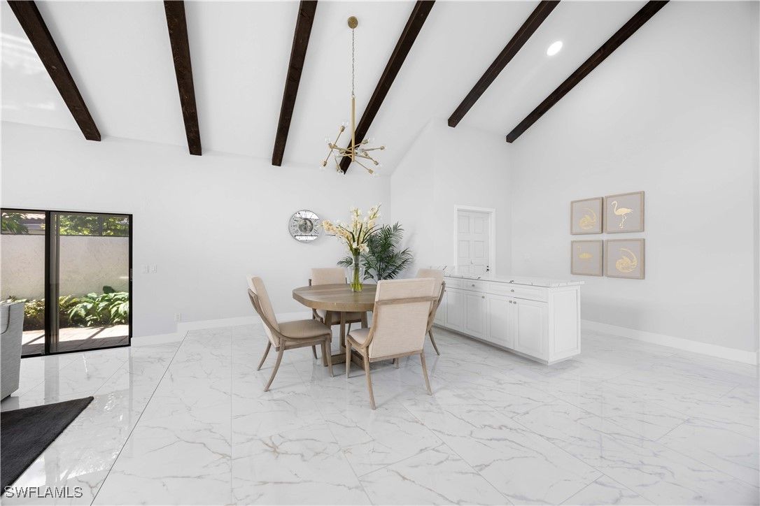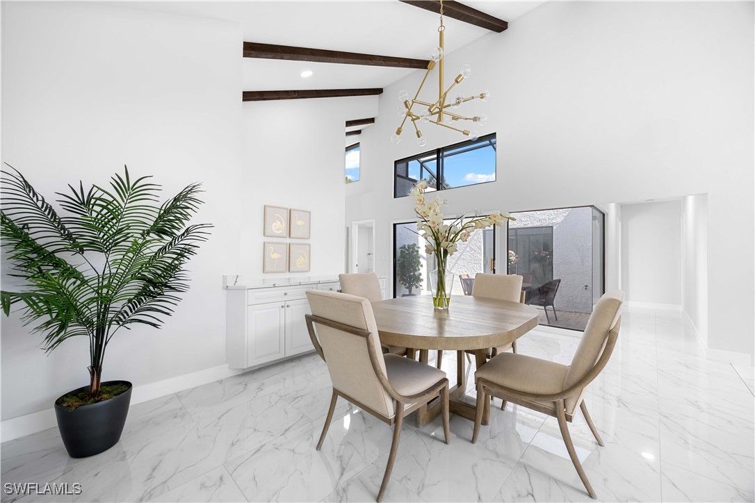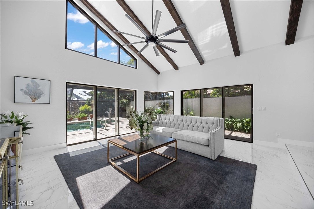 Welcome to Tierra Mar at Pelican Bay, an exclusive enclave of villas surrounded by lush, Mediterranean-inspired landscaping. This beautifully renovated 3 bedroom, 2.5 bath pool home with a 2-car garage offers an upscale, move-in-ready lifestyle with all furniture included. A private gated front and side patio create a welcoming entry. Inside, the home opens to views of the sparkling pool through wall-to-wall sliders in both the dining room and great room. Custom ceiling beams, vaulted ceilings, designer lighting, and porcelain tile flooring throughout create a sophisticated and cohesive look. The spacious kitchen features custom white cabinetry, a large quartz island and breakfast bar, stainless steel appliances, a stylish backsplash, a built-in desk, and a bar area with a wine and beverage refrigerator. The adjoining family room offers a cozy retreat with a fireplace and custom built-ins. The primary bedroom overlooks the pool and includes slider access to the lanai, a generous walk-in closet, and a beautifully updated bathroom with dual sinks, a soaking tub, and a custom-tiled shower with pebble flooring and glass doors. Two guest bedrooms are connected by a Jack and Jill bathroom with dual sinks and a custom-tiled shower. One guest room includes a built-in desk and shelving. A renovated powder room and a separate laundry room with a new utility sink and additional storage complete the interior space. An open atrium off the dining room provides a flexible area perfect for a reading nook, zen garden, or additional seating. Outside, the southern-exposure pool area offers privacy within a screened lanai—one of the few grandfathered screened lanais permitted in Tierra Mar. Ideally located near Artis–Naples, Waterside Shops, and Venetian Village, this home also includes full access to Pelican Bay’s unmatched amenities, including private beachfront restaurants, tram service to the beach with chairs and umbrellas provided, a world-class fitness center, tennis, and miles of walking paths. This beautifully remodeled villa in Tierra Mar offers the perfect combination of luxury, comfort, and convenience—ready for you to move in and enjoy.