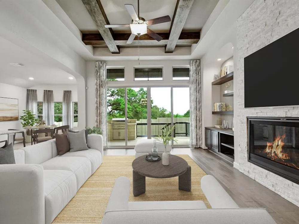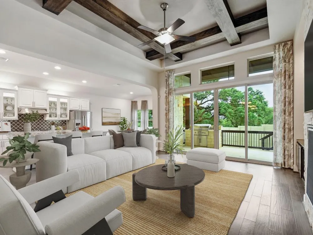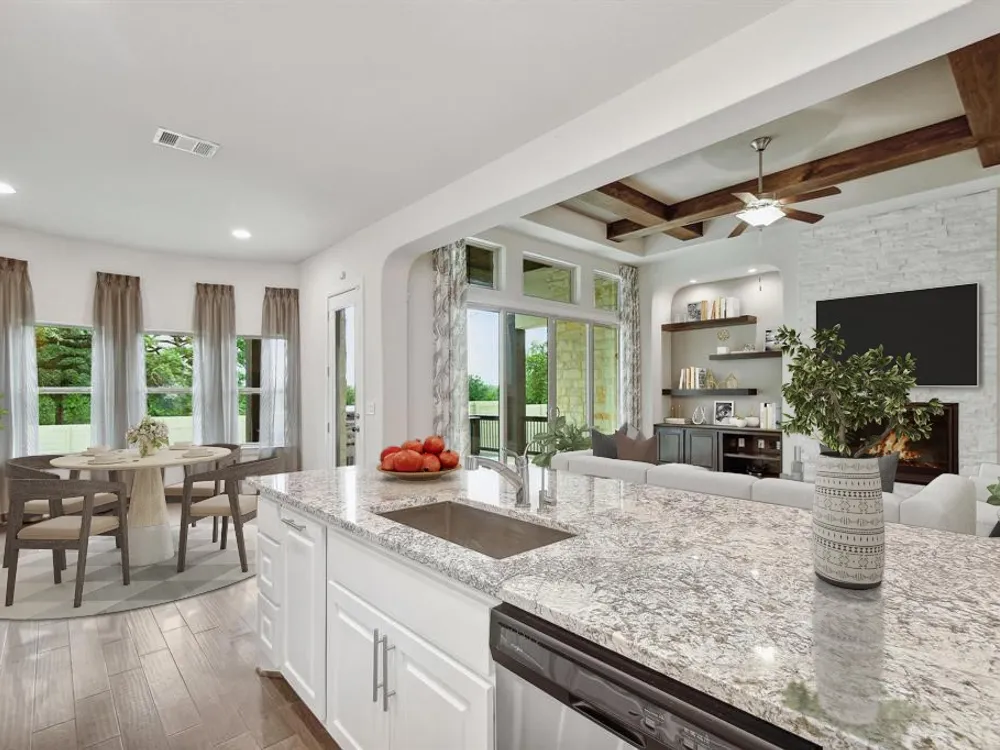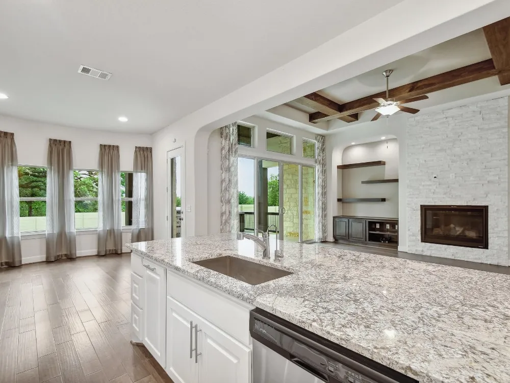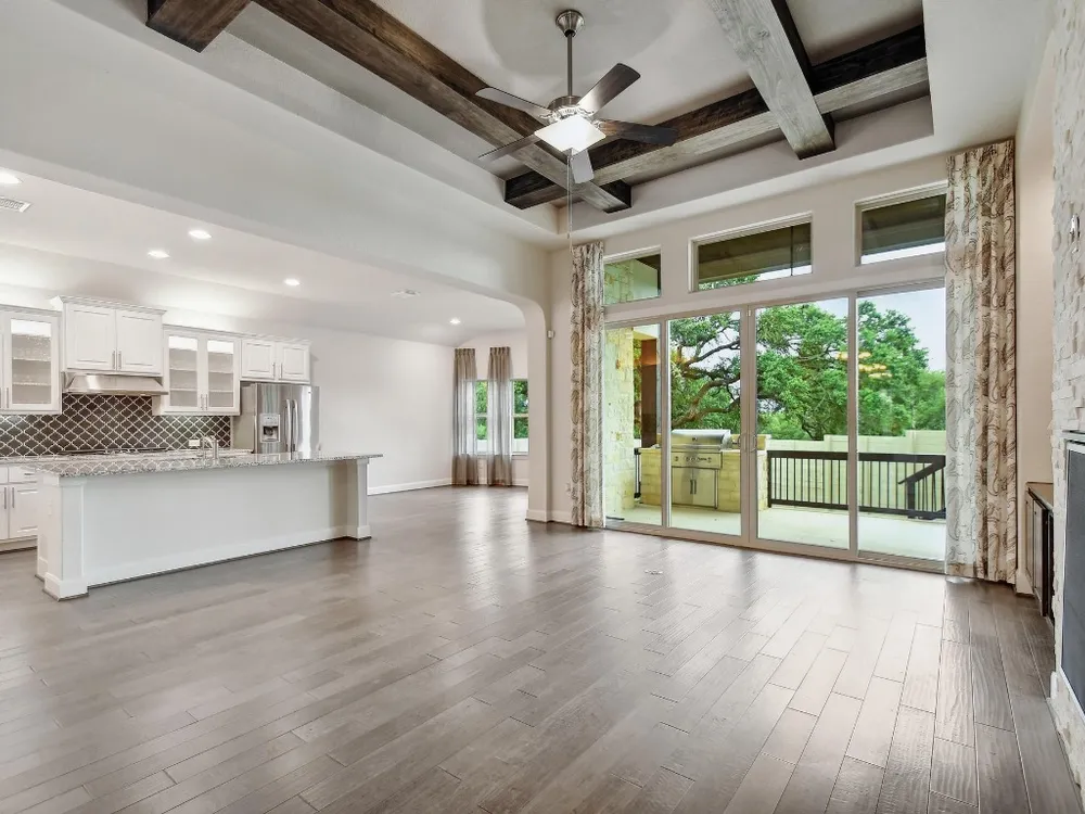 - Beamed Ceilings, Breakfast Bar, Bookcases, Built-in Features, Open Beams/Beamed Ceilings, Tray Ceiling(s), Ceiling Fan(s), Crown Molding, Coffered Ceiling(s), Separate/Formal Dining Room, Double Vanity, Entrance Foyer, Granite Counters, High Ceilings, InteriorSteps, Kitchen Island, Multiple Living Areas, Multiple Dining Areas, Main Level Primary, Multiple Primary Bathrooms, Open Floorplan