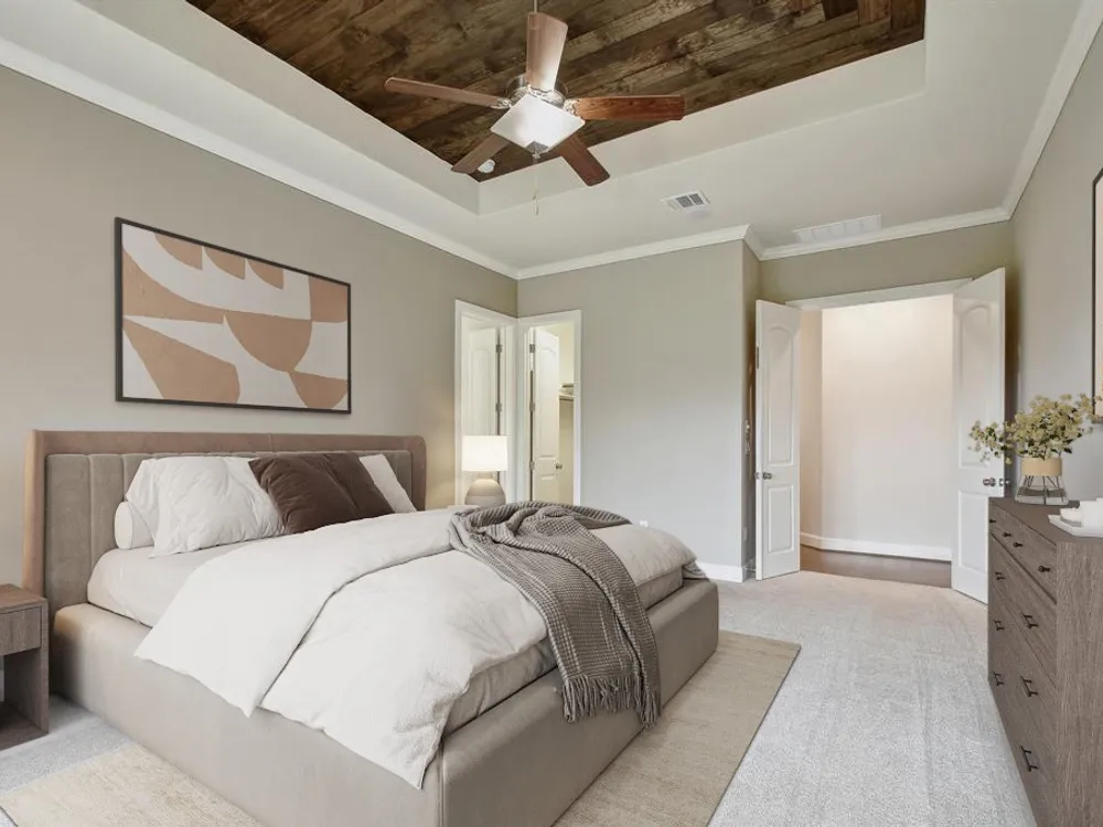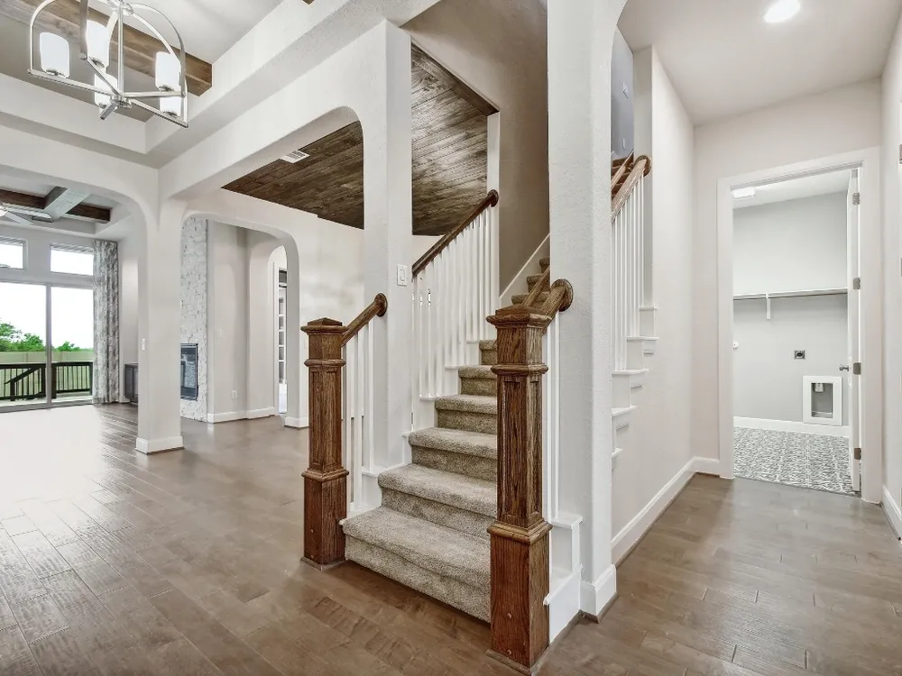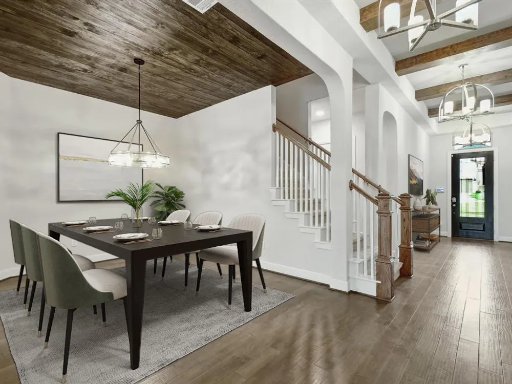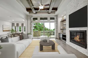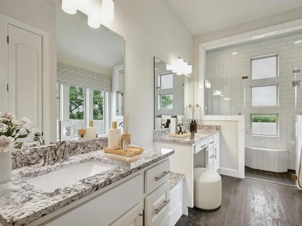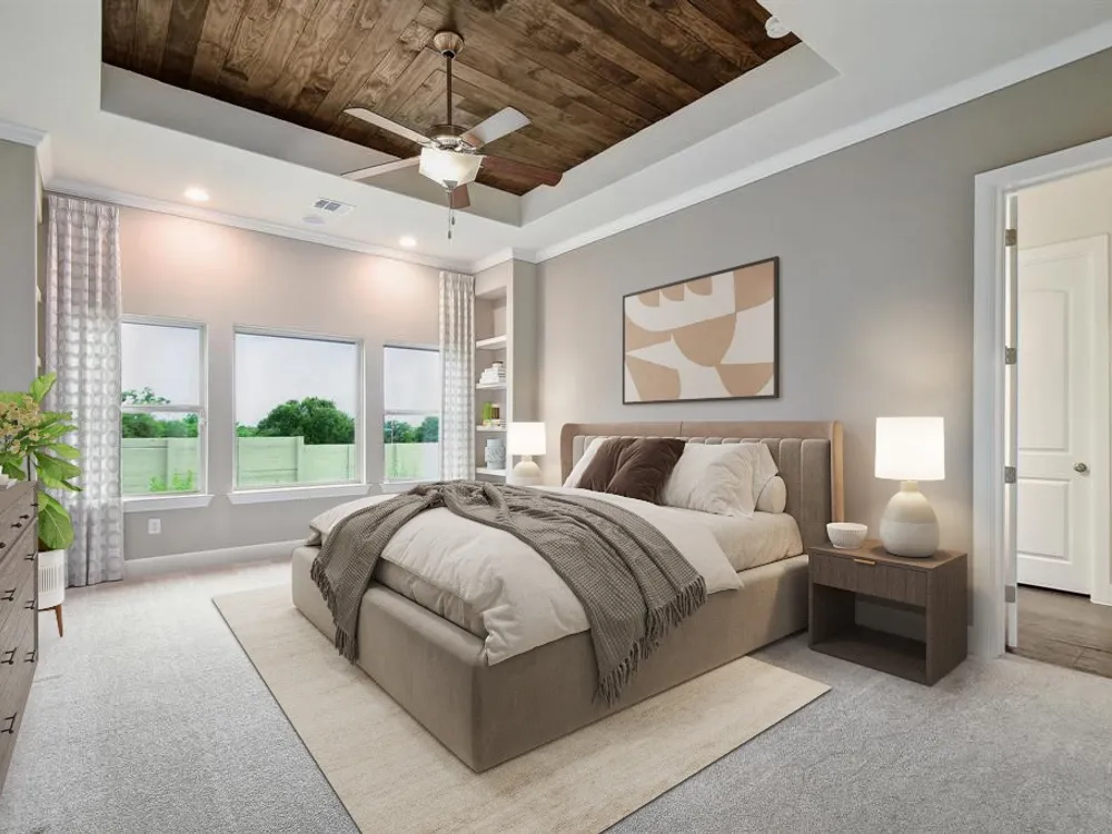 - Beamed Ceilings, Breakfast Bar, Bookcases, Built-in Features, Open Beams/Beamed Ceilings, Tray Ceiling(s), Ceiling Fan(s), Crown Molding, Coffered Ceiling(s), Separate/Formal Dining Room, Double Vanity, Entrance Foyer, Granite Counters, High Ceilings, InteriorSteps, Kitchen Island, Multiple Living Areas, Multiple Dining Areas, Main Level Primary, Multiple Primary Bathrooms, Open Floorplan