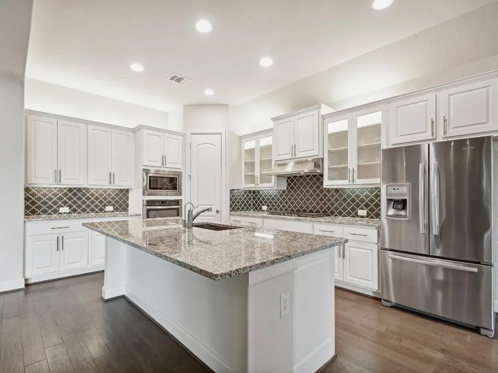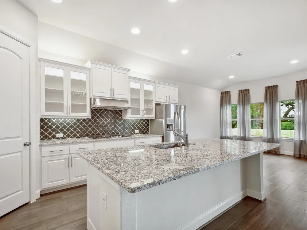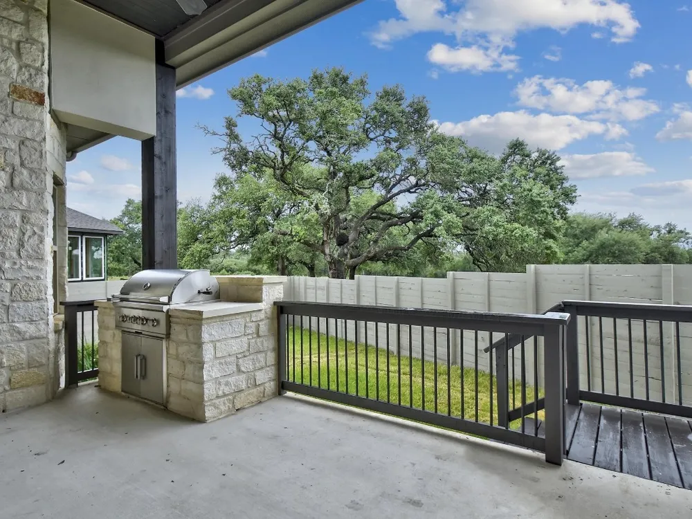 Fabulous Former MODEL HOME with numerous upgrades. All 4 bedrooms on main level with 3 full baths and an office. Large game room with closet and 1/2 bath. Large 3 Car garage with extra long driveway. Beautiful stone and stucco exterior with updated landscaping. Easy walk (maybe 100 yards) to one of the three amenity centers in the development. Backs to a buffer zone that is owned by Texas Water Co. with numerous large trees. Primary bath has large walk in shower with dual heads and primary bedroom is large with two walk in closets. Large back patio with built-in gas grill, ceiling fan. Two dining areas and large gourmet kitchen with stainless steel appliances, and very large island, lots of cabinets. Refrigerator included too.