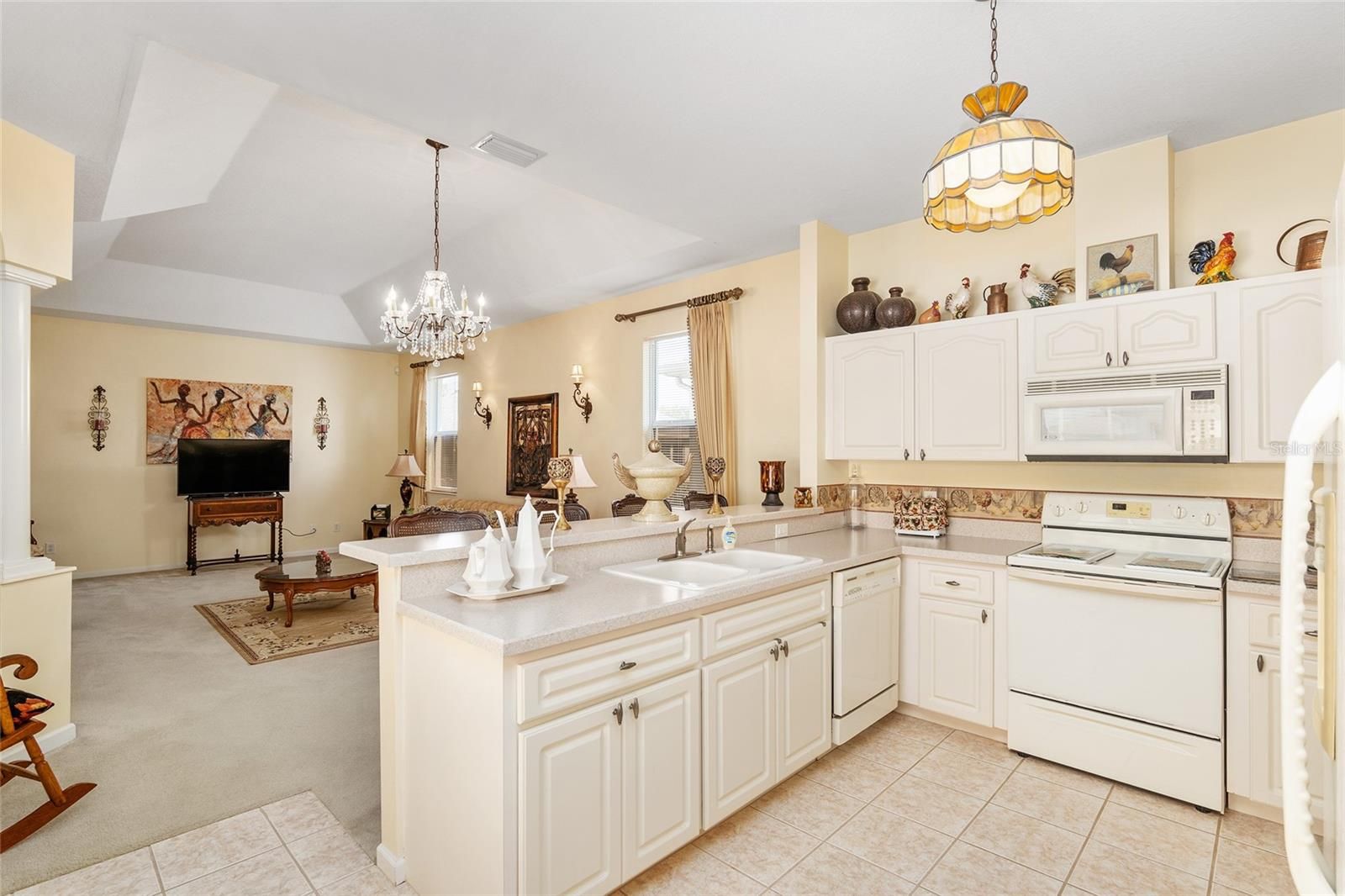 - Ceiling Fan(s), Eat-in Kitchen, High Ceilings, Kitchen/Family Room Combo, L-Shaped Dining Room, Open Floorplan, Main Level Primary, Split Bedrooms, Thermostat, Walk-In Closet(s)