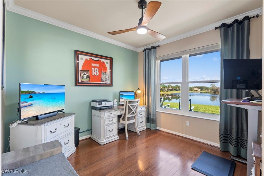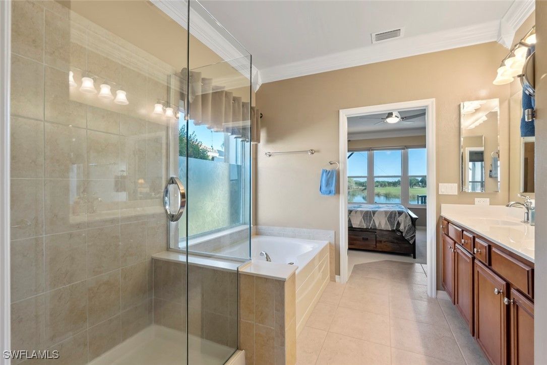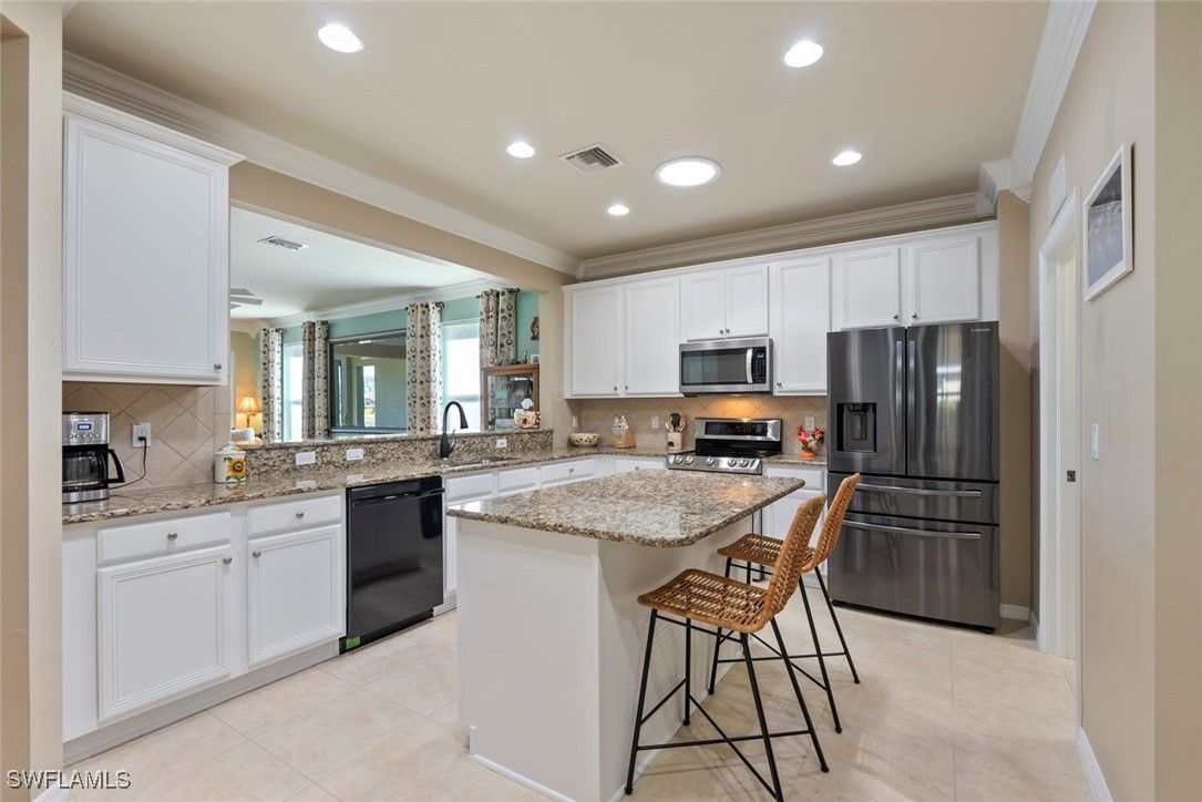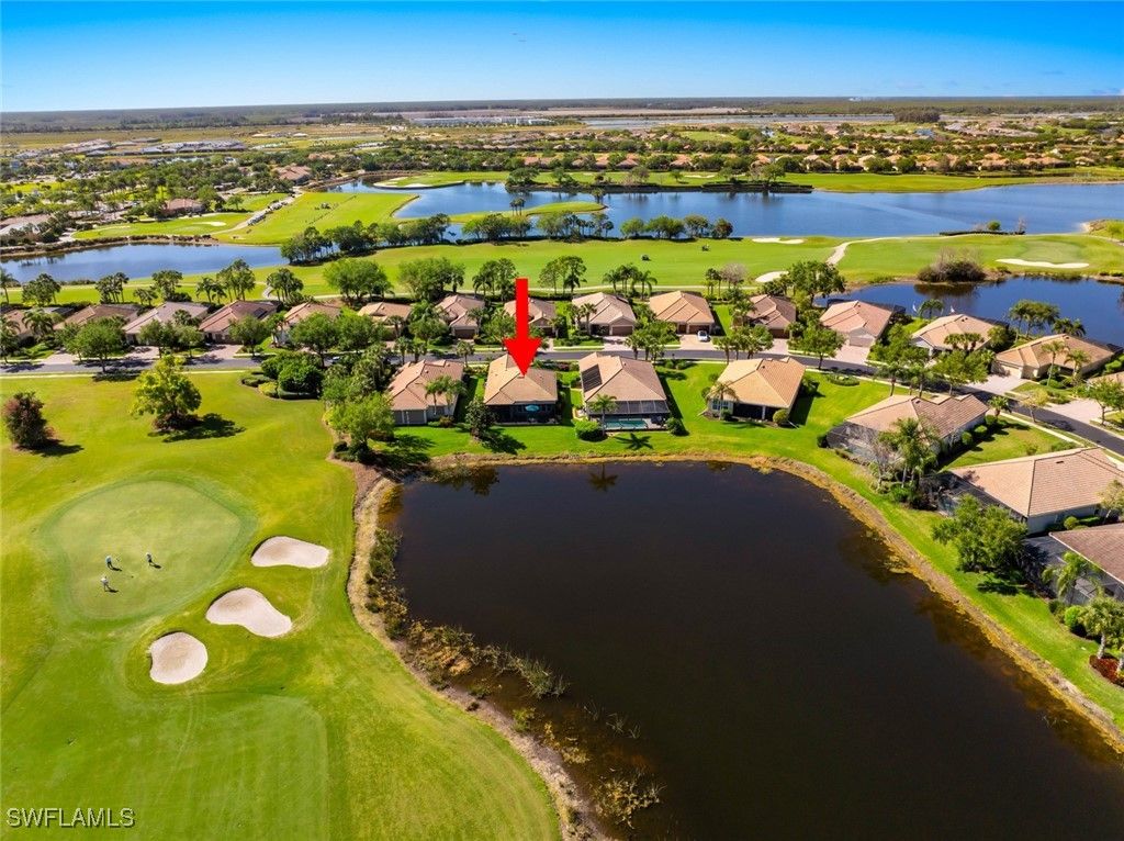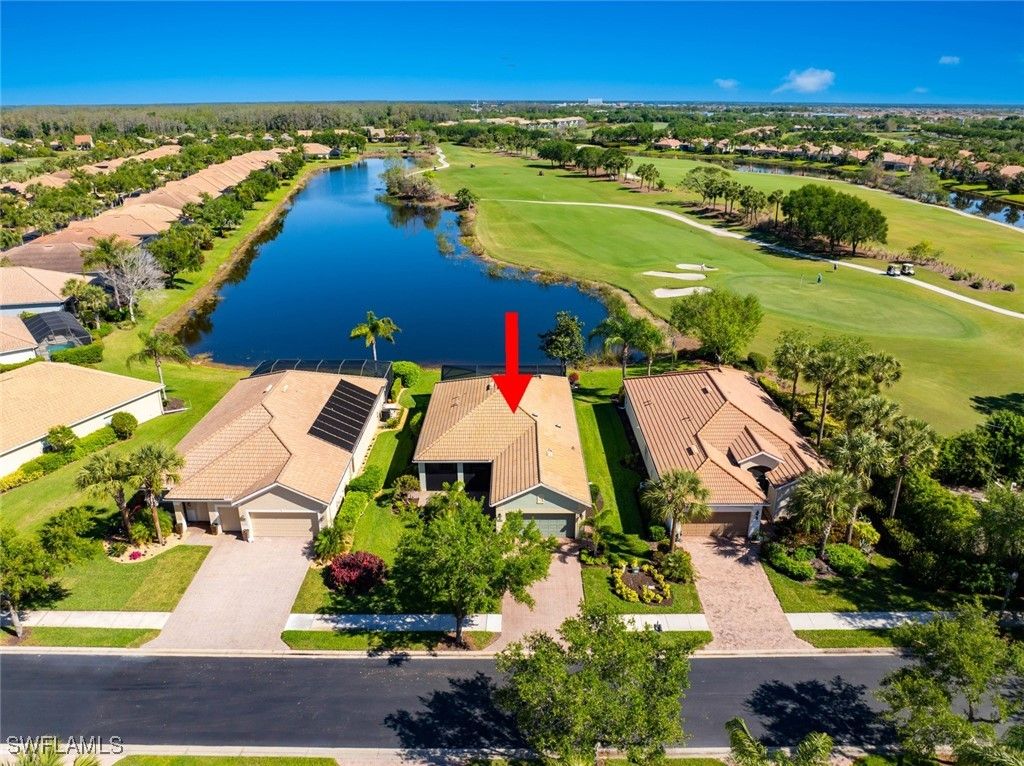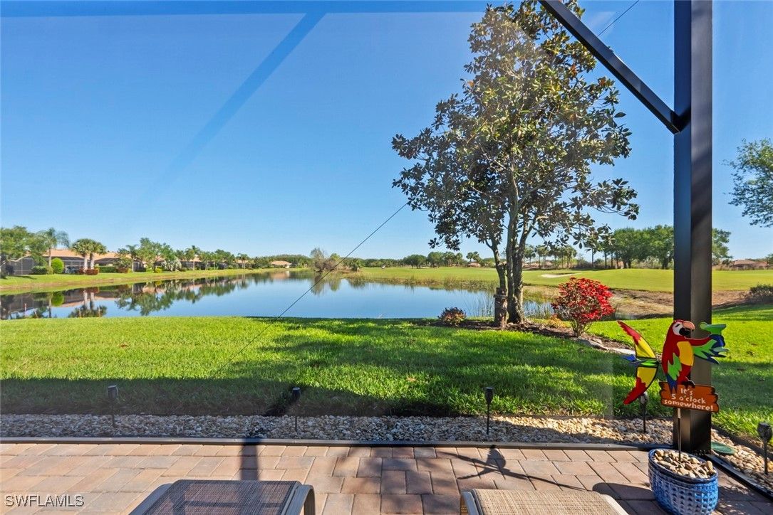 One of the BEST VIEWS in Del Webb!! PREMIUM GOLF COURSE and AMAZING WATER VIEW - This beautiful home is located in Del Webb situated on a large lake and the 4th green of the Panther Run Golf Course! This FURNISHED house is located in the highly sought-after 55+ Del Webb Naples community, featuring the SURREY CREST floor plan with 2-bedroom + den and numerous upgrades AND it is on a quiet street with no nearby construction. Sellers are providing the SILVER HOME WARRANTY PACKAGE with the purchase of this home. Some of the upgrades include CROWN MOLDING throughout and FRESHLY PAINTED interior and exterior. You will have a sense of peace knowing that most windows are IMPACT RESISTANT and the other windows are equipped with ACCORDION SHUTTERS. A whole-house WATER SOFTENER is a wonderful addition to this home. From the KITCHEN you can see the breathtaking water view and enjoy the bright kitchen from two skylights. The beautiful WHITE CABINETS have PULL OUT DRAWERS for easy access. A versatile den provides ample space for visitors, a home office, or personal hobbies. In the guest room, the MURPHY BED will be ready for those friends and family that want to visit. The recently added EXTENDED LANAI is a true paradise, perfect for relaxing or entertaining guests. It features a unique “VAULTED ROOF LINE” with a FULL PANORAMIC VIEW. The front and back screened-in lanais will keep the bugs out with “SUPERSCREENS”. The luxurious PRIMARY SUITE offers an en-suite bathroom with dual sinks, a shower and SOAKING TUB, creating a personal sanctuary. The garage features an EPOXY FLOOR, INSULATED GARAGE DOOR and overhead STORAGE. IMMACULATE custom landscaping surrounds this home and includes an extra wide front walk-way to the front door. Golf enthusiasts will be thrilled to know there are AVAILABLE GOLF MEMBERSHIPS at the Panther Run Golf Club, offering an exceptional golfing experience. Experience the Del Webb Active Adult lifestyle with access to a range of amenities, including the Rusty Putter Restaurant, a RESORT-STYLE pool, lap pool, fitness center, PICKLEBALL, bocce and tennis courts, a GOLF SIMULATOR, and billiards. Explore Del Webb Naples and Ave Maria effortlessly in your golf cart, whether you're heading to Publix, church, or out for a delightful dinner. Embrace the lifestyle you deserve in this extraordinary home, where comfort, luxury, and convenience seamlessly come together.
