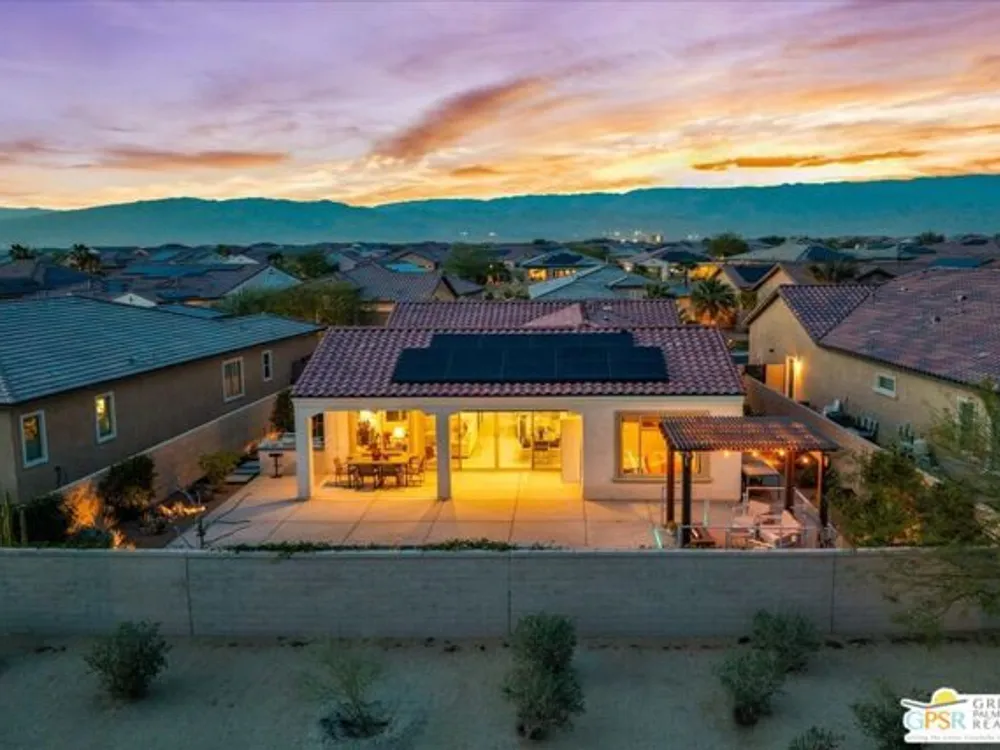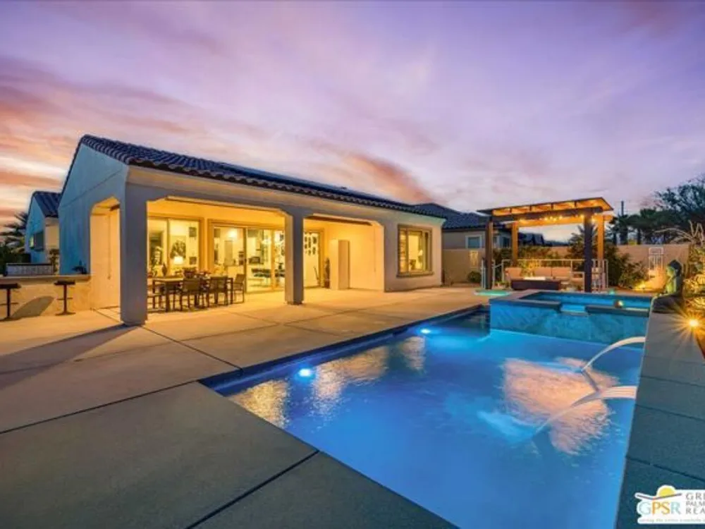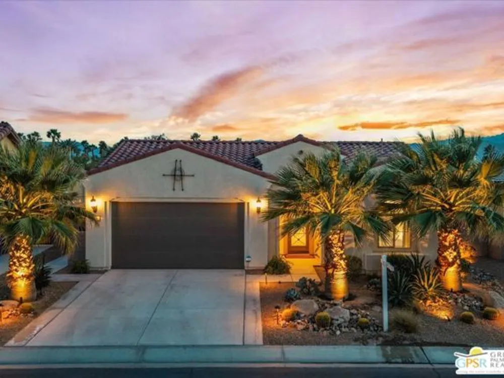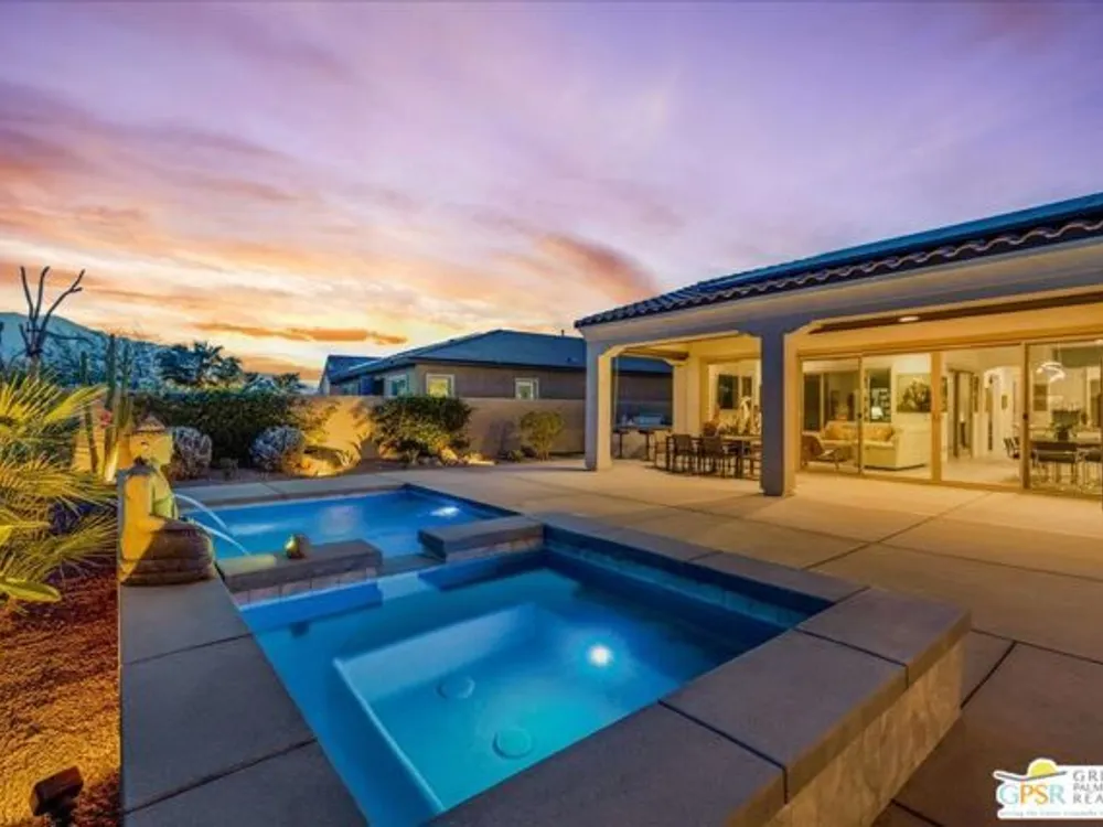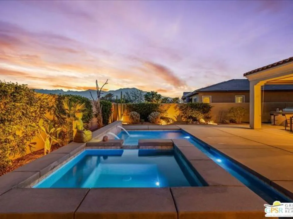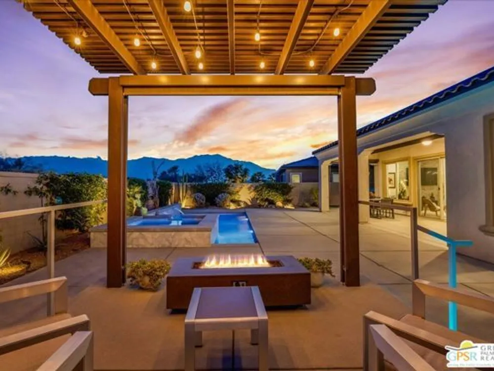 Experience the pinnacle of luxury and modern convenience in this stunning home, nestled within the prestigious 55+ community of Del Webb Rancho Mirage. Situated in Phase 2, this exquisite Spanish-inspired HAVEN floorplan showcases unobstructed south and west mountain views, offering a breathtaking backdrop for daily living and entertaining. Step through the custom iron and glass entry door into an ambiance of sophistication, where an elegant accent tile wall sets the tone. The seamless flow of 12"x24" porcelain tile flooring, an arch package, and modern six-paneled doors create a refined aesthetic. A unique center courtyard, perfectly positioned adjacent to the kitchen, invites moments of tranquility and seamless indoor-outdoor living. Designed for culinary excellence, the chef's kitchen features an expansive EXECUTIVE ISLAND, sleek 42" upper cabinetry, a stylish FARM SINK, quartz countertops, and a custom glass tile backsplash extending to the ceiling. Premium appliances, including a Sub-Zero glass-door refrigerator and a MIELE dishwasher, and spacious walk-in pantry provides ample storage. The open-concept design is highlighted by a DOUBLE CENTER-OPENING SLIDING DOOR, seamlessly blending indoor and outdoor spaces. Step onto the full-length covered patio and immerse yourself in resort-style living. The backyard oasis features a sparkling pool and spa, a stylish pergola, a cozy fire pit, a fully equipped grilling station, roller shades for added comfort, and a serene water featurecreating the perfect setting for unforgettable gatherings. The Owner's Suite is a retreat of its own, boasting sound-insulating windows, motorized drapes, and mesmerizing mountain views. The spa-like ensuite offers dual vanities, a spacious walk-in shower with a built-in bench, and an oversized custom closet. Smart home features, including voice and app-controlled lighting, sound, and more, allow you to set the perfect ambiance with ease. The oversized 2.5-car garage comes complete with an ENERGY UPGRADE, custom storage solutions, and non-slip floor tiling. Plus, with a Tesla Solar Lease at just $112/month, energy savings are built right in. Beyond the home, the Del Webb Rancho Mirage community offers a world-class lifestyle with a state-of-the-art clubhouse, fitness center, resort-style pool and spa, tennis courts, pickleball, and so much more. This is more than a homeit's a luxurious retreat designed for effortless living. Don't miss the opportunity to make it yours!