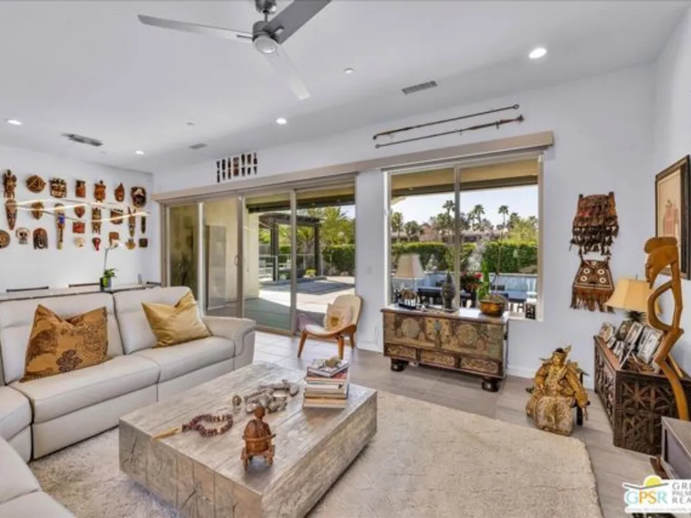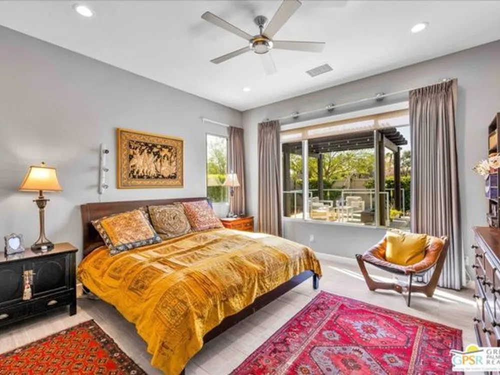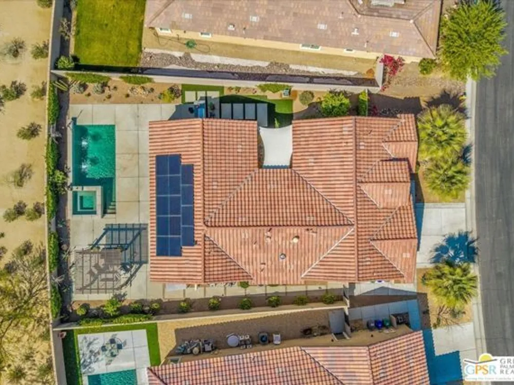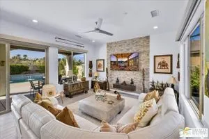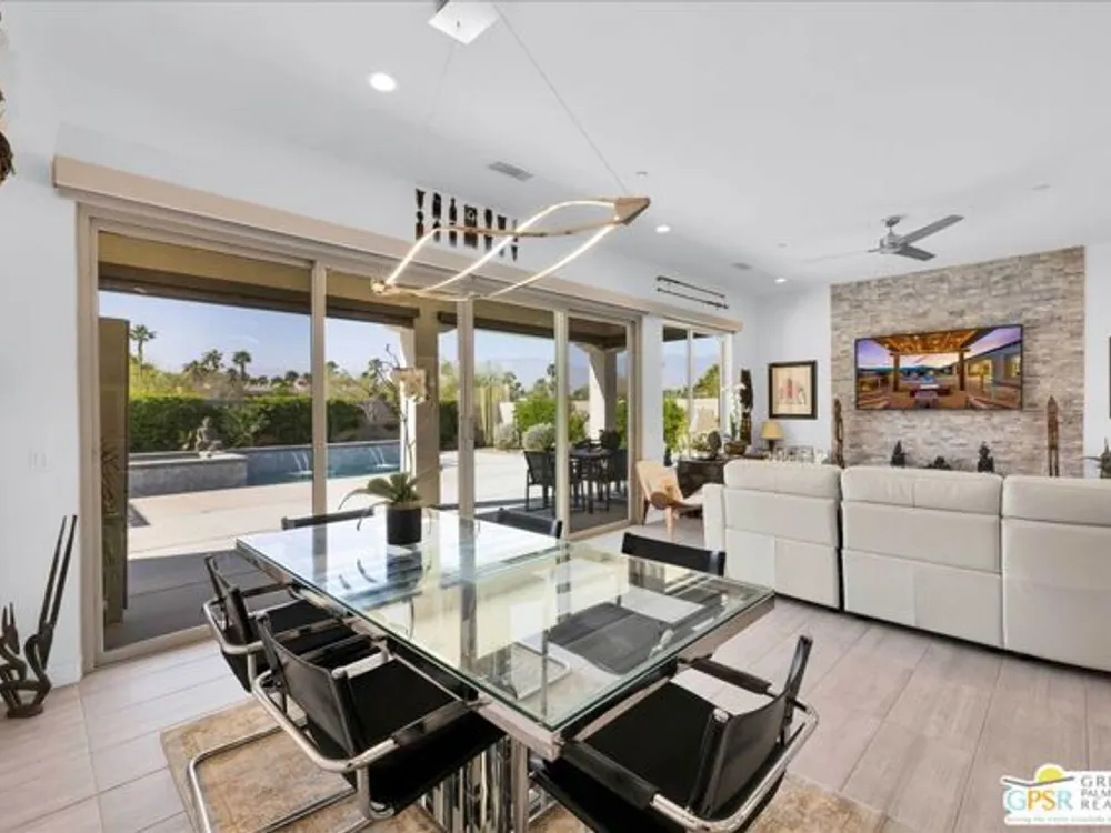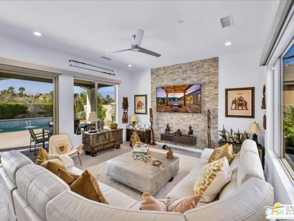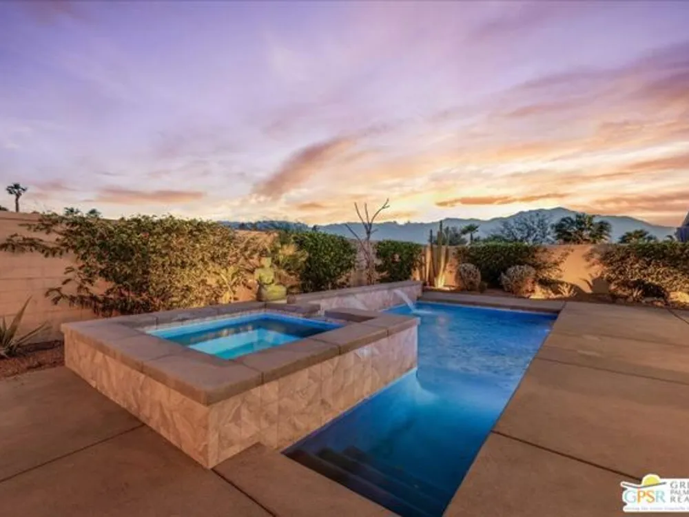Experience the pinnacle of luxury and modern convenience in this stunning home, nestled within the prestigious 55+ community of Del Webb Rancho Mirage. Situated in Phase 2, this exquisite Spanish-inspired HAVEN floorplan showcases unobstructed south and west mountain views, offering a breathtaking backdrop for daily living and entertaining. Step through the custom iron and glass entry door into an ambiance of sophistication, where an elegant accent tile wall sets the tone. The seamless flow of 12"x24" porcelain tile flooring, an arch package, and modern six-paneled doors create a refined aesthetic. A unique center courtyard, perfectly positioned adjacent to the kitchen, invites moments of tranquility and seamless indoor-outdoor living. Designed for culinary excellence, the chef's kitchen features an expansive EXECUTIVE ISLAND, sleek 42" upper cabinetry, a stylish FARM SINK, quartz countertops, and a custom glass tile backsplash extending to the ceiling. Premium appliances, including a Sub-Zero glass-door refrigerator and a MIELE dishwasher, and spacious walk-in pantry provides ample storage. The open-concept design is highlighted by a DOUBLE CENTER-OPENING SLIDING DOOR, seamlessly blending indoor and outdoor spaces. Step onto the full-length covered patio and immerse yourself in resort-style living. The backyard oasis features a sparkling pool and spa, a stylish pergola, a cozy fire pit, a fully equipped grilling station, roller shades for added comfort, and a serene water featurecreating the perfect setting for unforgettable gatherings. The Owner's Suite is a retreat of its own, boasting sound-insulating windows, motorized drapes, and mesmerizing mountain views. The spa-like ensuite offers dual vanities, a spacious walk-in shower with a built-in bench, and an oversized custom closet. Smart home features, including voice and app-controlled lighting, sound, and more, allow you to set the perfect ambiance with ease. The oversized 2.5-car garage comes complete with an ENERGY UPGRADE, custom storage solutions, and non-slip floor tiling. Plus, with a Tesla Solar Lease at just $112/month, energy savings are built right in. Beyond the home, the Del Webb Rancho Mirage community offers a world-class lifestyle with a state-of-the-art clubhouse, fitness center, resort-style pool and spa, tennis courts, pickleball, and so much more. This is more than a homeit's a luxurious retreat designed for effortless living. Don't miss the opportunity to make it yours!