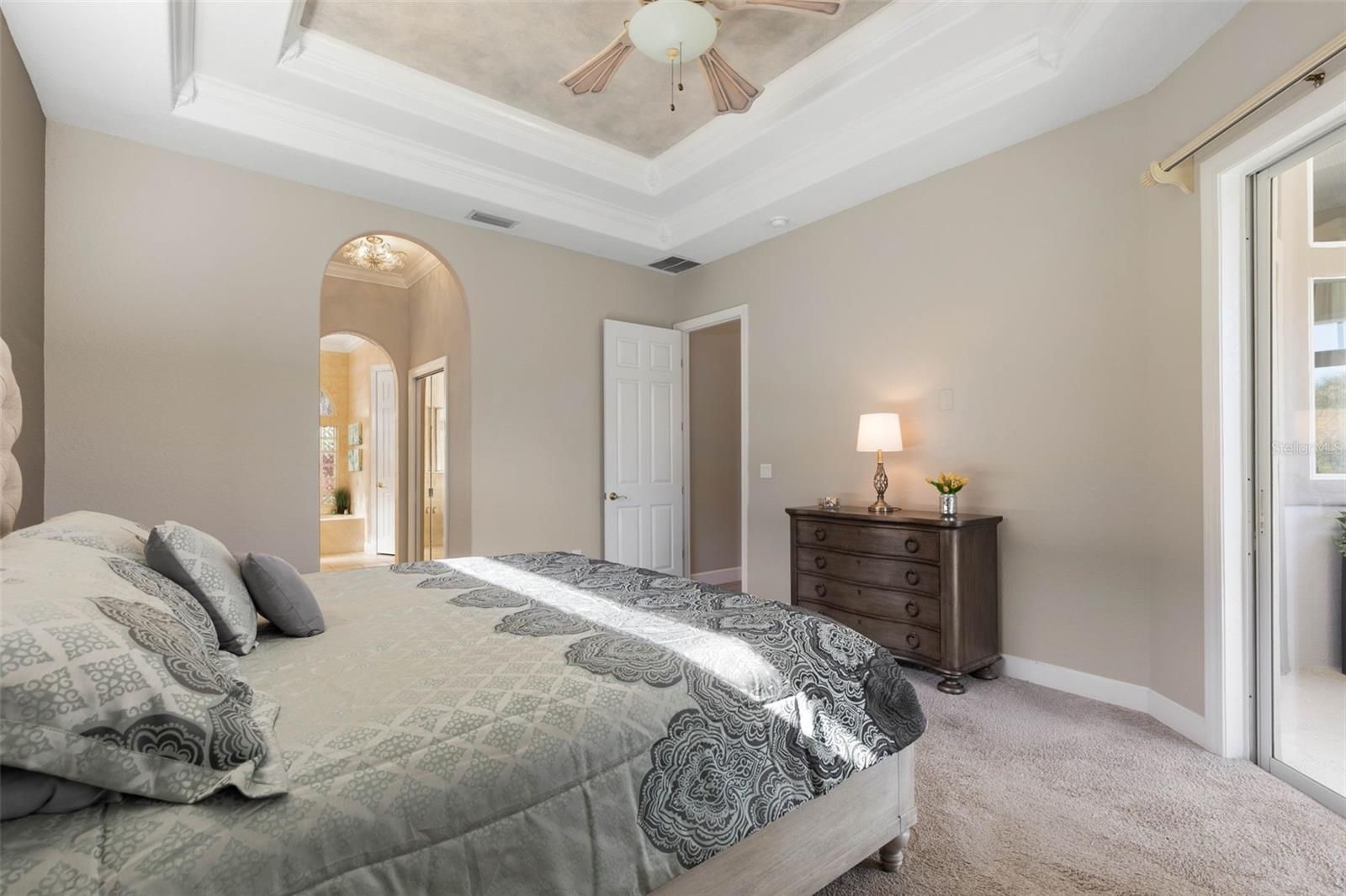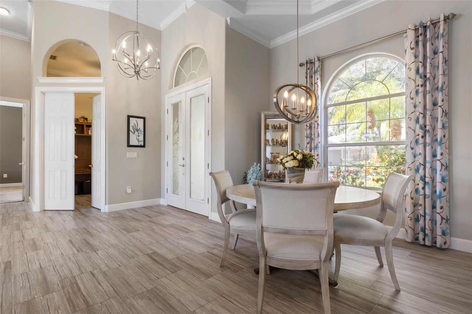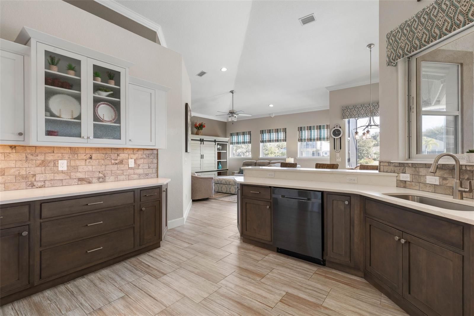 - Ceiling Fan(s), Crown Molding, Eat-in Kitchen, High Ceilings, Kitchen/Family Room Combo, Main Level Primary, Solid Surface Counters, Split Bedrooms, Tray Ceiling(s), Walk-In Closet(s), Window Treatments