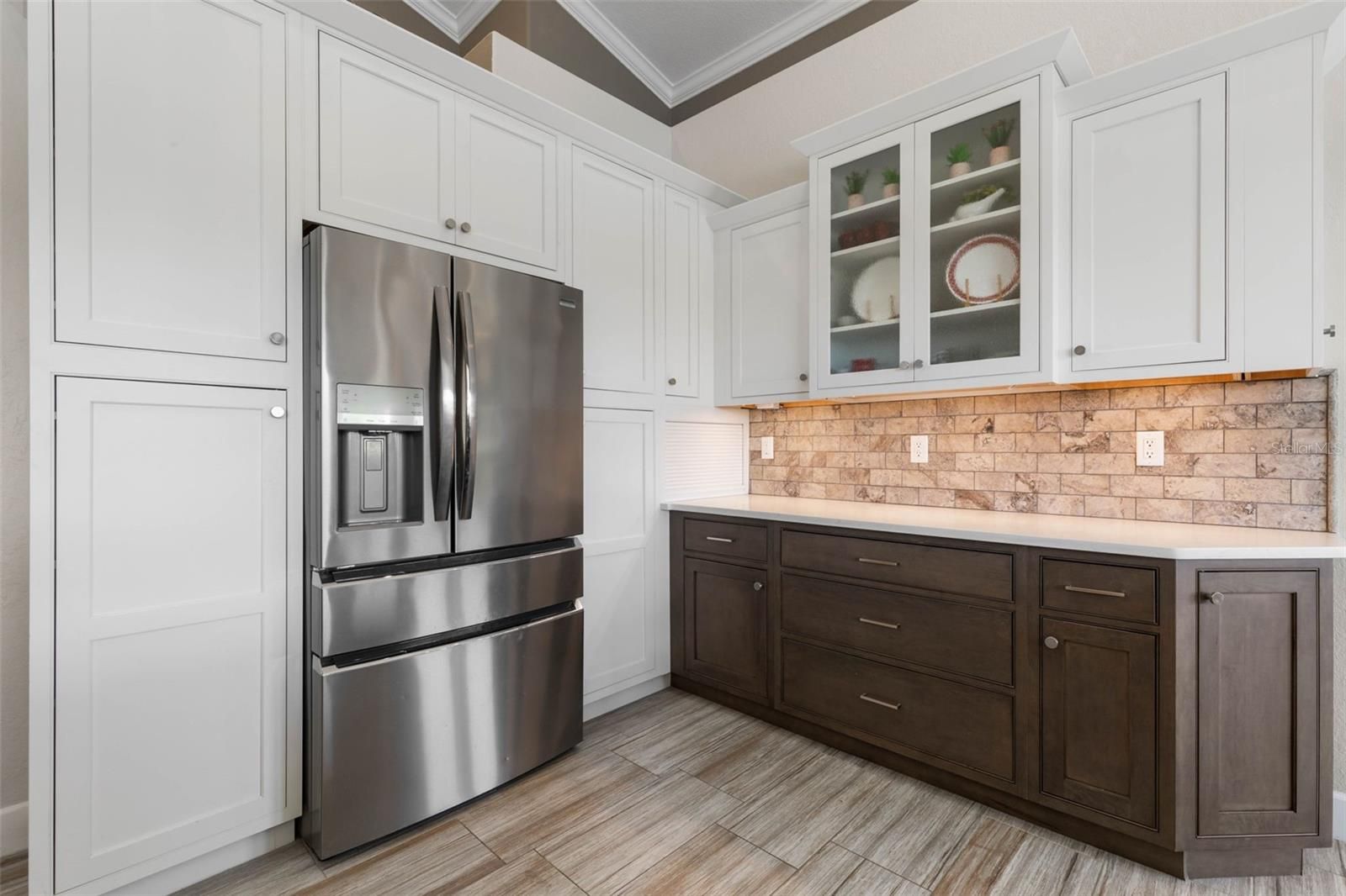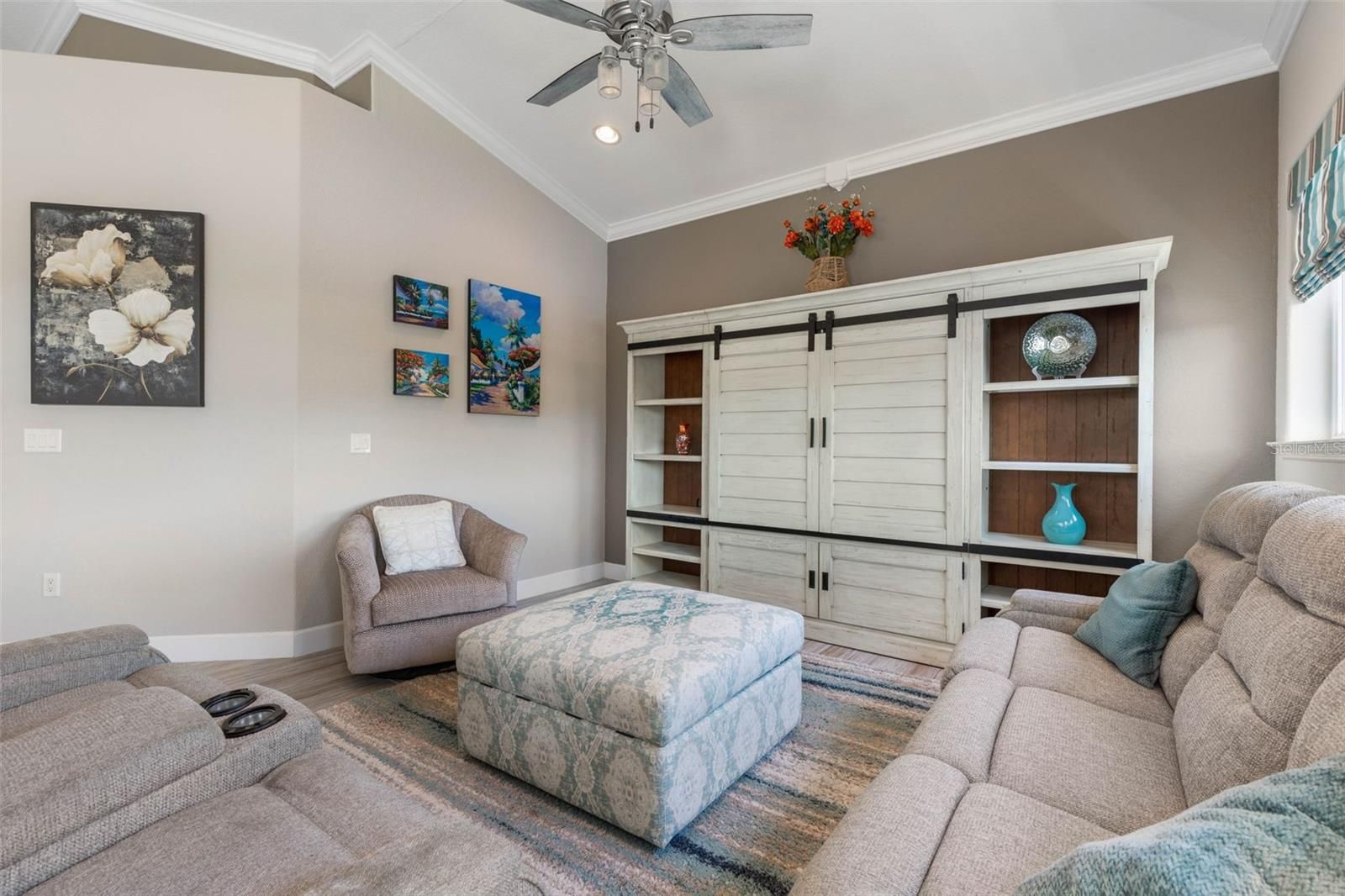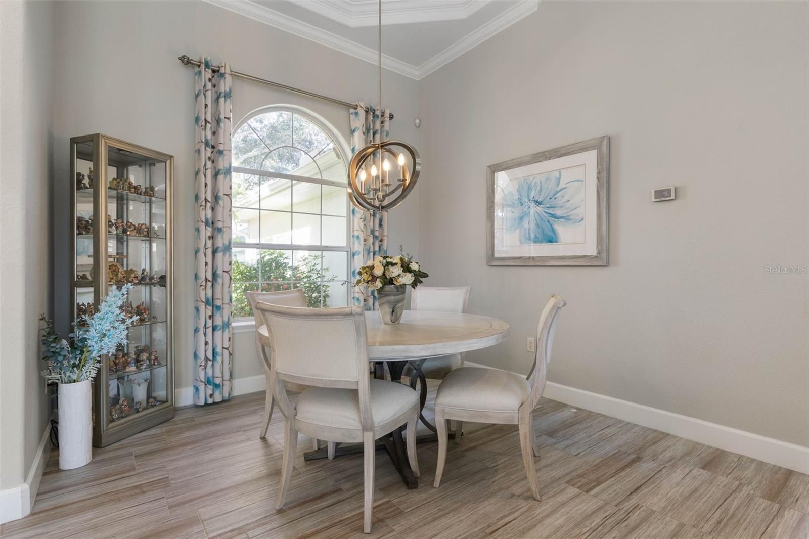 - Ceiling Fan(s), Crown Molding, Eat-in Kitchen, High Ceilings, Kitchen/Family Room Combo, Main Level Primary, Solid Surface Counters, Split Bedrooms, Tray Ceiling(s), Walk-In Closet(s), Window Treatments