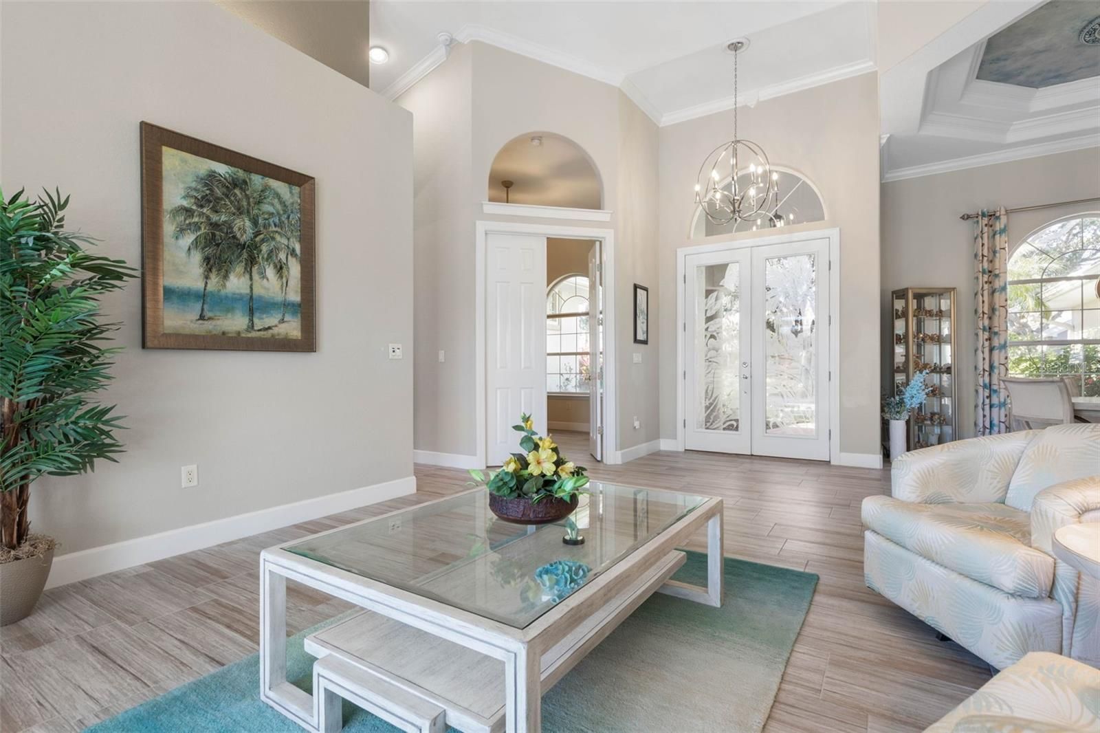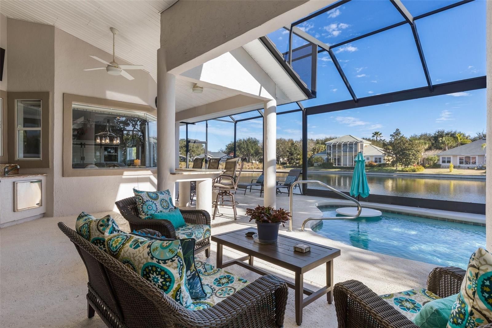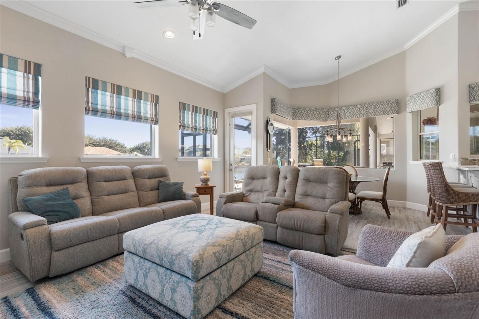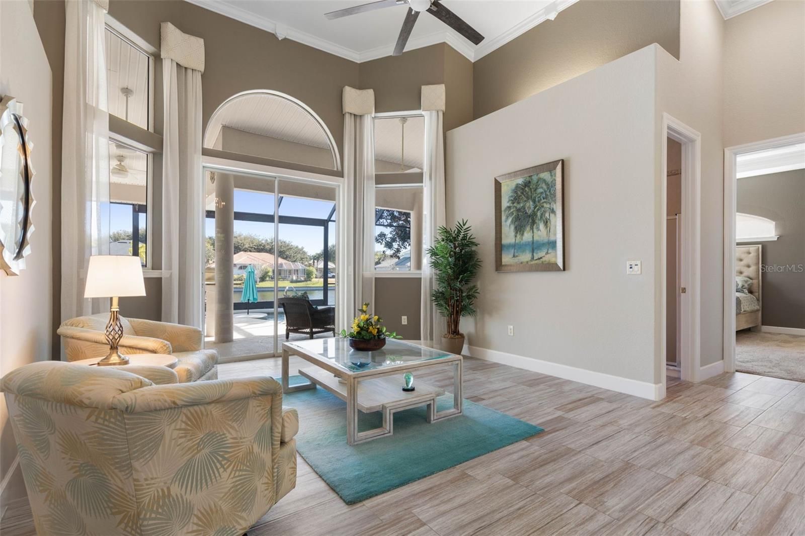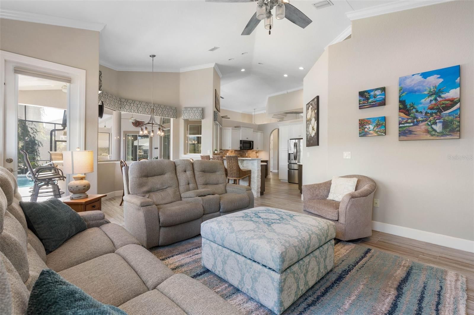 Under contract-accepting backup offers. Welcome to 59 Lagare Street, a beautifully updated Front Street home designed to embrace Florida living at its finest. Expansive windows flood the home with natural light and perfectly frame serene lake and pool views, creating a bright, airy feel throughout. Step outside to your picture-screened lanai, where a solar-heated pool, outdoor bar, and dedicated pool bath set the stage for effortless entertaining and relaxing days in the sun. Inside, the home offers 3 bedrooms, 3 full bathrooms, plus a versatile flex room, ideal for a home office, media room, or guest space. Recent upgrades include new tile flooring in all main living areas, fresh interior paint, and high tray ceilings accented with crown molding, adding both elegance and openness. Located in the sought-after Front Street neighborhood, this home is just moments from the Esplanade Trail, perfect for walking, biking, and enjoying the coastal lifestyle. This is a home that truly shines in person—where comfort, style, and location come together beautifully. Grand Haven offers a newly renovated Cafe, two pools, two fitness centers, pickleball, bocce ball, har-tru tennis courts, volleyball, basketball, croquet, a tiki bar, dog park, & beautiful walking trails at no additional fee. Jack Nicklaus golf club membership is available for a separate membership fee.