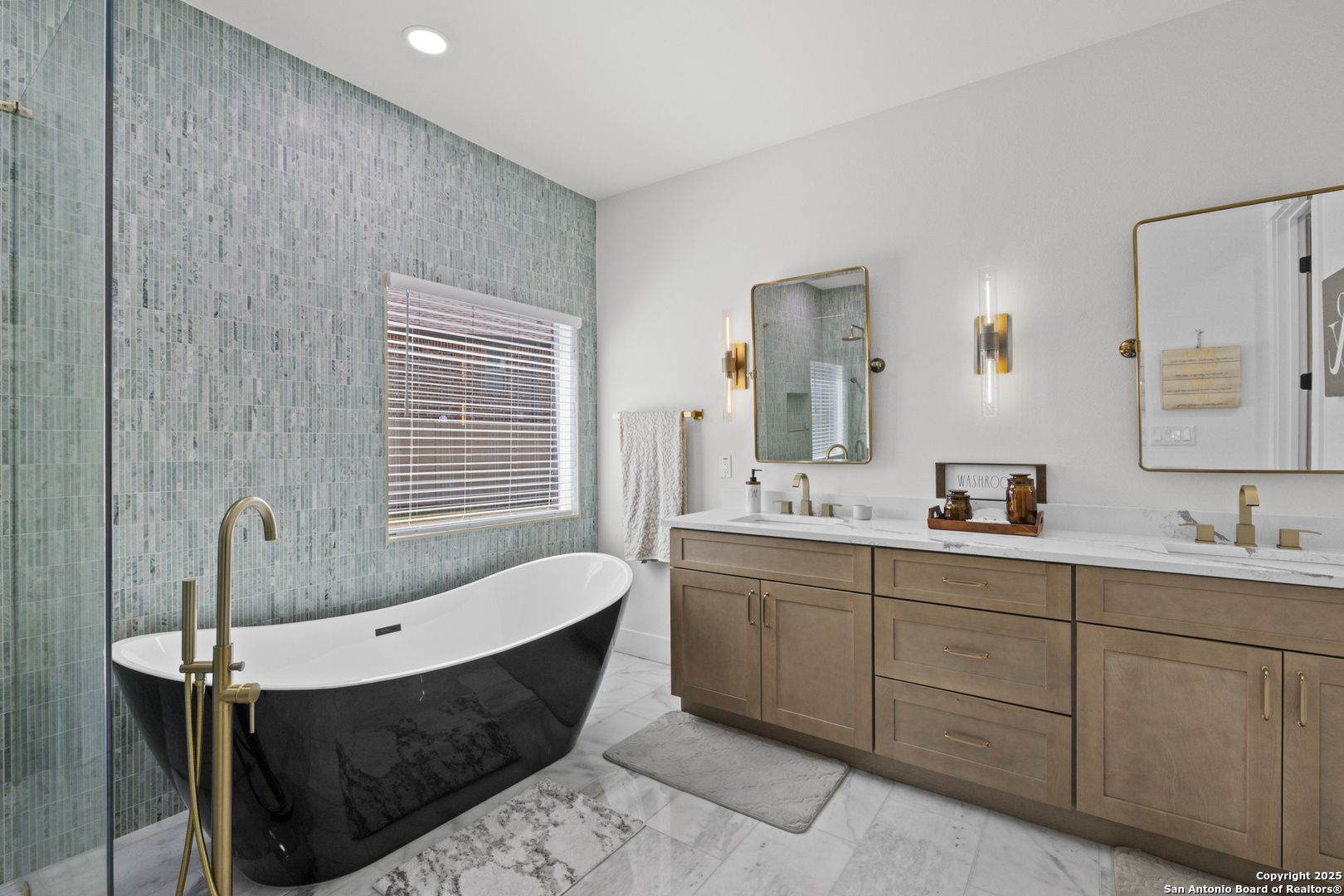Welcome to this fully remodeled, custom-built masterpiece in The Grove at Vintage Oaks, blending elegance with modern luxury. Easily the most custom home in the community, it boasts soaring ceilings, an open floor plan, and a thoughtfully designed layout. The main floor offers four bedrooms-three with en suite bathrooms-plus a dedicated office and a versatile second living space that can double as a workout room. Upstairs, you'll find a fifth bedroom connected to the media room, perfect for guests or extended family. The chef's kitchen features custom cabinetry, waterfall quartz countertops, and a seamless flow into the living and dining areas. In the primary suite, marble flooring, a marble shower, and a freestanding tub create a spa-like retreat. Recent upgrades include $20,000 in custom wood blinds, a new water heater, water softener, and sleek shower doors-making this home truly move-in ready for its next owner.