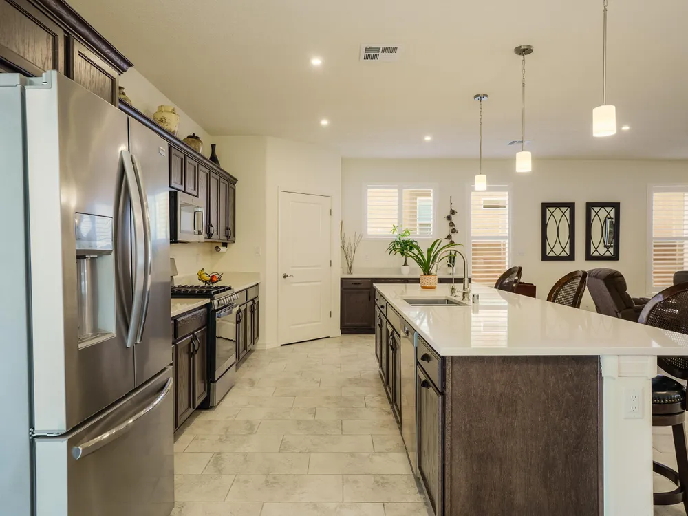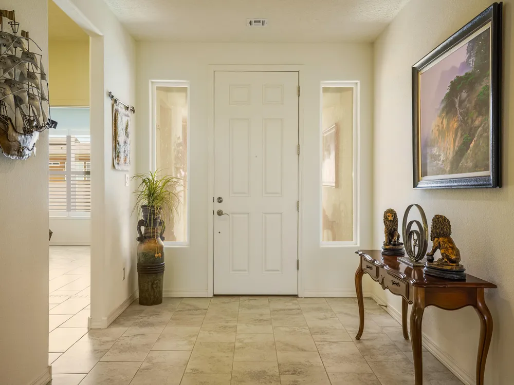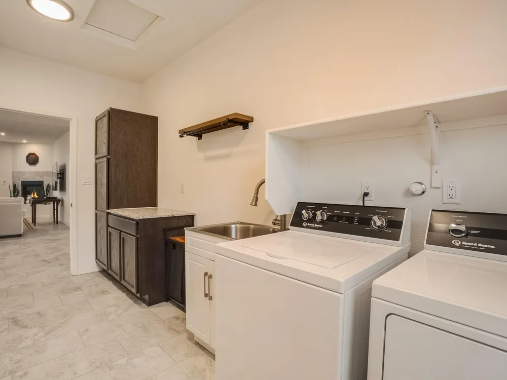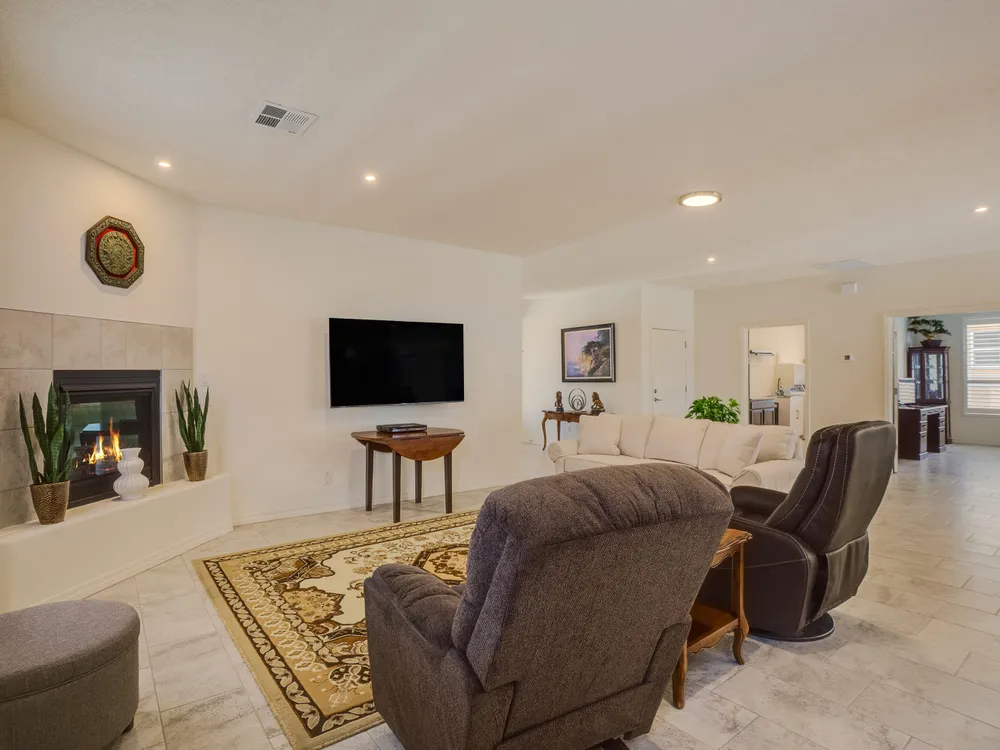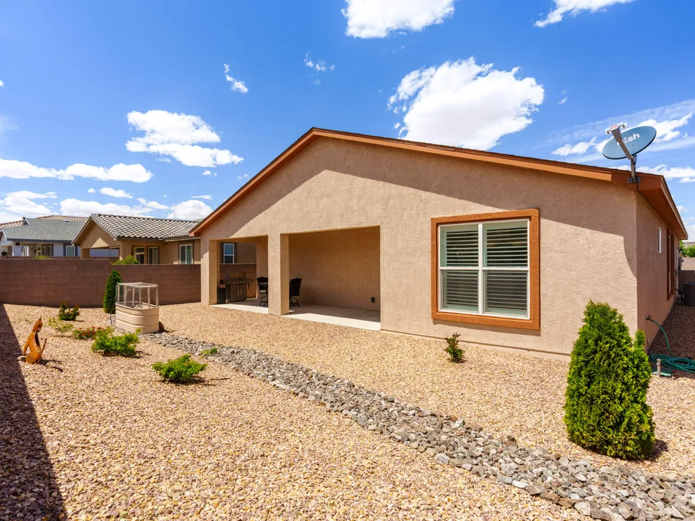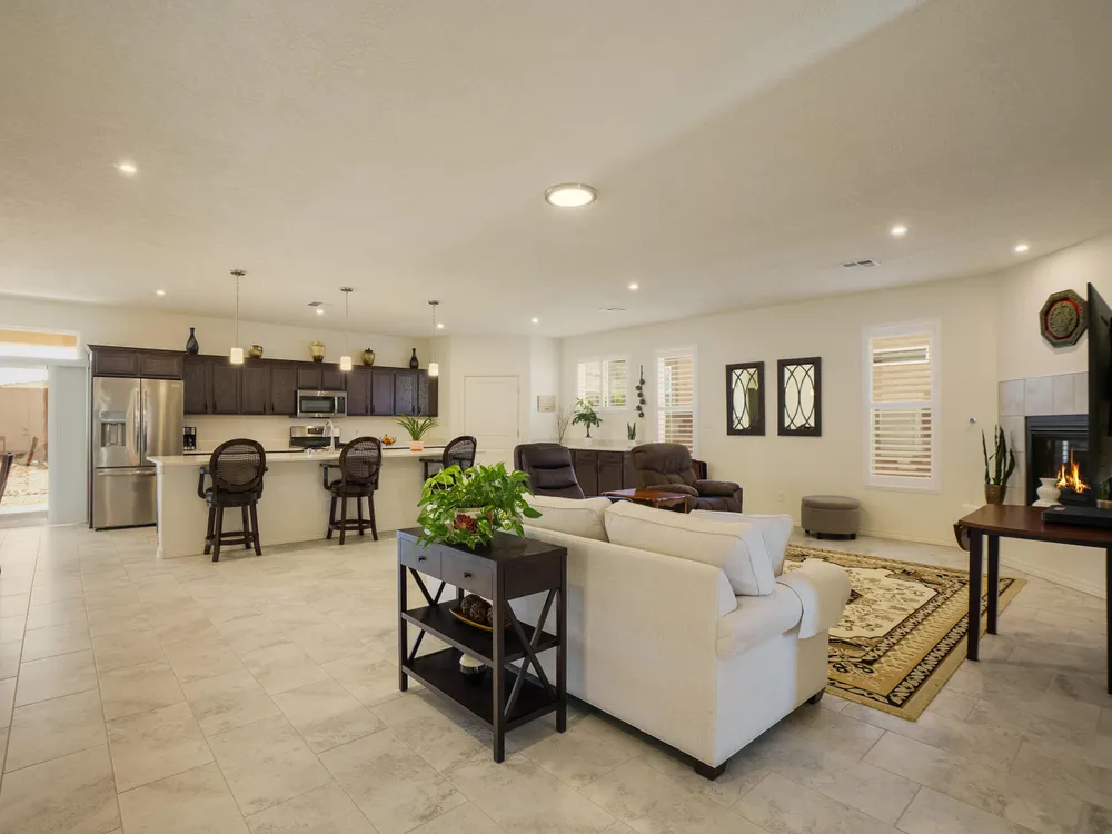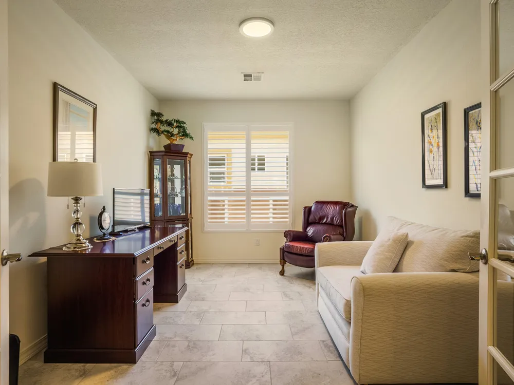 Just 2 years young, this home features a popular open living floor plan with a spacious kitchen island--perfect for gathering with friends. Enjoy NO carpet, custom kitchen cabinetry, extra storage and a sink in the large laundry room, plus built-in cabinets in the garage to keep everything organized. The flex room can be used as an office, den or 3rd bedroom. The backyard is landscaped for low-maintenance living, giving you more time to enjoy the good life.Located in the sought-after Jubilee 55+ active adult community in Los Lunas. Jubilee residents enjoy an unparalleled lifestyle with a vibrant social calendar and resort-style amenities, including a clubhouse, fitness center, billiards room, swimming pool, hot tub, pickleball courts, putting practice & driving range,