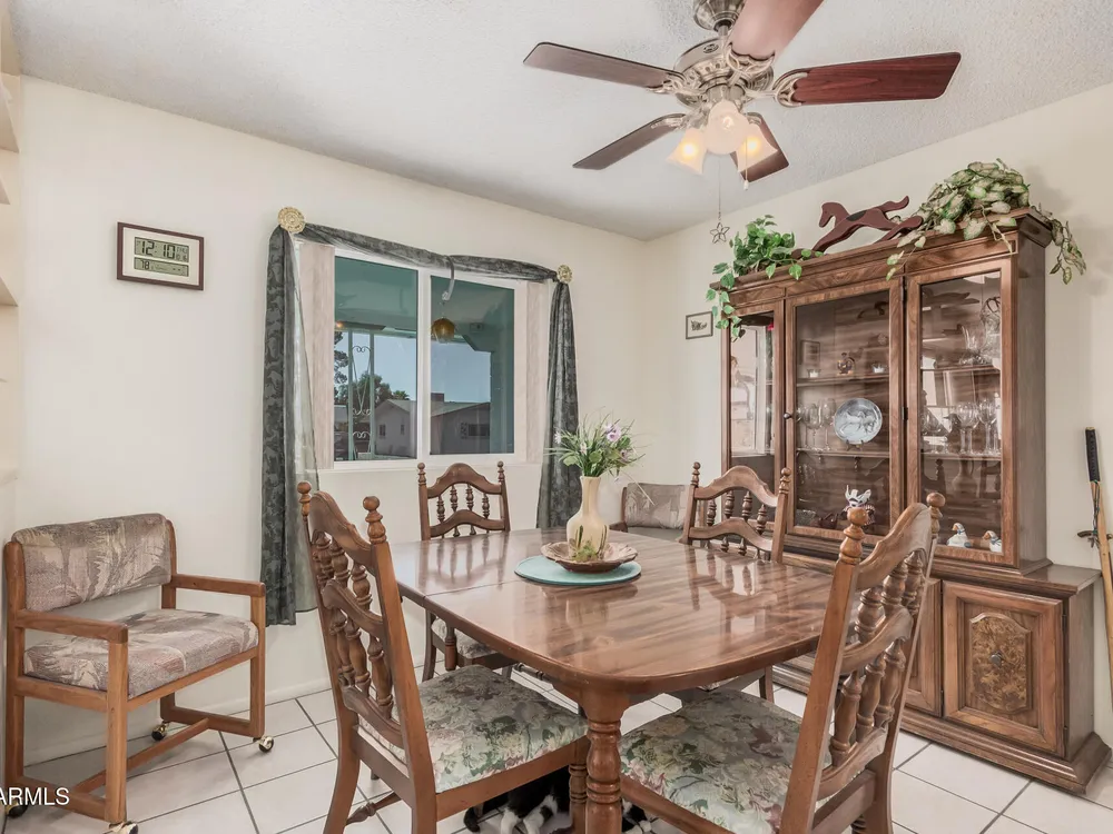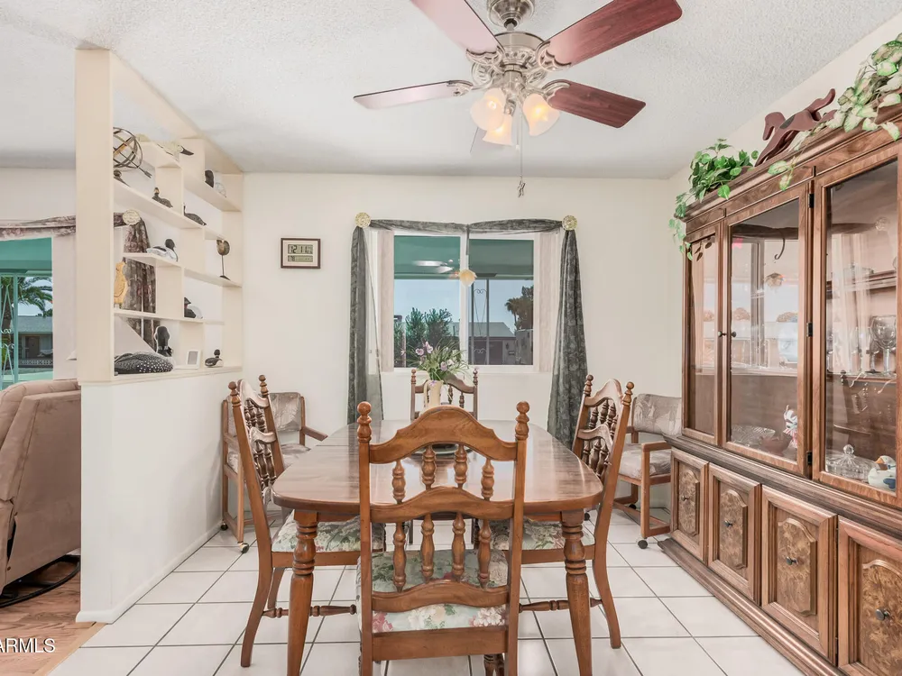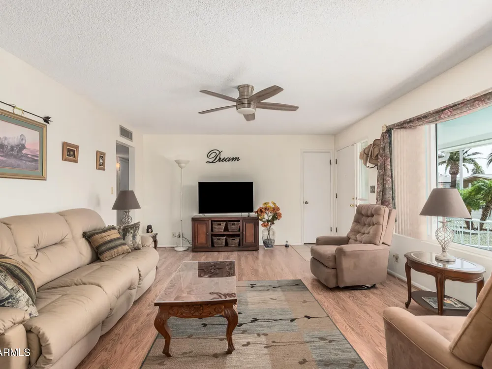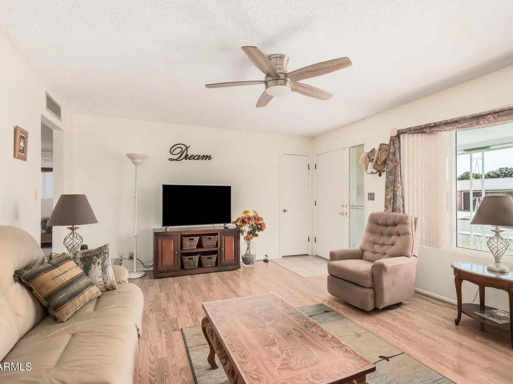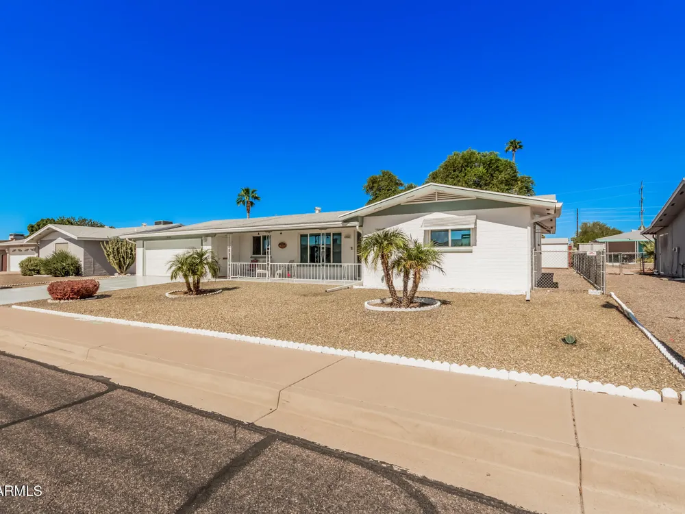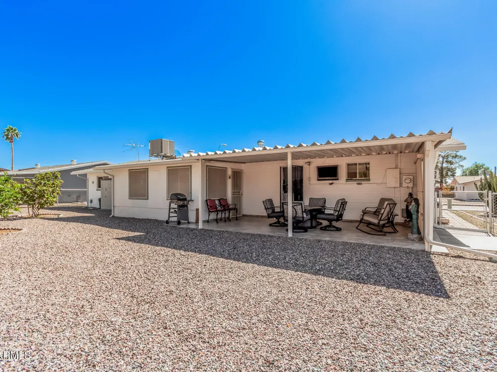 Beautifully maintained FURNISHED home in the desirable Dreamland Villa 55+ community. Situated on a generous fenced lot with north/south exposure, this home features large covered patios in the front and back and a fruit tree for added charm and Tuff Shed for storage. Enjoy energy efficiency with dual pane windows, roof replacement, added insulation, and ceiling fans throughout. You'll appreciate the laminate & tile flooring throughout the main living areas and carpet in the bedrooms. The kitchen features stylish gray cabinets, range, microwave, and refrigerator. The 2-car garage has an epoxy floor. The large laundry/workshop offers plenty of cabinets, work bench and storage for all your work/hobby needs. The Arizona room provides extra living space with vinyl plank flooring and exit to the beautiful covered patio. Conveniently located near shopping, restaurants, hospitals, and offers easy freeway access. Move-in ready and perfect for comfortable Arizona living!