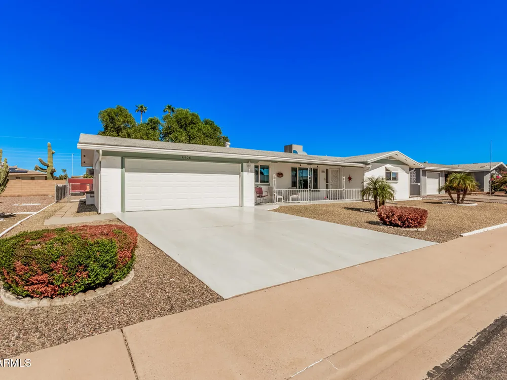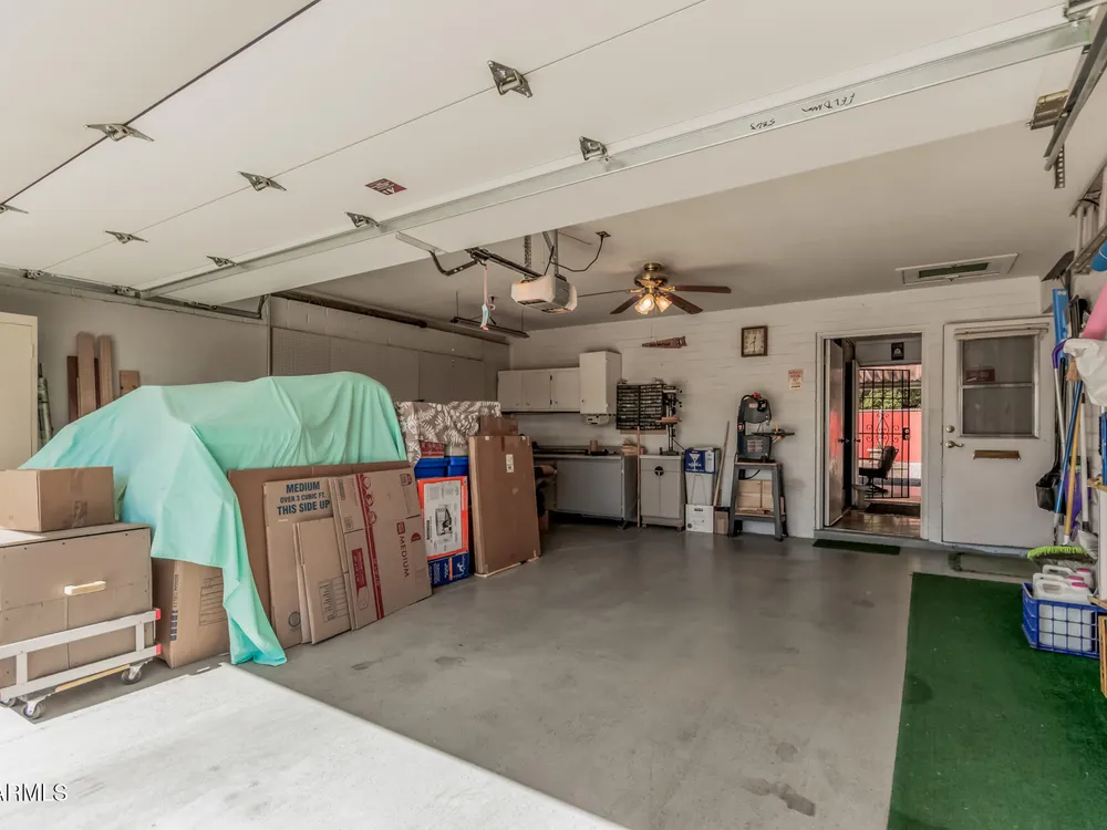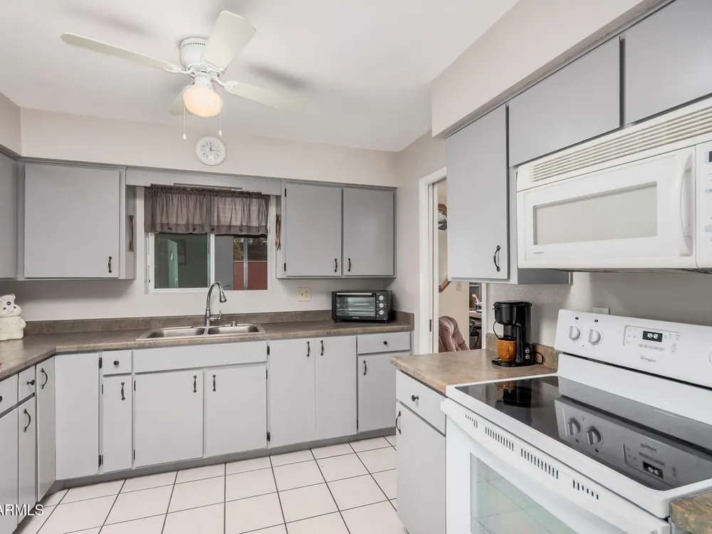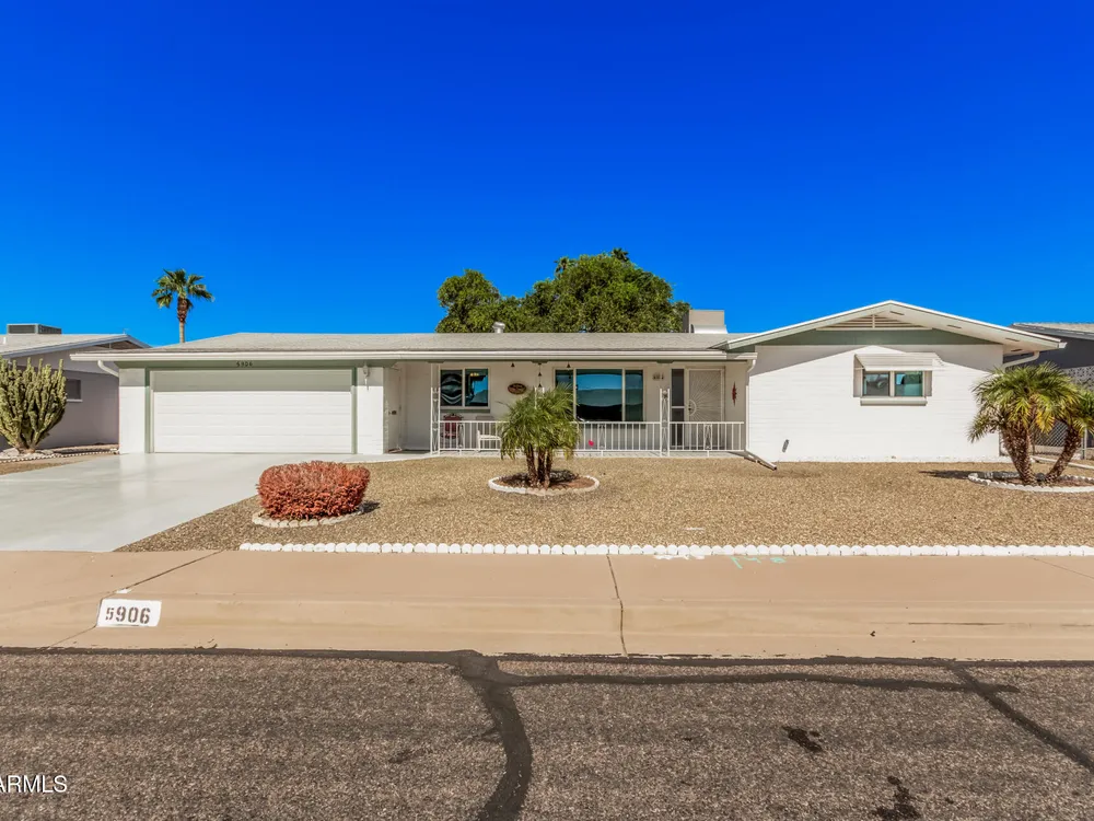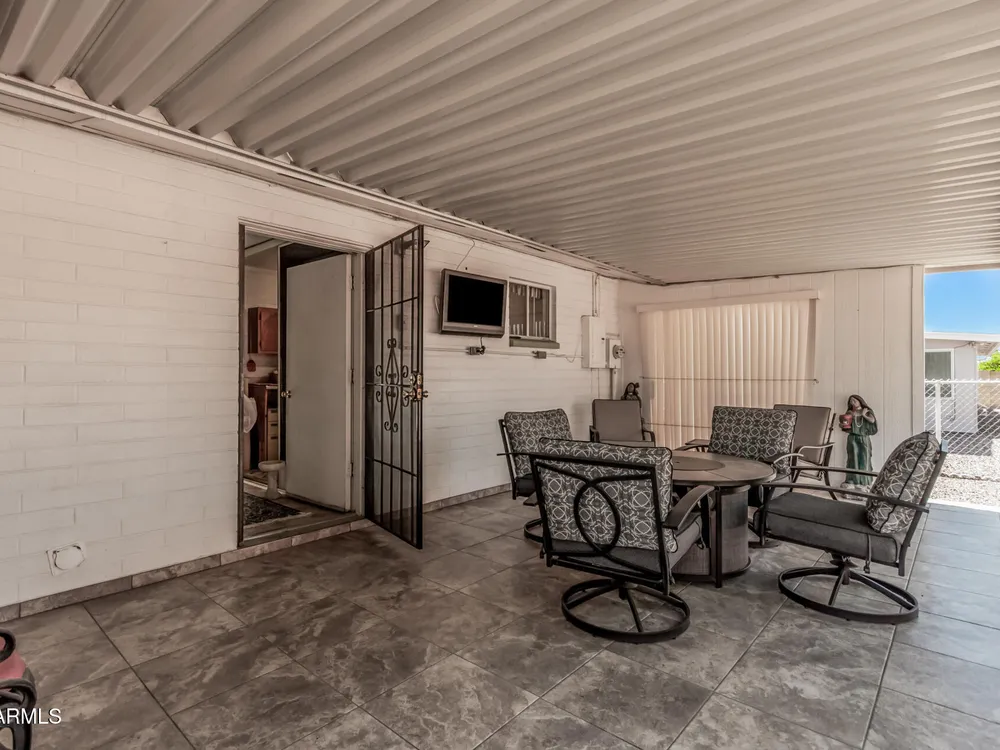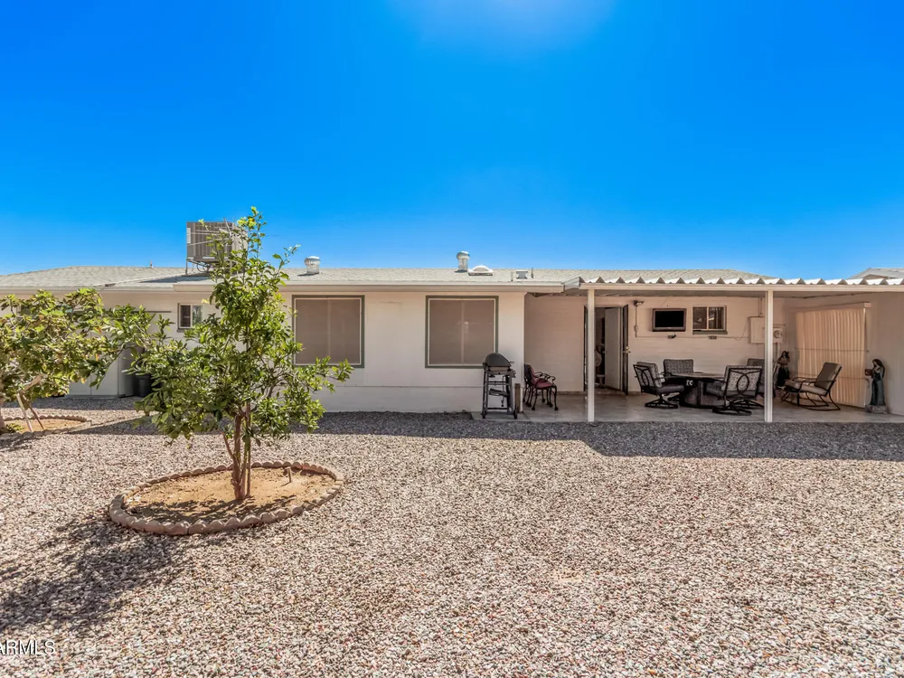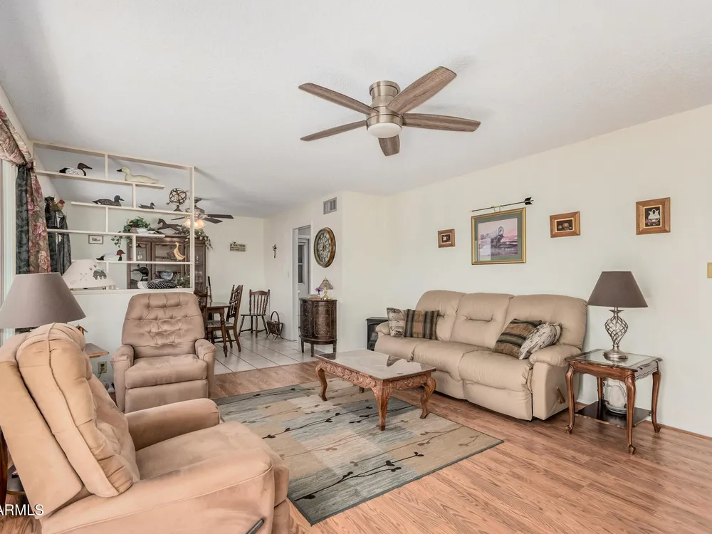 Beautifully maintained FURNISHED home in the desirable Dreamland Villa 55+ community. Situated on a generous fenced lot with north/south exposure, this home features large covered patios in the front and back and a fruit tree for added charm and Tuff Shed for storage. Enjoy energy efficiency with dual pane windows, roof replacement, added insulation, and ceiling fans throughout. You'll appreciate the laminate & tile flooring throughout the main living areas and carpet in the bedrooms. The kitchen features stylish gray cabinets, range, microwave, and refrigerator. The 2-car garage has an epoxy floor. The large laundry/workshop offers plenty of cabinets, work bench and storage for all your work/hobby needs. The Arizona room provides extra living space with vinyl plank flooring and exit to the beautiful covered patio. Conveniently located near shopping, restaurants, hospitals, and offers easy freeway access. Move-in ready and perfect for comfortable Arizona living!