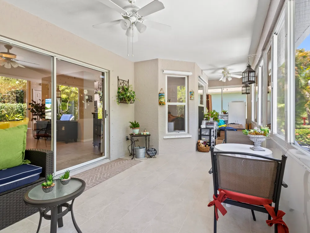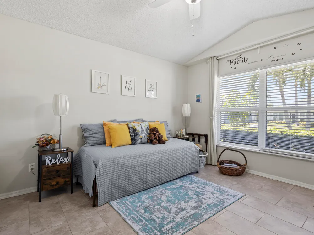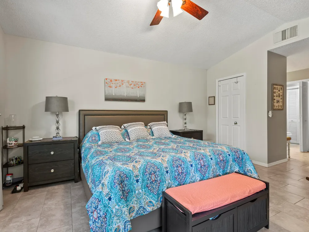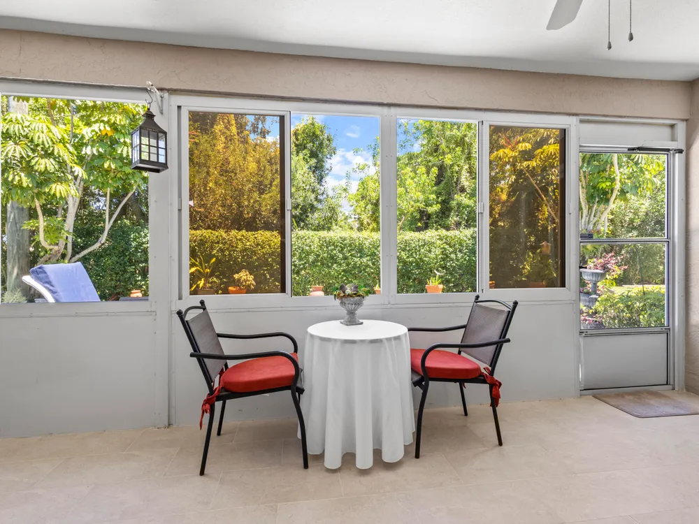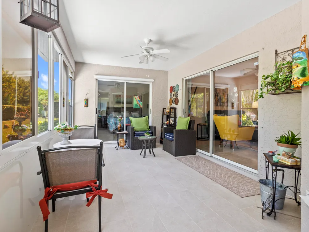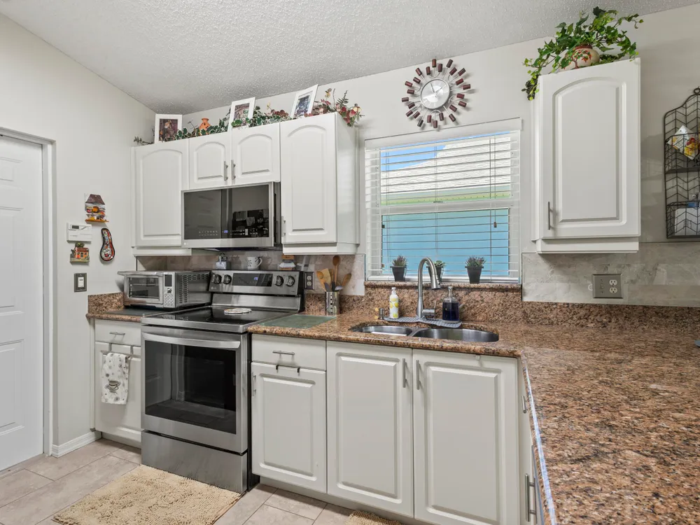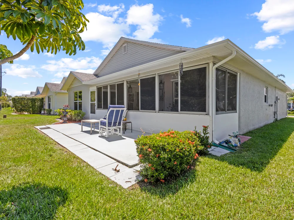 Welcome to Palm Grove! Updated 2-bedroom, 2-bath home offers a bright, open layout with spacious living and dining areas. The spacious kitchen features granite countertops, newer stainless-steel appliances, and plenty of cabinet space. Both bathrooms have been tastefully renovated, and the master bath includes a custom designer closet for added convenience. Enjoy Florida living at its finest with fully enclosed lanai plus an extended outdoor patio 10x20, perfect for entertaining, relaxing, or soaking up the sunshine. Residents of Palm Grove enjoy a secure, 24/7 manned gate, as well as the peaceful setting with resort-style amenities including a sparkling pool, tennis courts, shuffleboard, and a welcoming clubhouse.