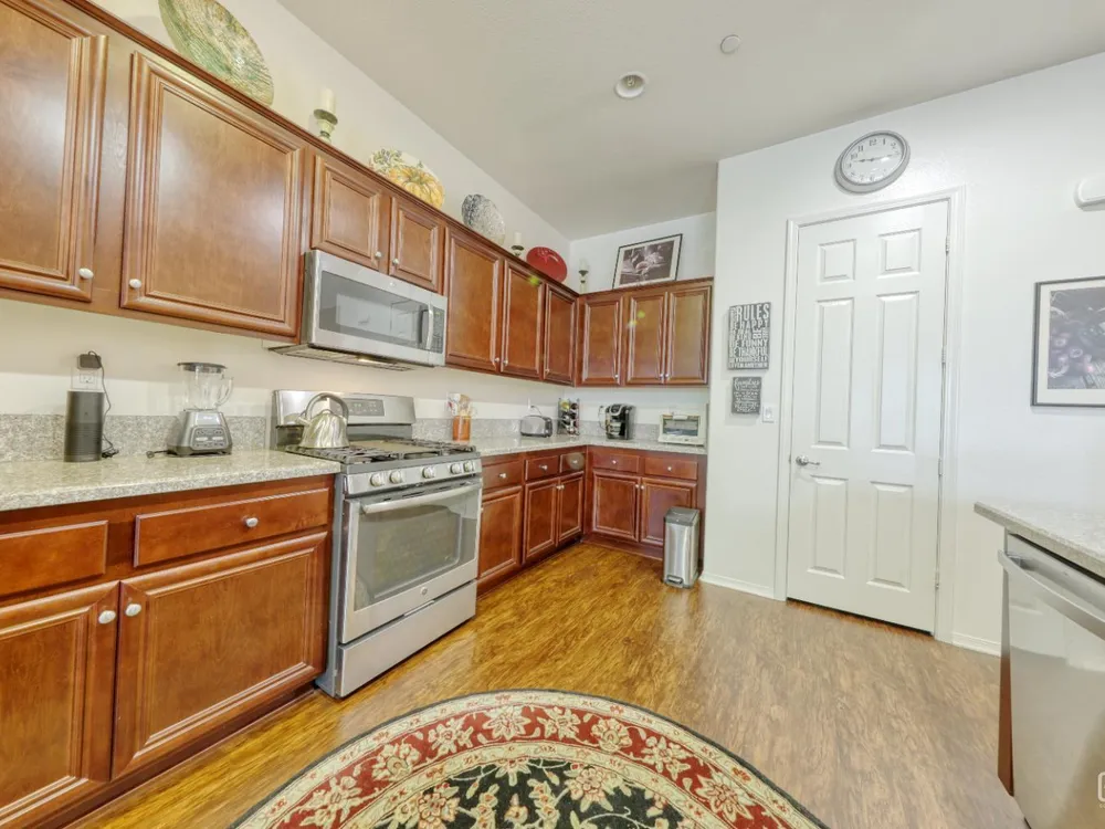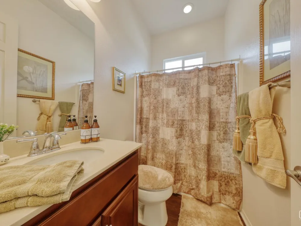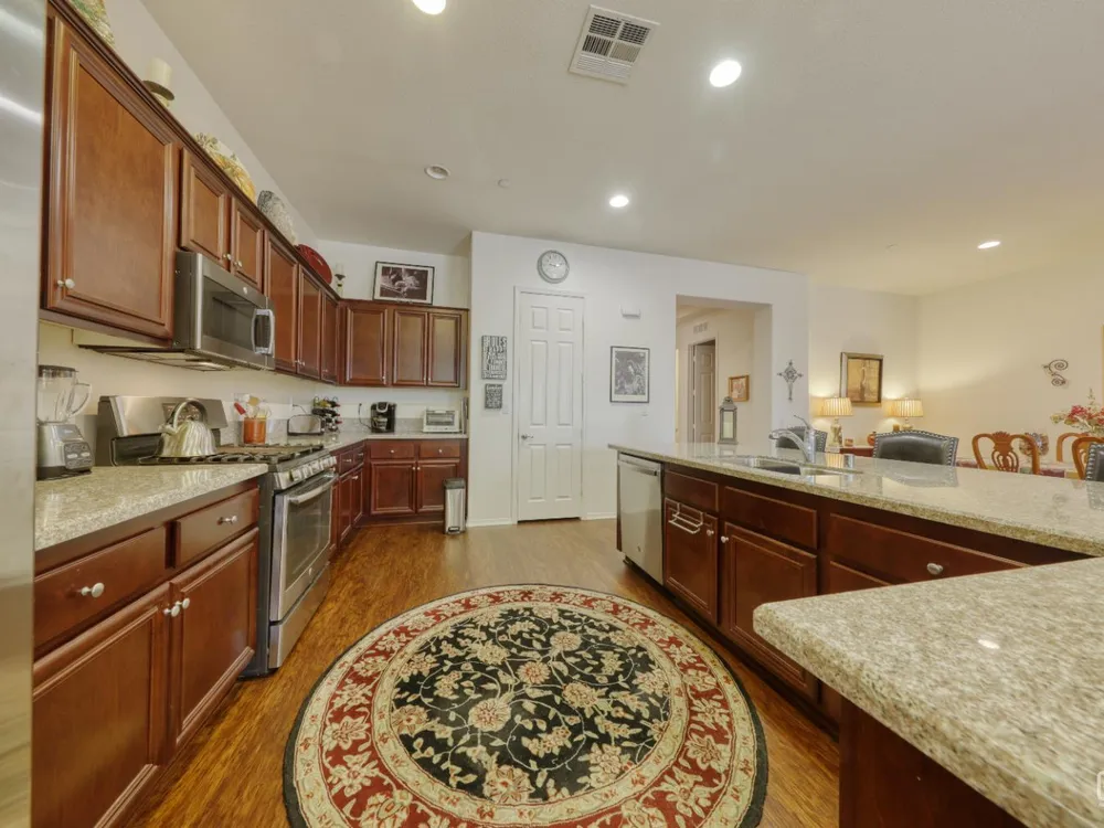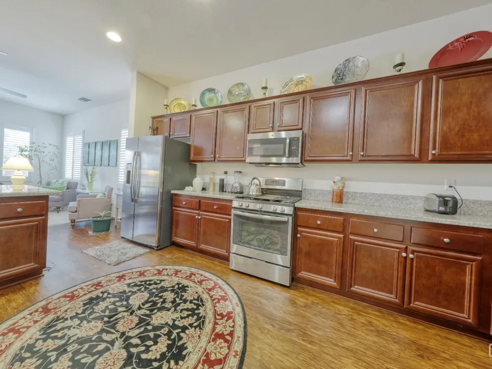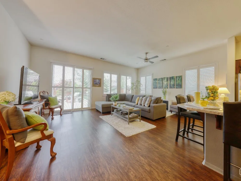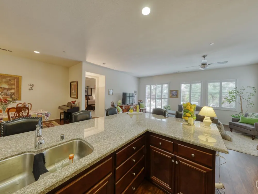 Start living your best life in the esteemed Four Seasons gated adult community. Open floor plan on quiet cul-de-sac. Gorgeous wood like flooring. Carpet in bedrooms and office. Kitchen has granite, pantry and stainless appliances plus a pantry. Spacious primary bedroom has room for a sitting area. Large walk-in closet and walk-in shower and soaking tub. Split wing. Spacious laundry room with loads of storage. Beautiful, very private, park like maintenance free backyard with small bridges, fire pit and artificial turf that saves on your water bill. The Four Seasons Lodge is exceptional with many events planned for residents. It has a fitness center, movie theater, billiards/games and rooms for computers, library, crafts and ballroom. Also a cafe, plus weekly Bingo. Outside is pool, spa, pickle ball, bocci ball, patio with large fire pit, beauty salon. Many activities such as dance and water aerobics, cards, board games, Mahjong. What's not to love!