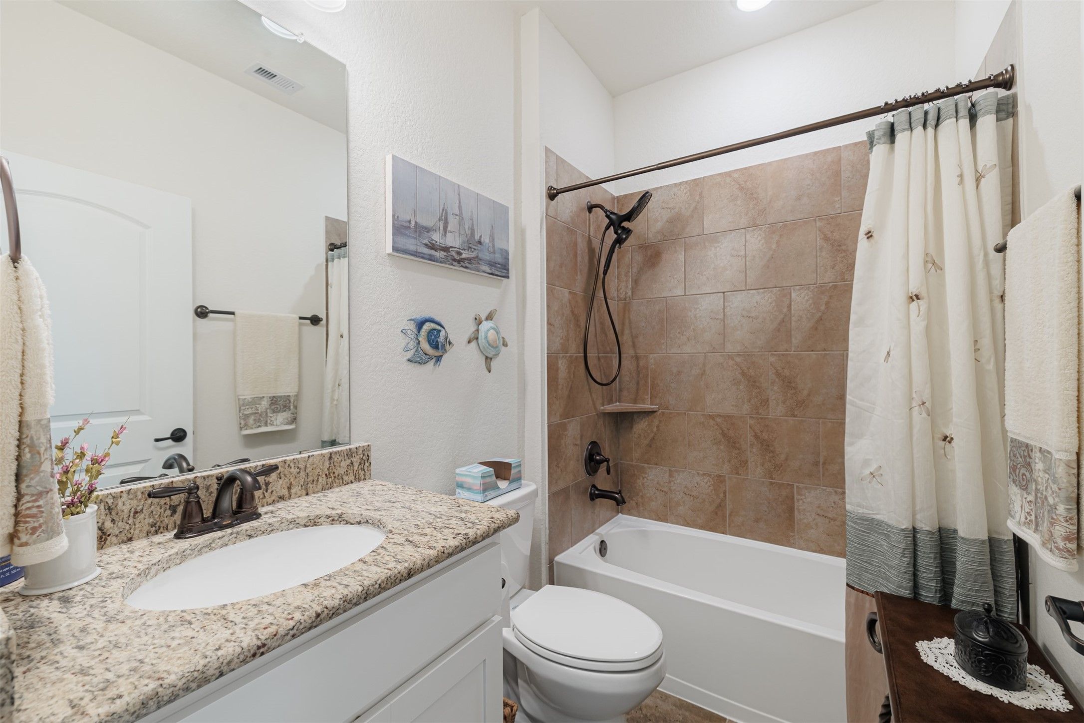 - Breakfast Bar, Crown Molding, Double Vanity, Granite Counters, High Ceilings, Kitchen Island, Kitchen/Family Room Combo, Pantry, Tub Shower, Window Treatments, Ceiling Fan(s), Programmable Thermostat