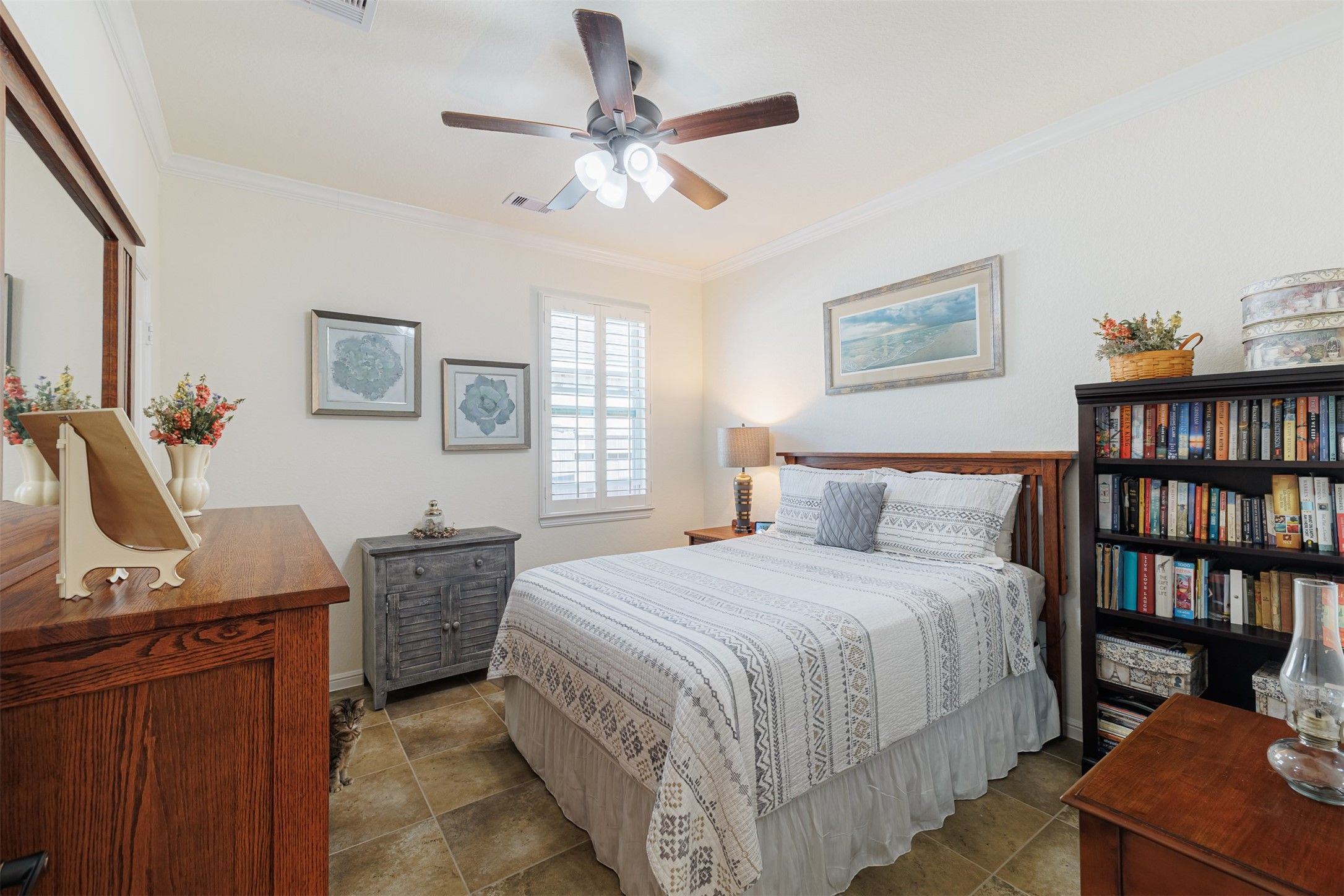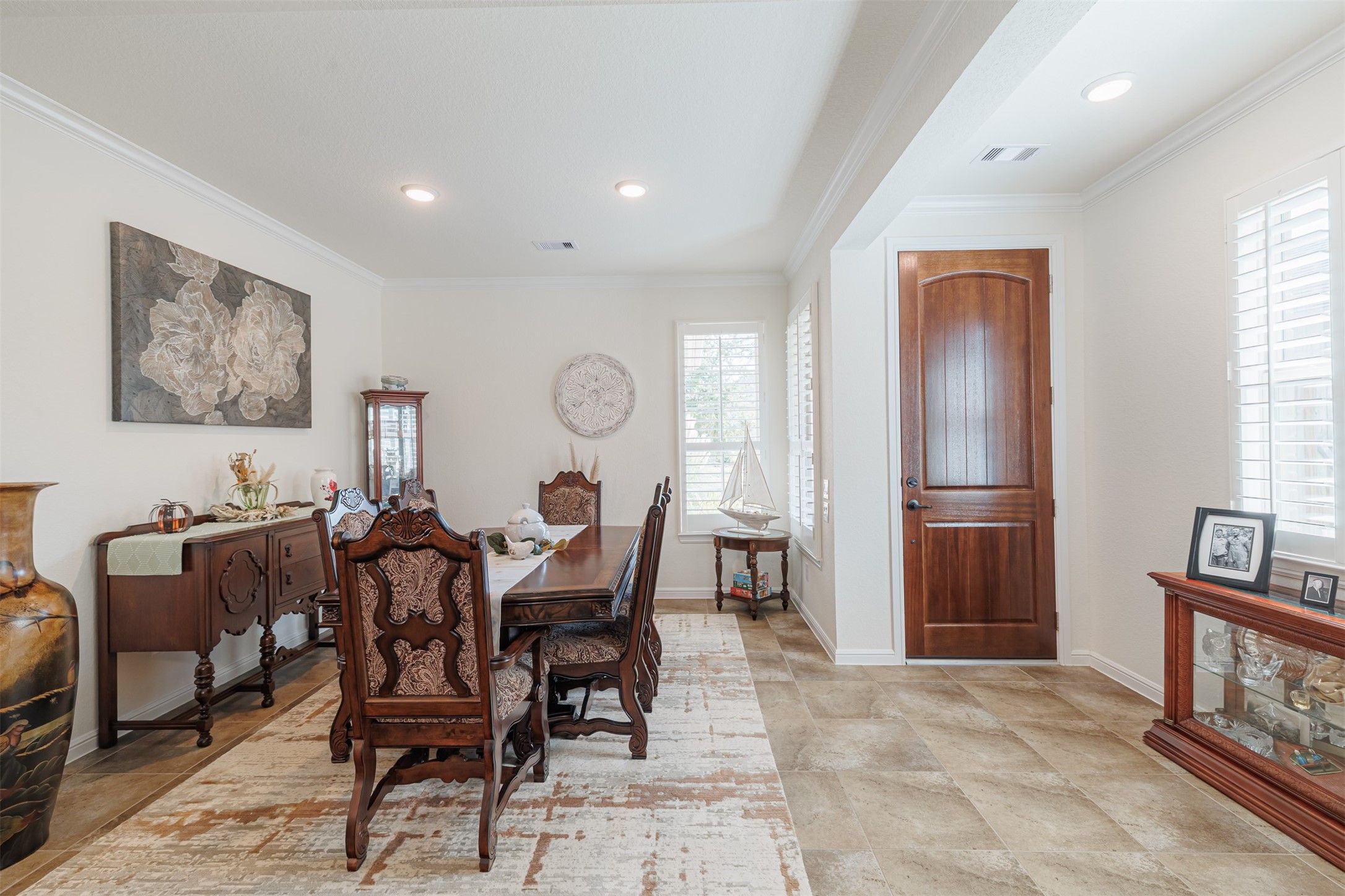 Gorgeous 2-bedroom, 2-bath home nestled in the highly sought-after 55+ Active Adult Community of Cross Creek Ranch. The beautifully landscaped front yard sets a welcoming tone. Step inside to a formal dining room accented with crown molding and recessed lighting. Tile flooring and plantation shutters flow throughout the home. The spacious family room boasts a wall of windows overlooking the serene backyard and opens seamlessly to the island kitchen featuring a breakfast bar, pendant lighting, stainless steel appliances, gas cooking, double ovens, under-cabinet lighting, and a convenient pantry. The lovely primary suite offers dual vanities, a walk-in shower, and a generous walk-in closet. Additional highlights include an owned water softener and pull-down attic stairs providing easy access to extra storage space. Enjoy relaxing or entertaining on the large covered patio surrounded by lush landscaping.
