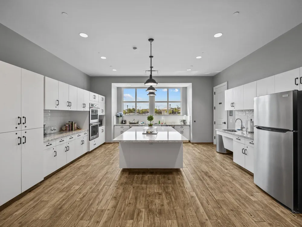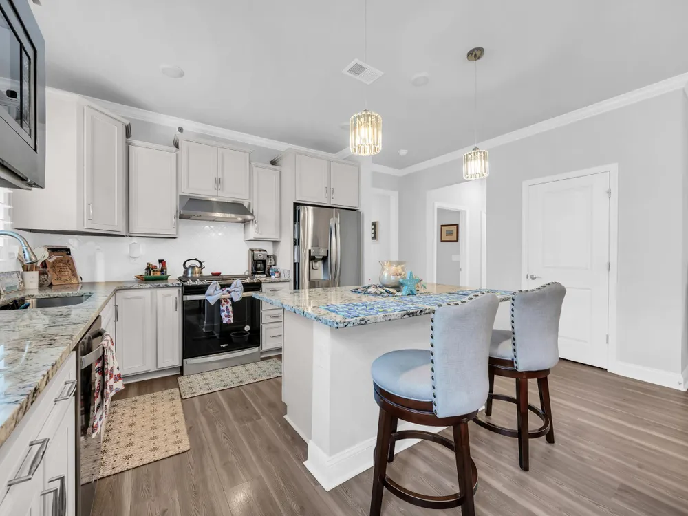 - Kitchen Island, Stainless Steel Appliances, Solid Surface Counters