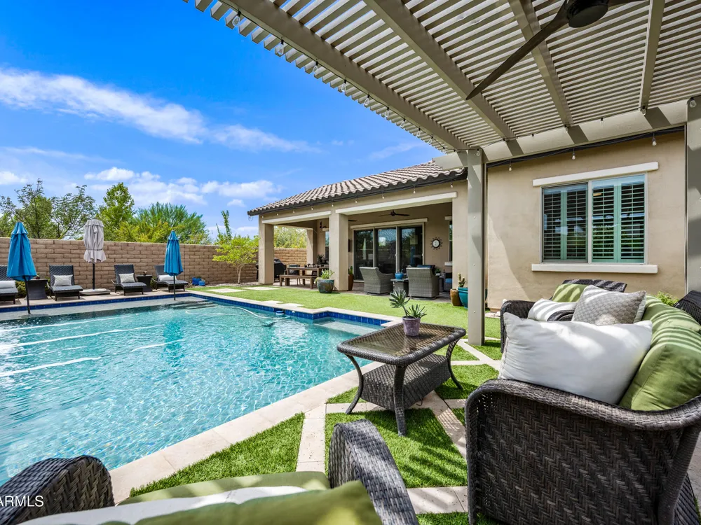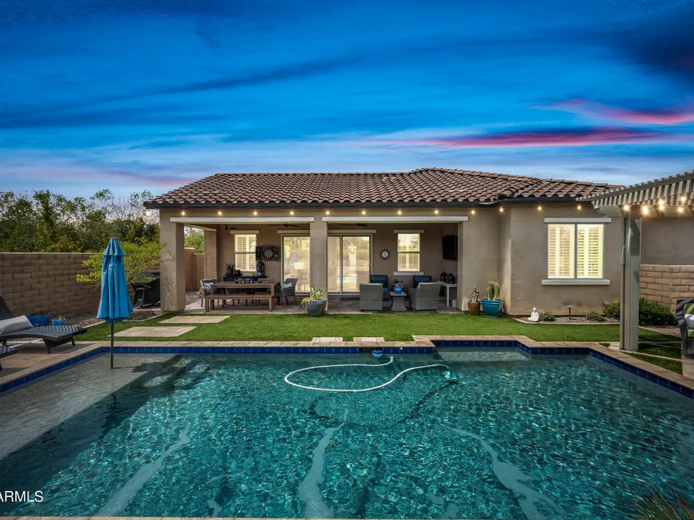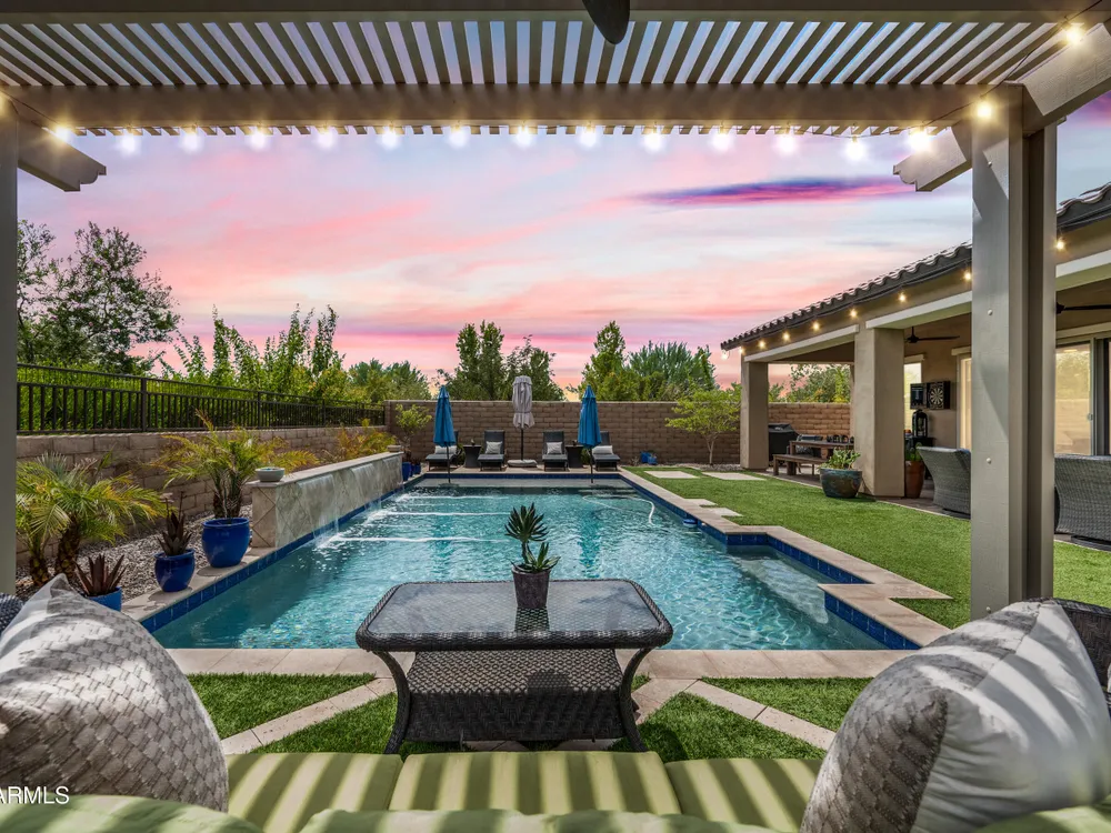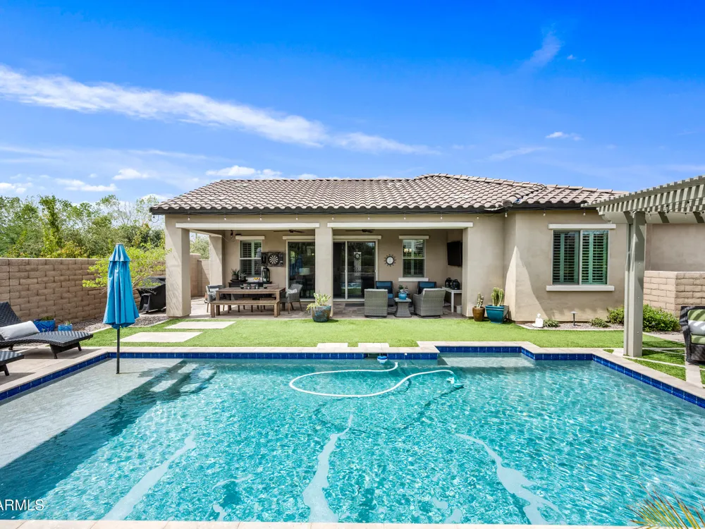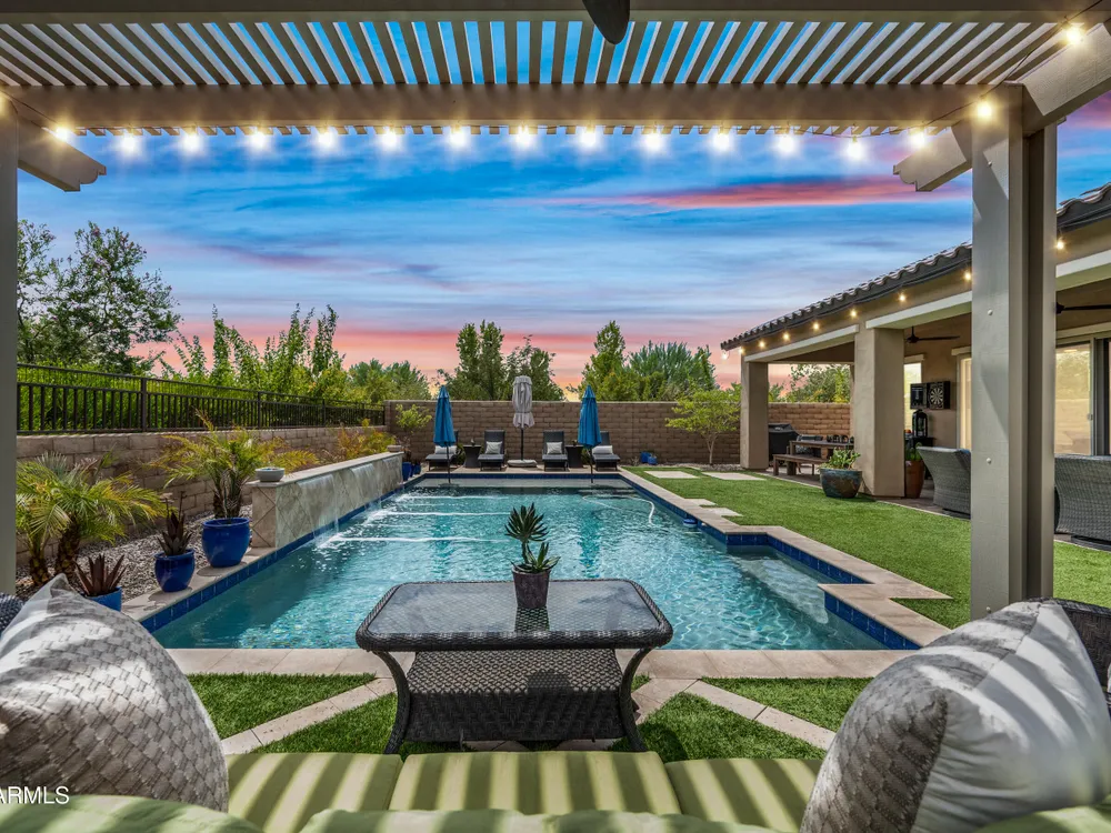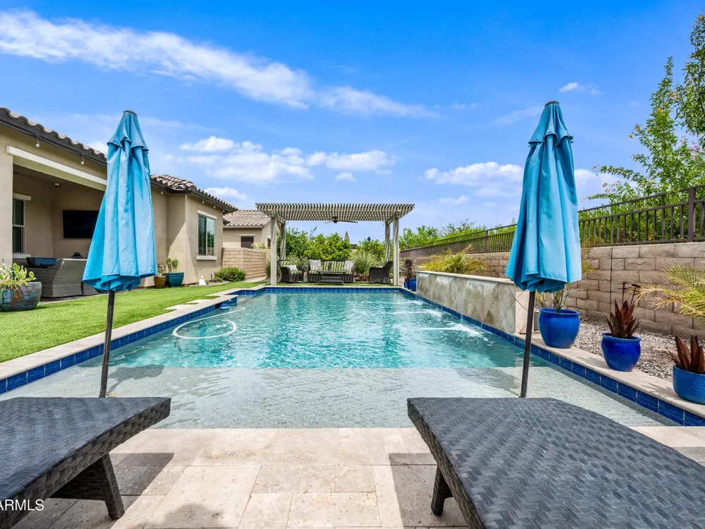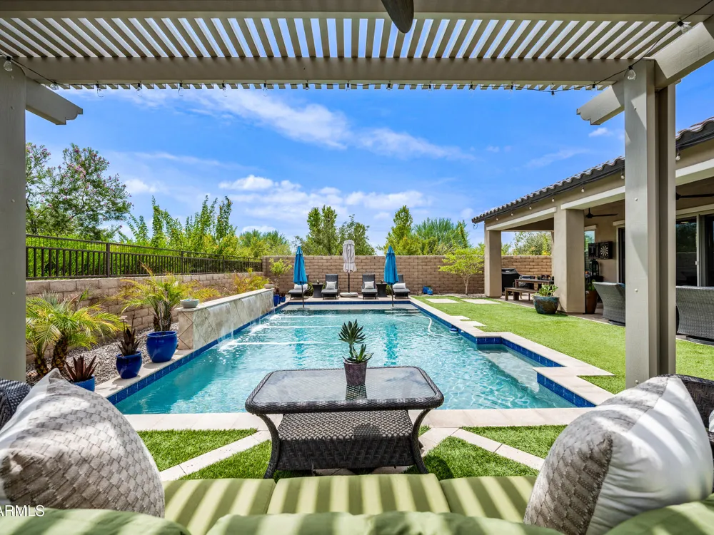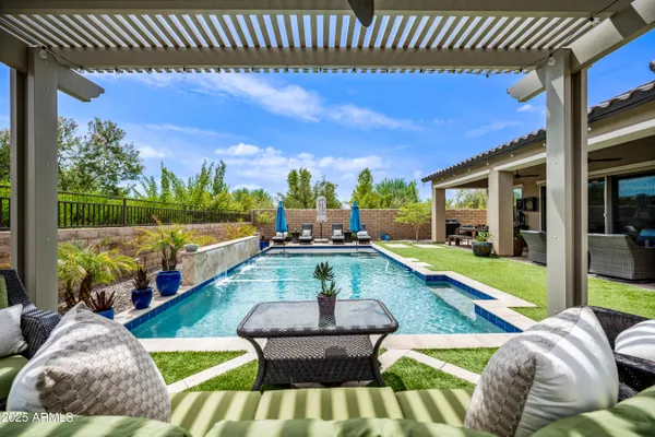 Beautifully upgraded single-story home in the highly sought-after 55+ community of Encore at Eastmark. Open Ballet floor plan with wood-look tile, plantation shutters, and abundant natural light from triple sliding doors with motorized shades. Chef's kitchen features white cabinetry, granite countertops, large island, coffee bar, and walk-in pantry. Two ensuite bedrooms and den/third bedroom, 2.5 baths, office, and remodeled bathrooms with spa-like primary suite. Backyard oasis with sparkling pool, water feature, travertine patio, pergolas, and fruit trees. Oversized 2.5-car garage with epoxy floors and storage. Premium corner lot with wraparound porch. Encore amenities include pickleball, tennis, bocce, fitness, billiards, library, and vibrant social events.