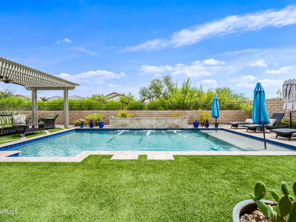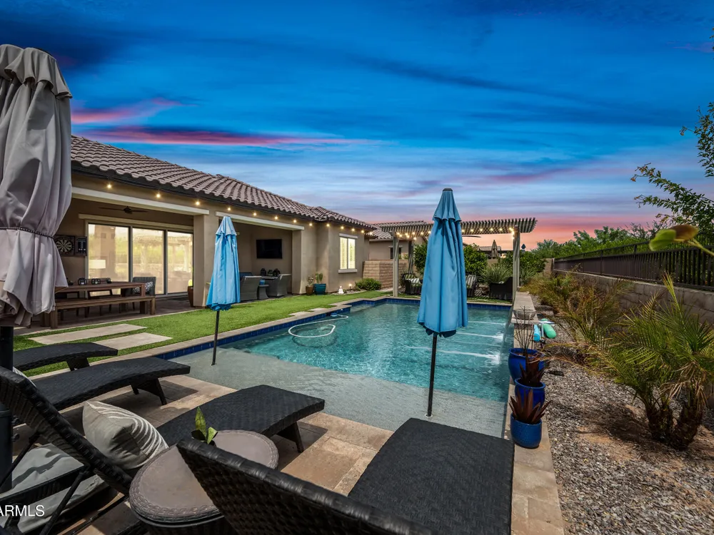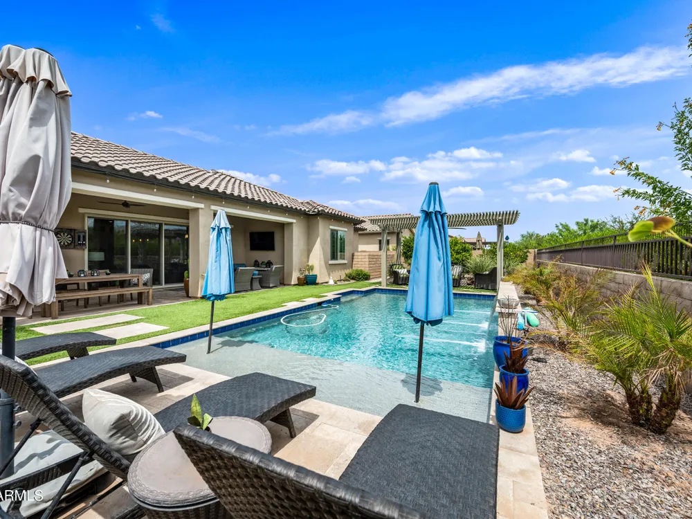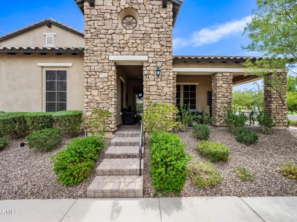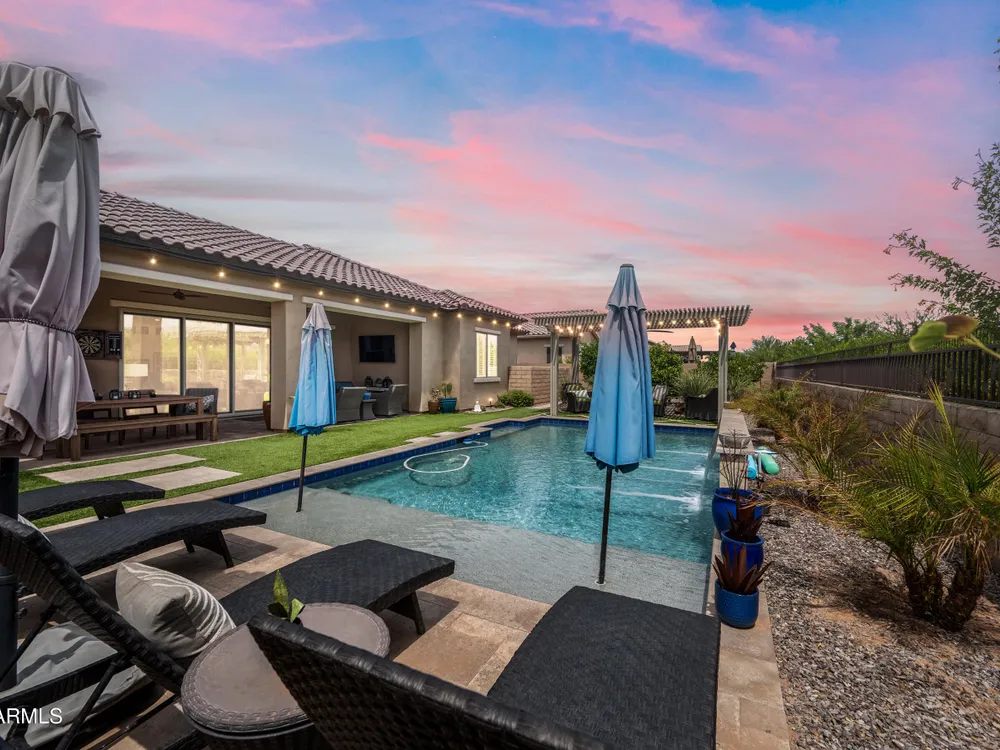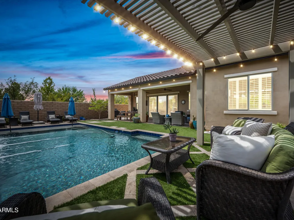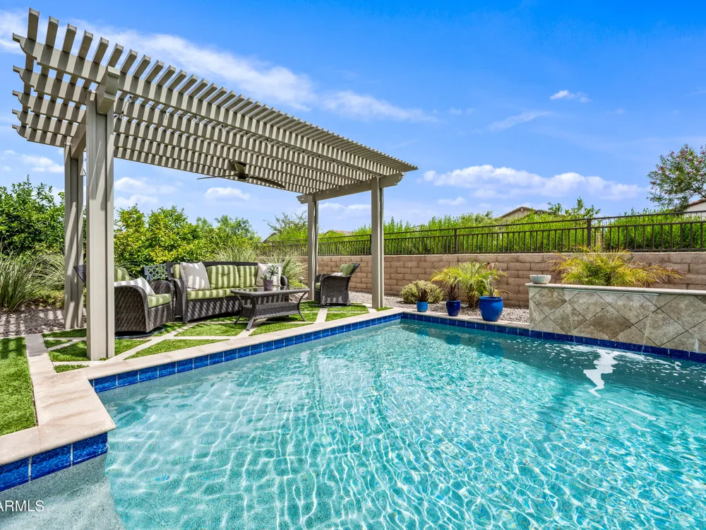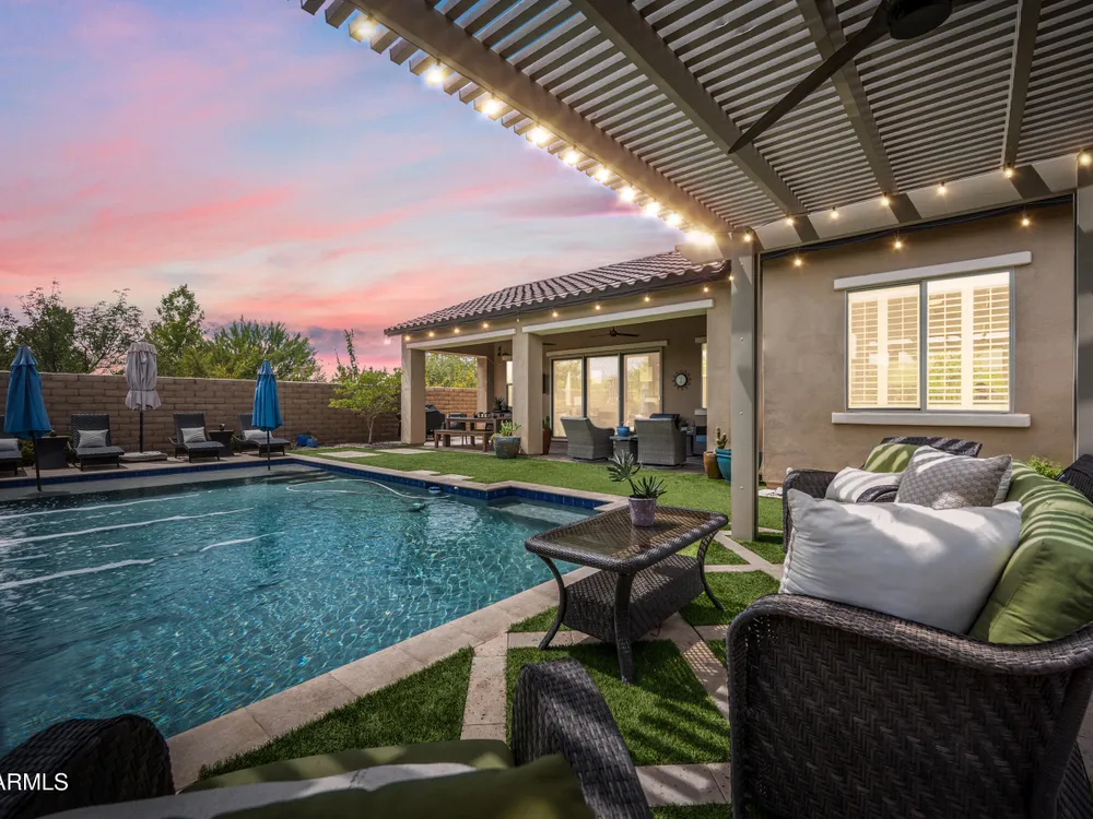 Beautifully upgraded single-story home in the highly sought-after 55+ community of Encore at Eastmark. Open Ballet floor plan with wood-look tile, plantation shutters, and abundant natural light from triple sliding doors with motorized shades. Chef's kitchen features white cabinetry, granite countertops, large island, coffee bar, and walk-in pantry. Two ensuite bedrooms and den/third bedroom, 2.5 baths, office, and remodeled bathrooms with spa-like primary suite. Backyard oasis with sparkling pool, water feature, travertine patio, pergolas, and fruit trees. Oversized 2.5-car garage with epoxy floors and storage. Premium corner lot with wraparound porch. Encore amenities include pickleball, tennis, bocce, fitness, billiards, library, and vibrant social events.
