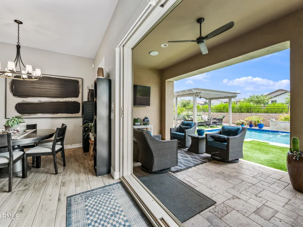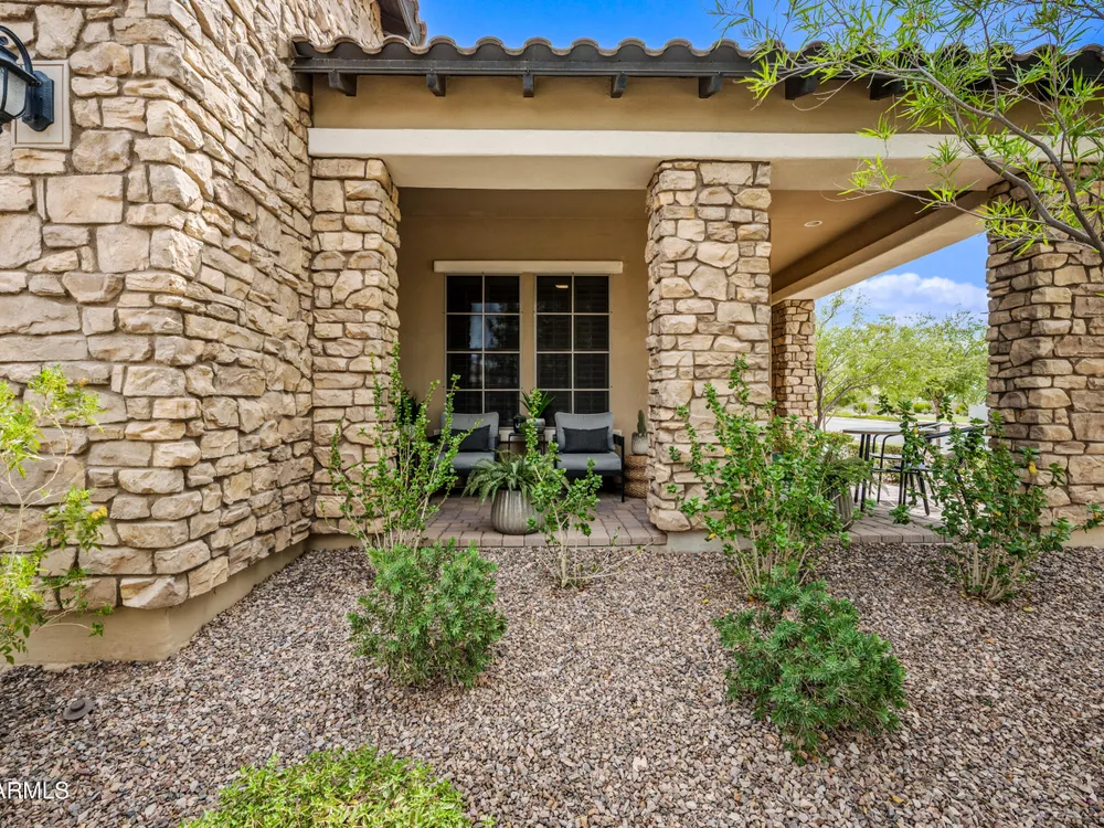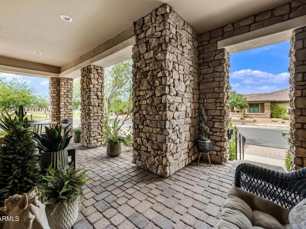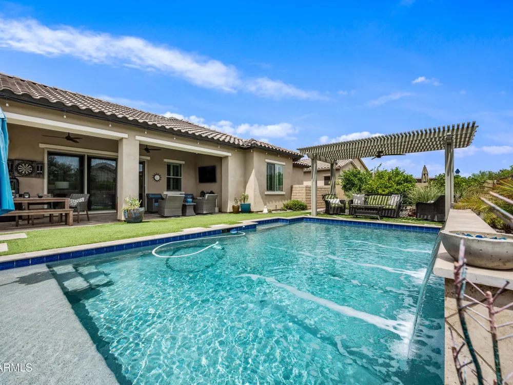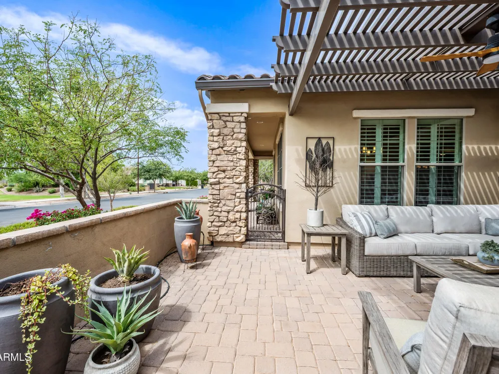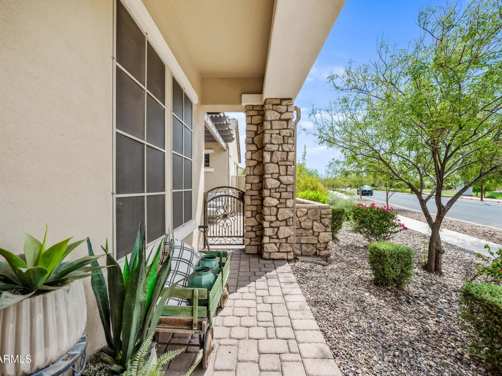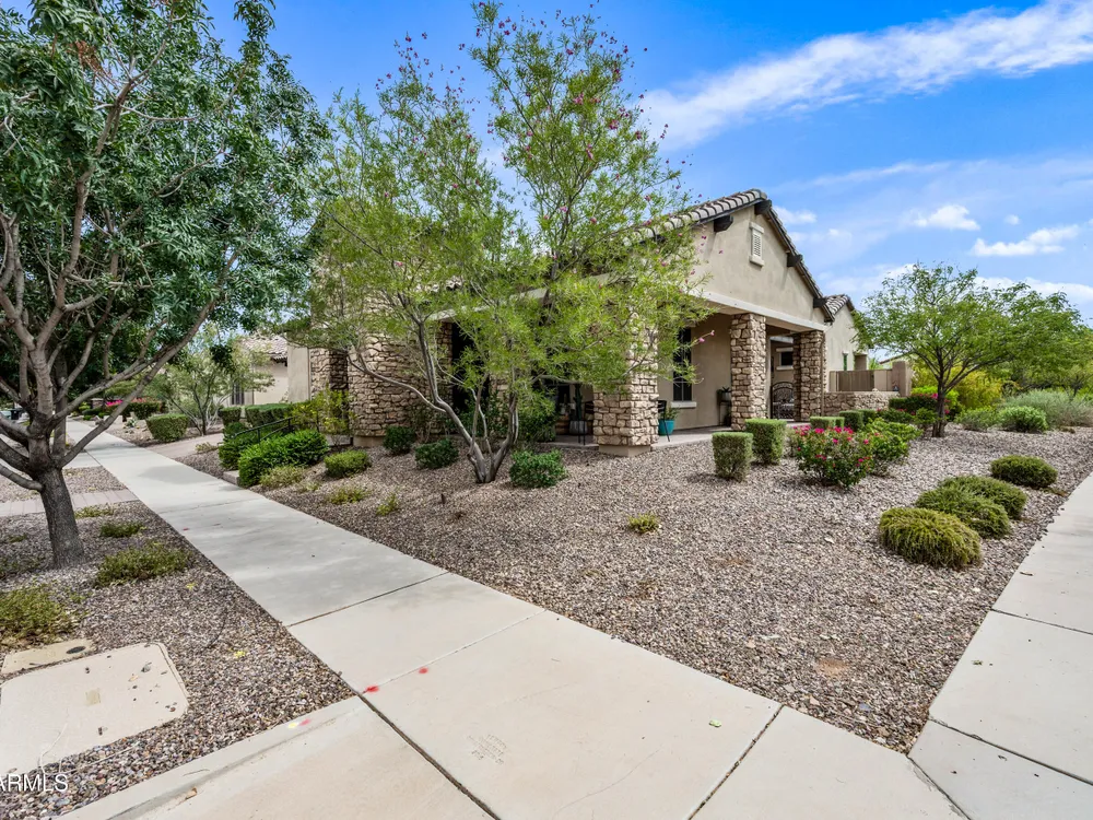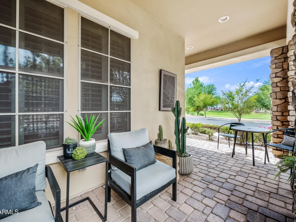 Beautifully upgraded single-story home in the highly sought-after 55+ community of Encore at Eastmark. Open Ballet floor plan with wood-look tile, plantation shutters, and abundant natural light from triple sliding doors with motorized shades. Chef's kitchen features white cabinetry, granite countertops, large island, coffee bar, and walk-in pantry. Two ensuite bedrooms and den/third bedroom, 2.5 baths, office, and remodeled bathrooms with spa-like primary suite. Backyard oasis with sparkling pool, water feature, travertine patio, pergolas, and fruit trees. Oversized 2.5-car garage with epoxy floors and storage. Premium corner lot with wraparound porch. Encore amenities include pickleball, tennis, bocce, fitness, billiards, library, and vibrant social events.