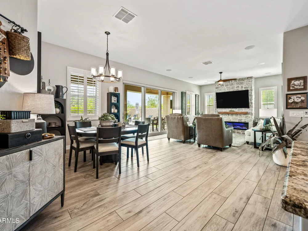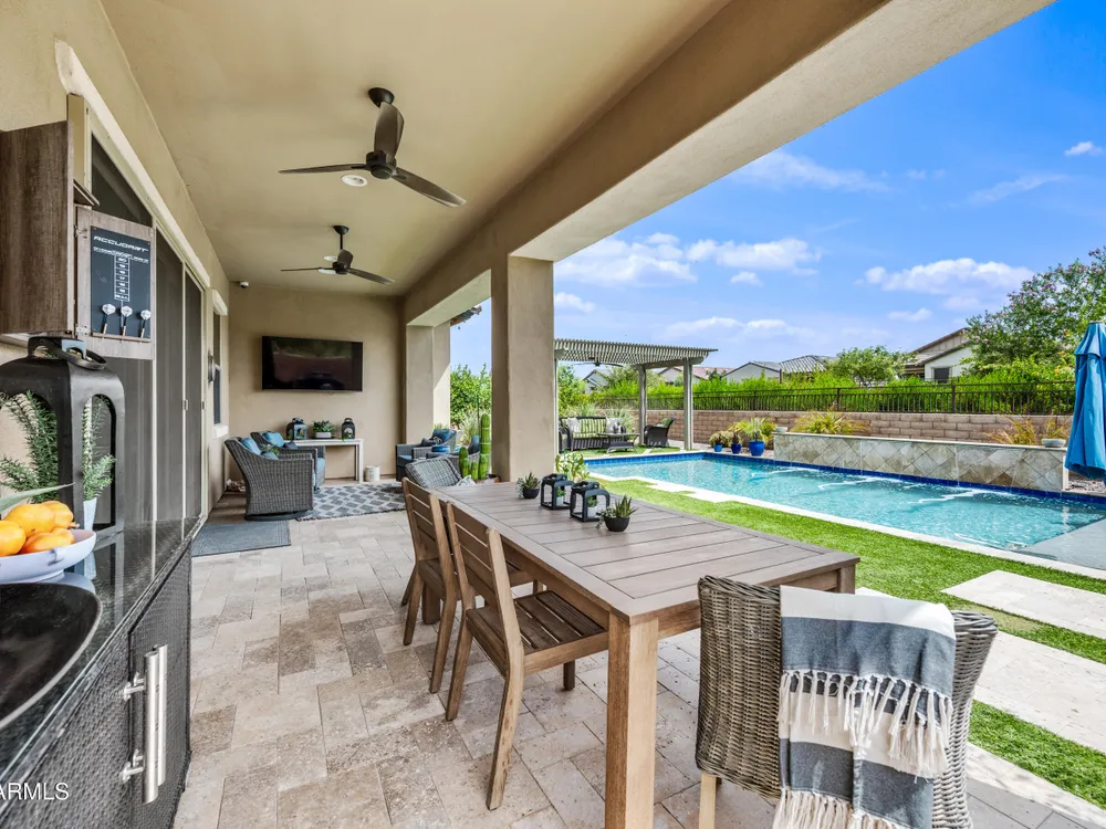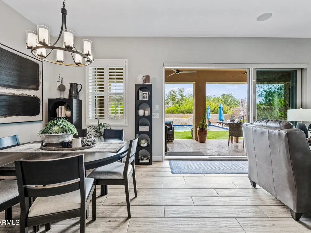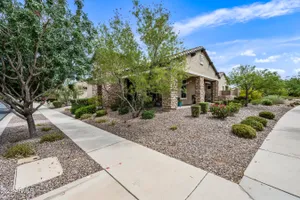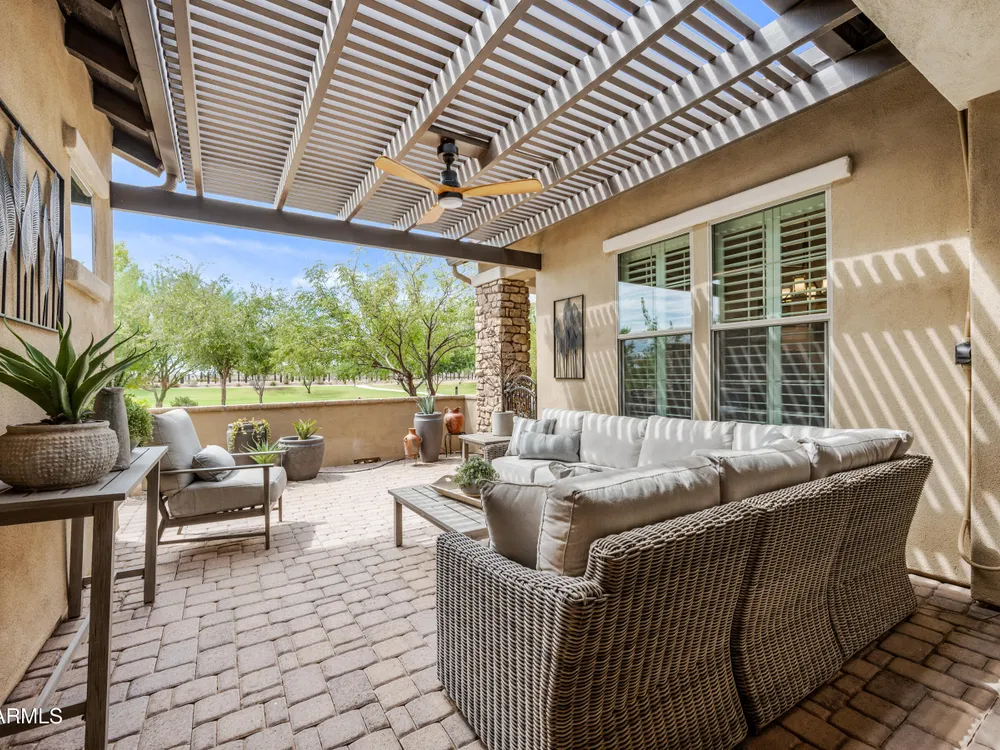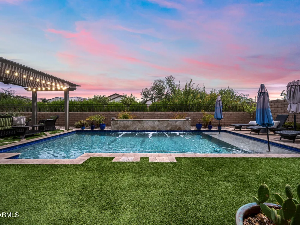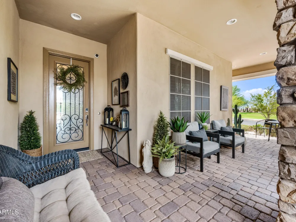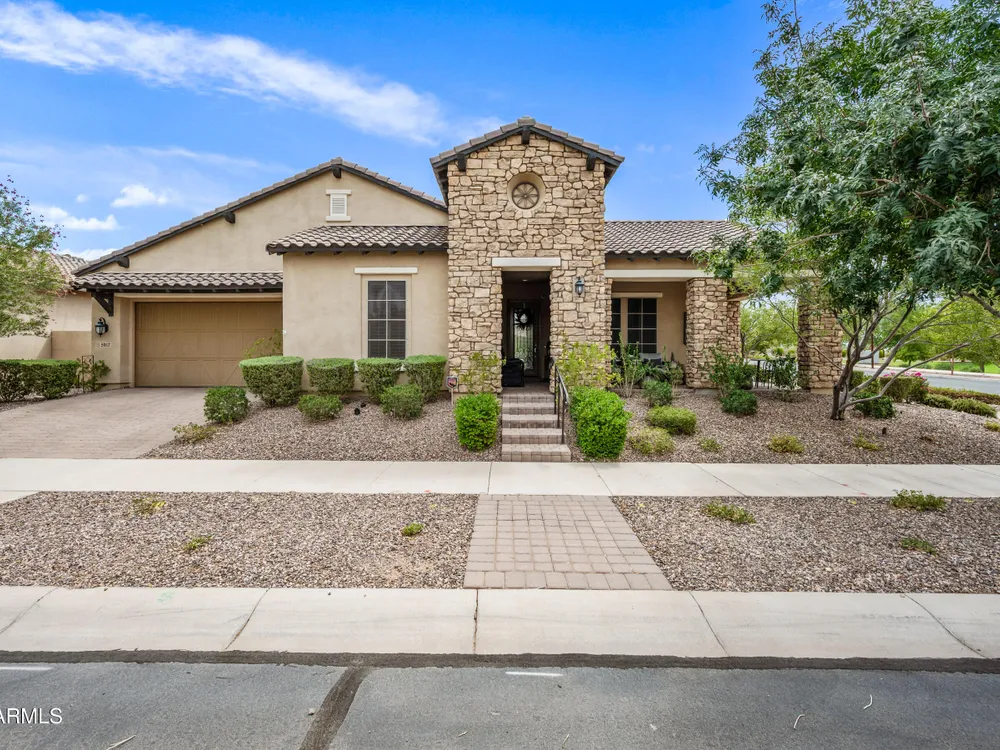Beautifully upgraded single-story home in the highly sought-after 55+ community of Encore at Eastmark. Open Ballet floor plan with wood-look tile, plantation shutters, and abundant natural light from triple sliding doors with motorized shades. Chef's kitchen features white cabinetry, granite countertops, large island, coffee bar, and walk-in pantry. Two ensuite bedrooms and den/third bedroom, 2.5 baths, office, and remodeled bathrooms with spa-like primary suite. Backyard oasis with sparkling pool, water feature, travertine patio, pergolas, and fruit trees. Oversized 2.5-car garage with epoxy floors and storage. Premium corner lot with wraparound porch. Encore amenities include pickleball, tennis, bocce, fitness, billiards, library, and vibrant social events.