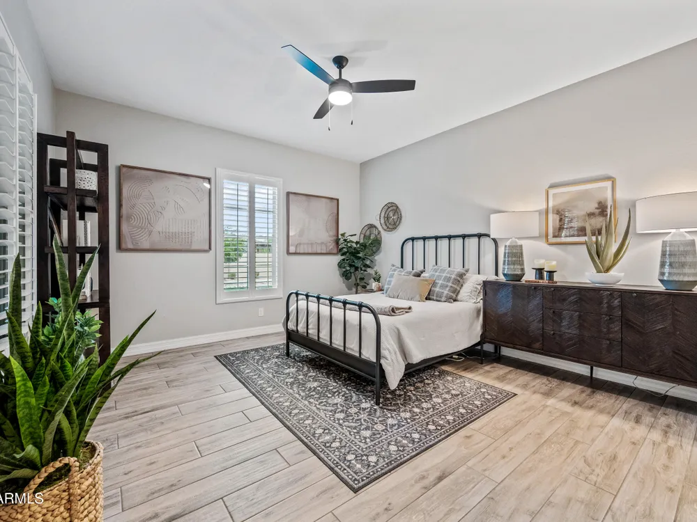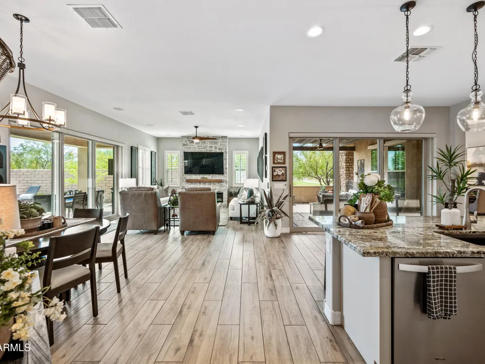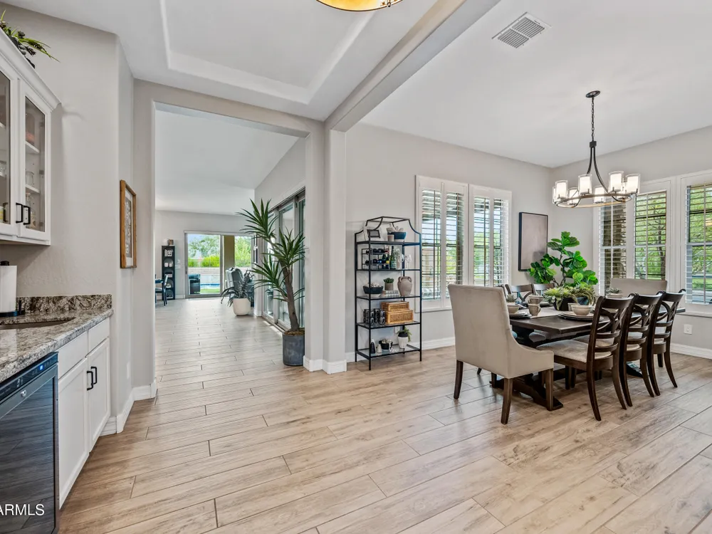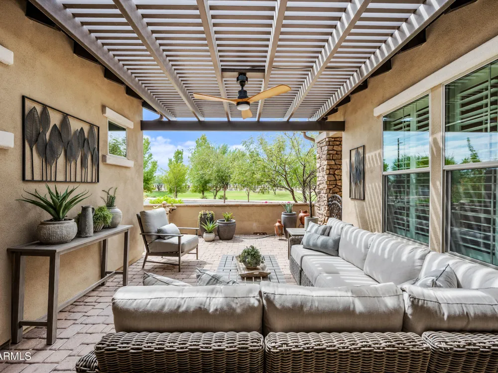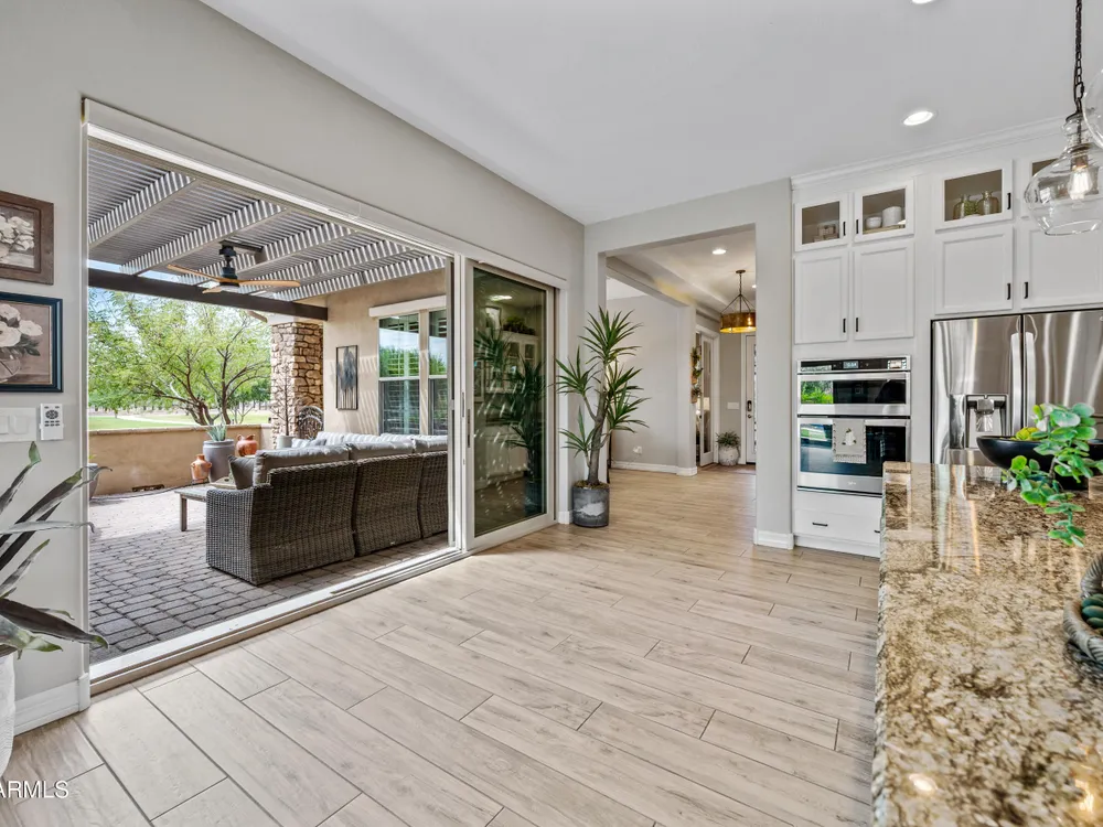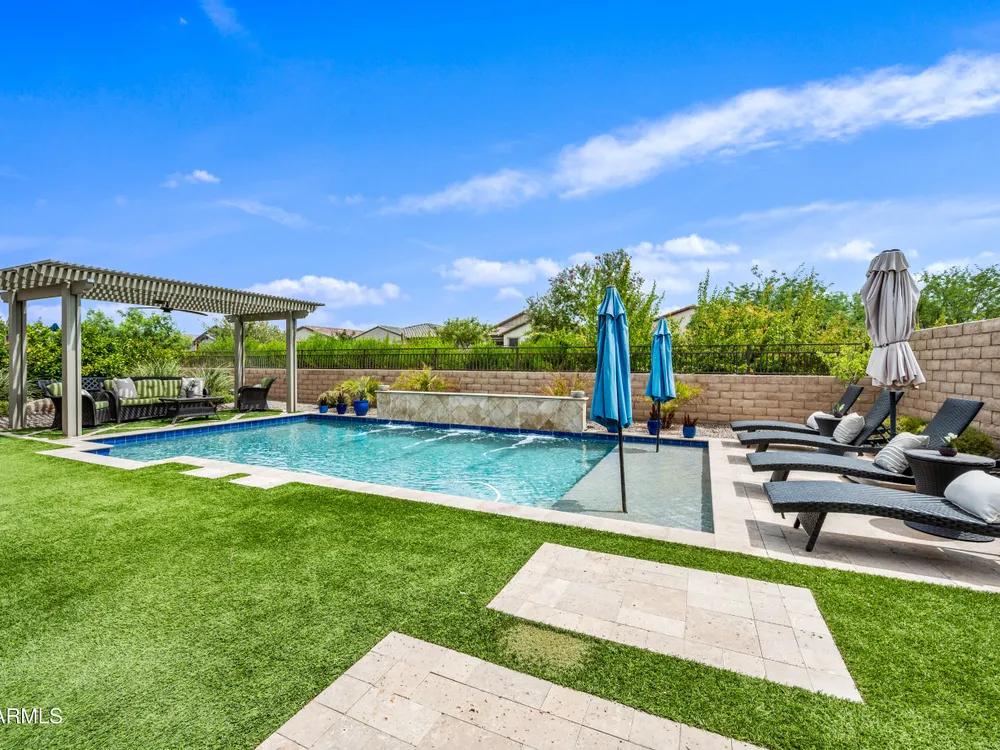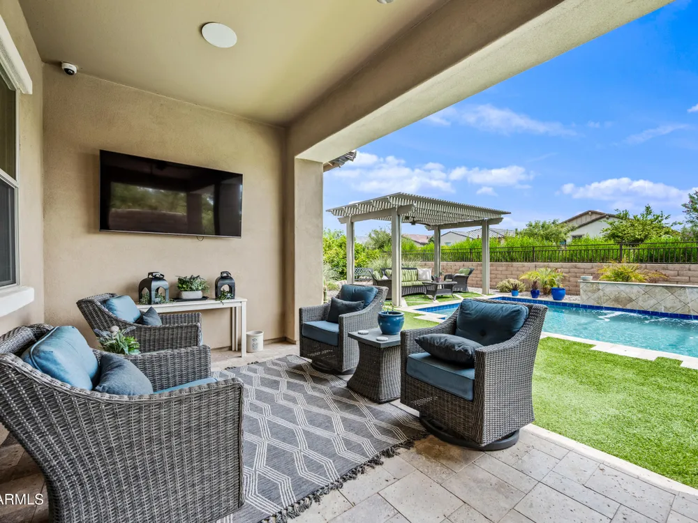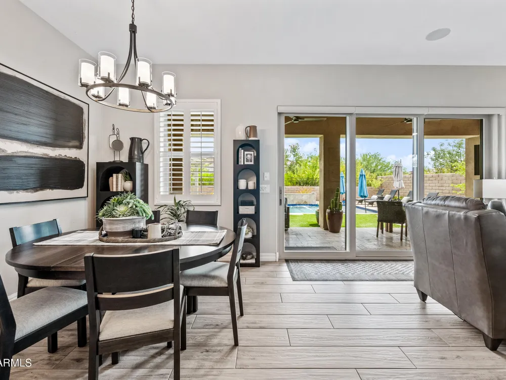 Beautifully upgraded single-story home in the highly sought-after 55+ community of Encore at Eastmark. Open Ballet floor plan with wood-look tile, plantation shutters, and abundant natural light from triple sliding doors with motorized shades. Chef's kitchen features white cabinetry, granite countertops, large island, coffee bar, and walk-in pantry. Two ensuite bedrooms and den/third bedroom, 2.5 baths, office, and remodeled bathrooms with spa-like primary suite. Backyard oasis with sparkling pool, water feature, travertine patio, pergolas, and fruit trees. Oversized 2.5-car garage with epoxy floors and storage. Premium corner lot with wraparound porch. Encore amenities include pickleball, tennis, bocce, fitness, billiards, library, and vibrant social events.